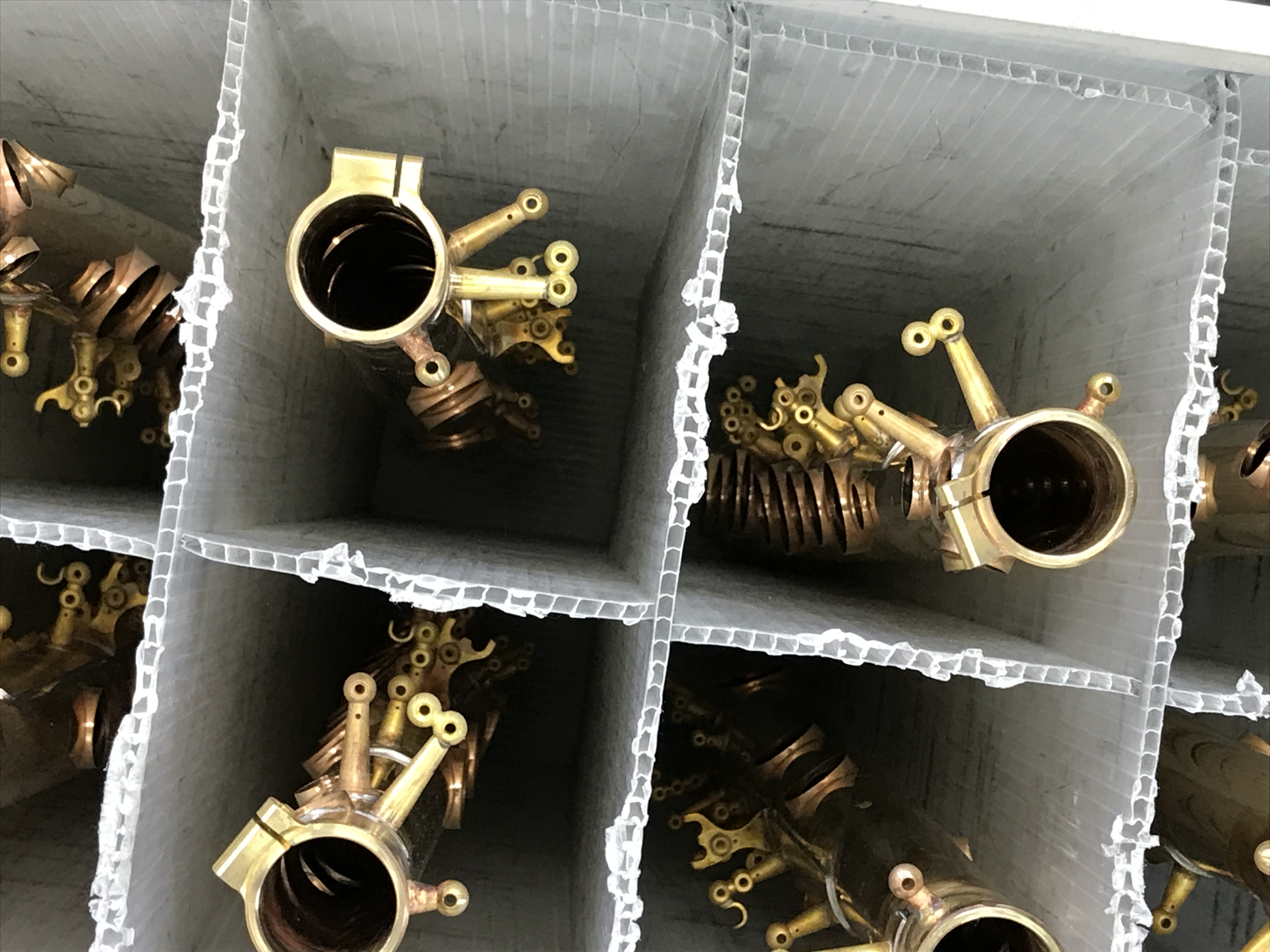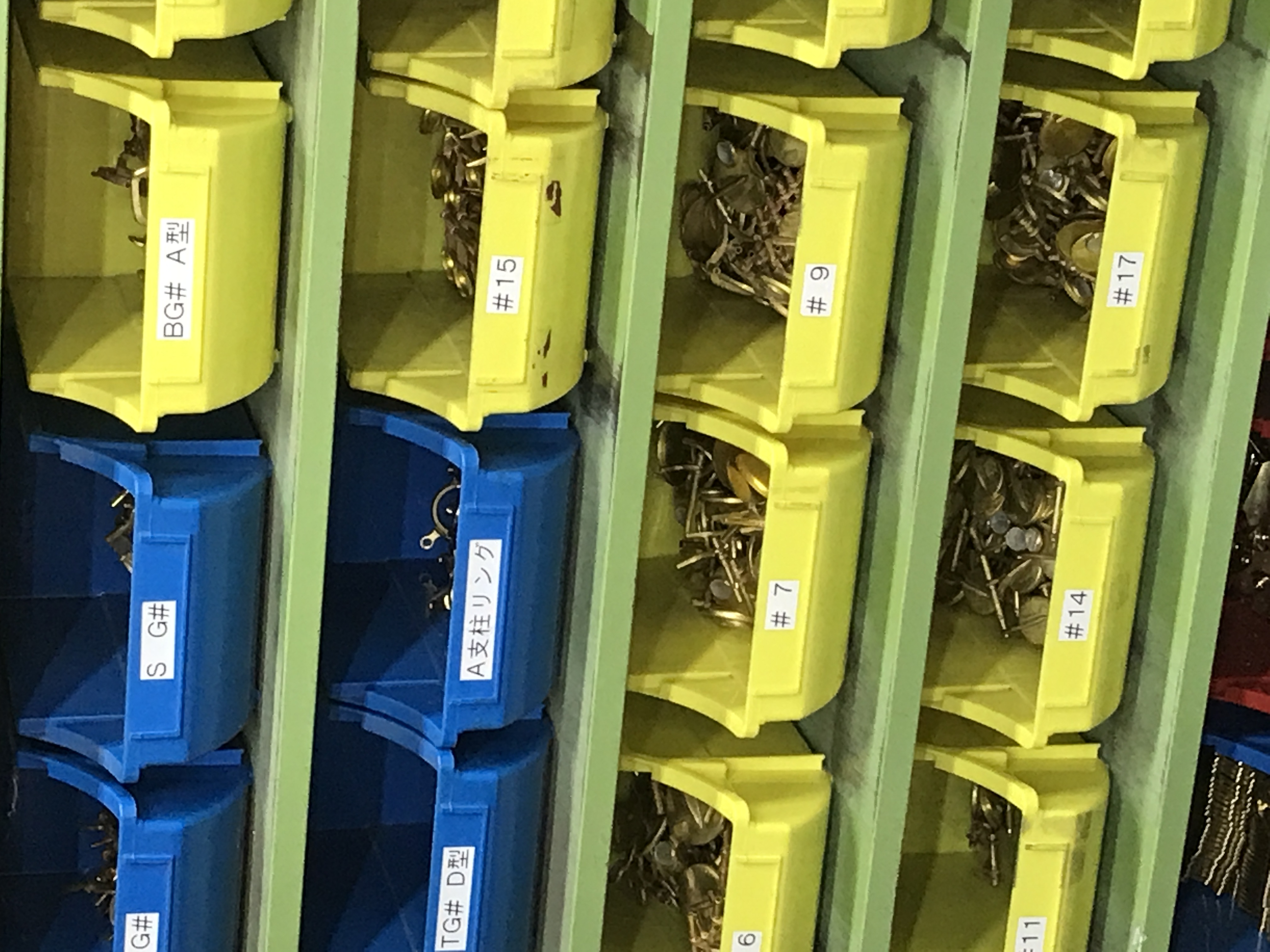 | 先ほどの飛び出したポストの軸をグラインダーで削ります。少しでも出ていると台座を精度よくハンダ付けできません 。 | テナー用3番、アルト用3番などの番号が振ってあり、それぞれの箱の中にキィをストックしていきます 。 |
