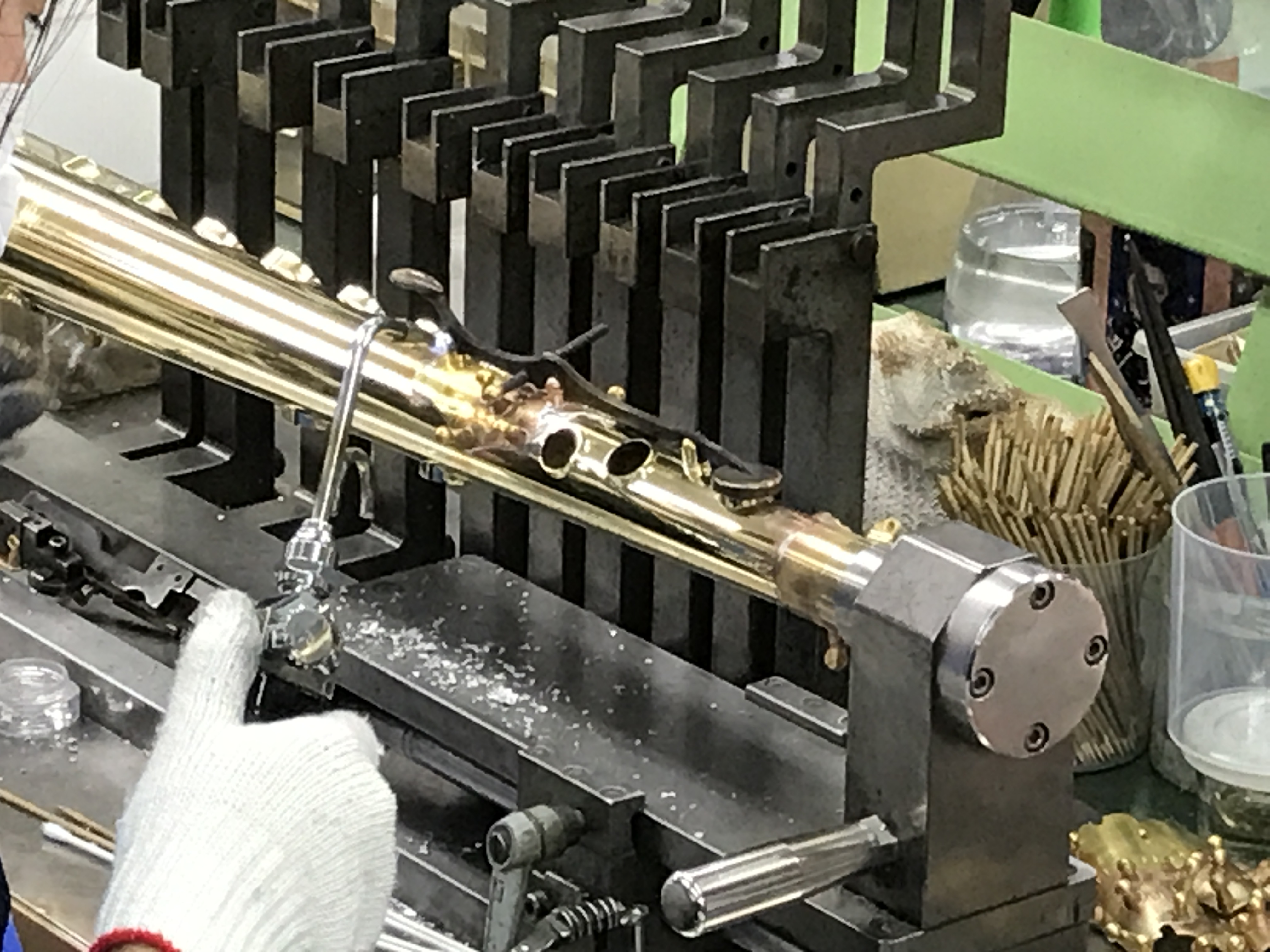 | 白い保護テープが貼ってあります。作業中にキズを付けてしまわないように、必ず保護テープを貼った状態で作業 。 | タンポ合わせ、バランス合わせ、キィタッチの調整、楽器に命を吹き込む最後の組み上げ工程 。 |
