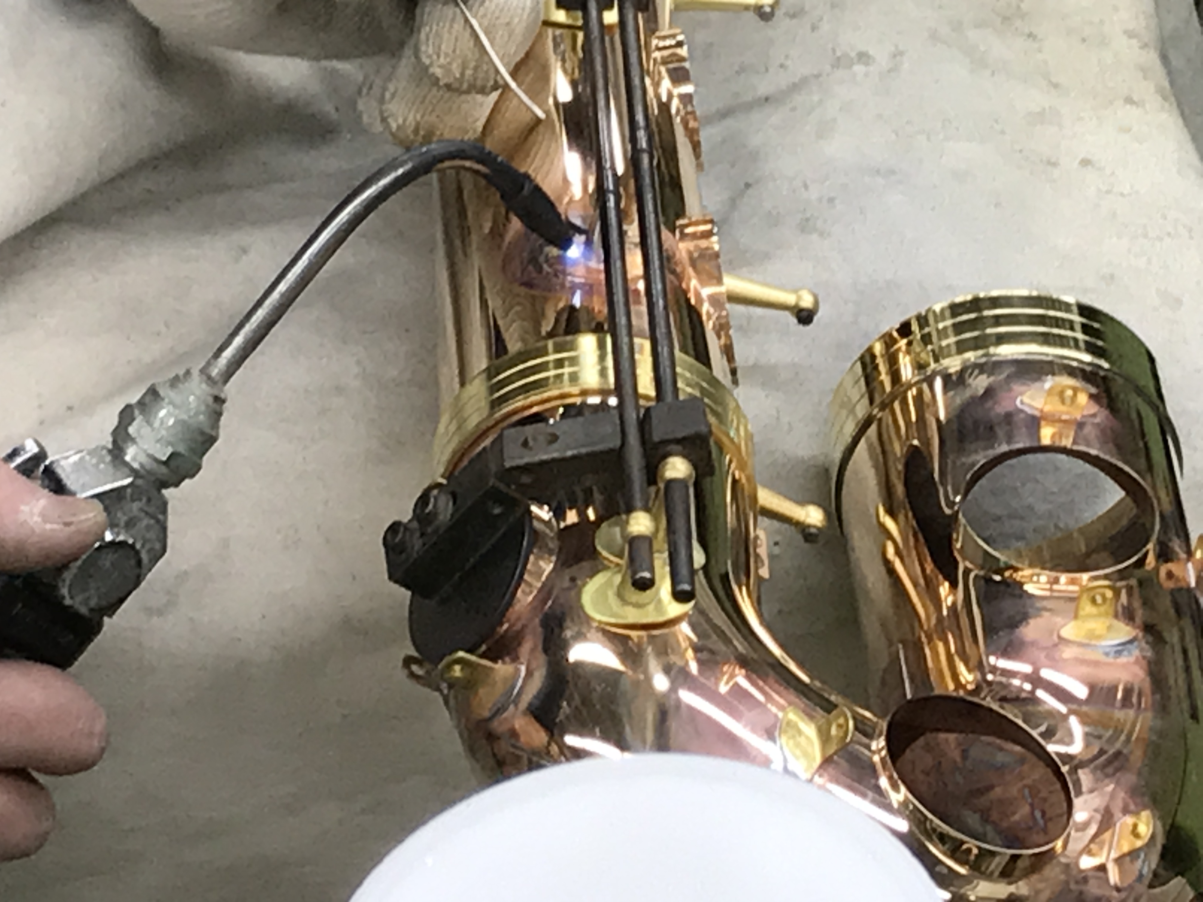 | キィの位置も確認し、トーンホールにキィカップがピッタリと合うように常に確認が必要です 。 | キィカップに専用の治具を当て、細く青い炎でハンダ付けをします 。 |