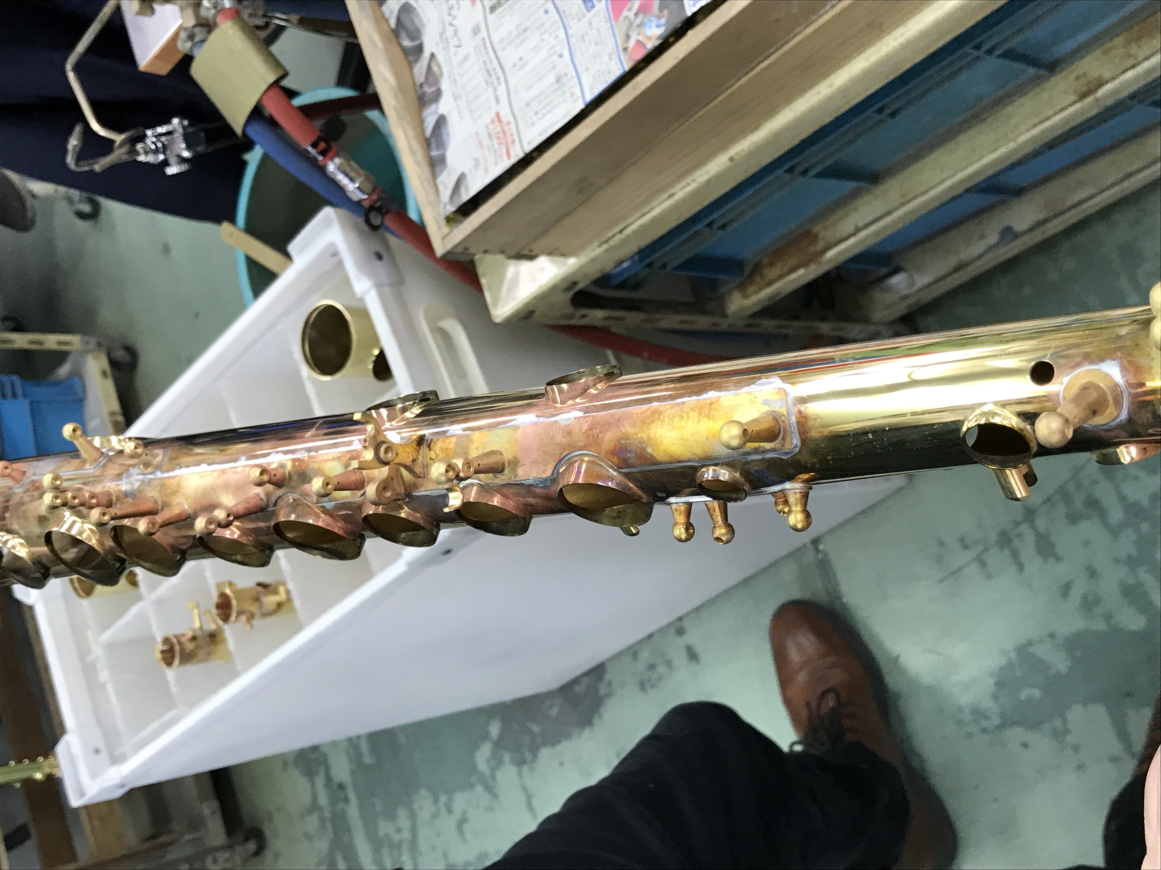 | トーンホールとキィポストがセットされると急に楽器っぽくなります 。 | 2番管とU字管が組み上げられたバリトンサックス、大きなトーンホールが多数開いています 。 |