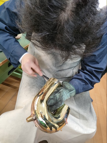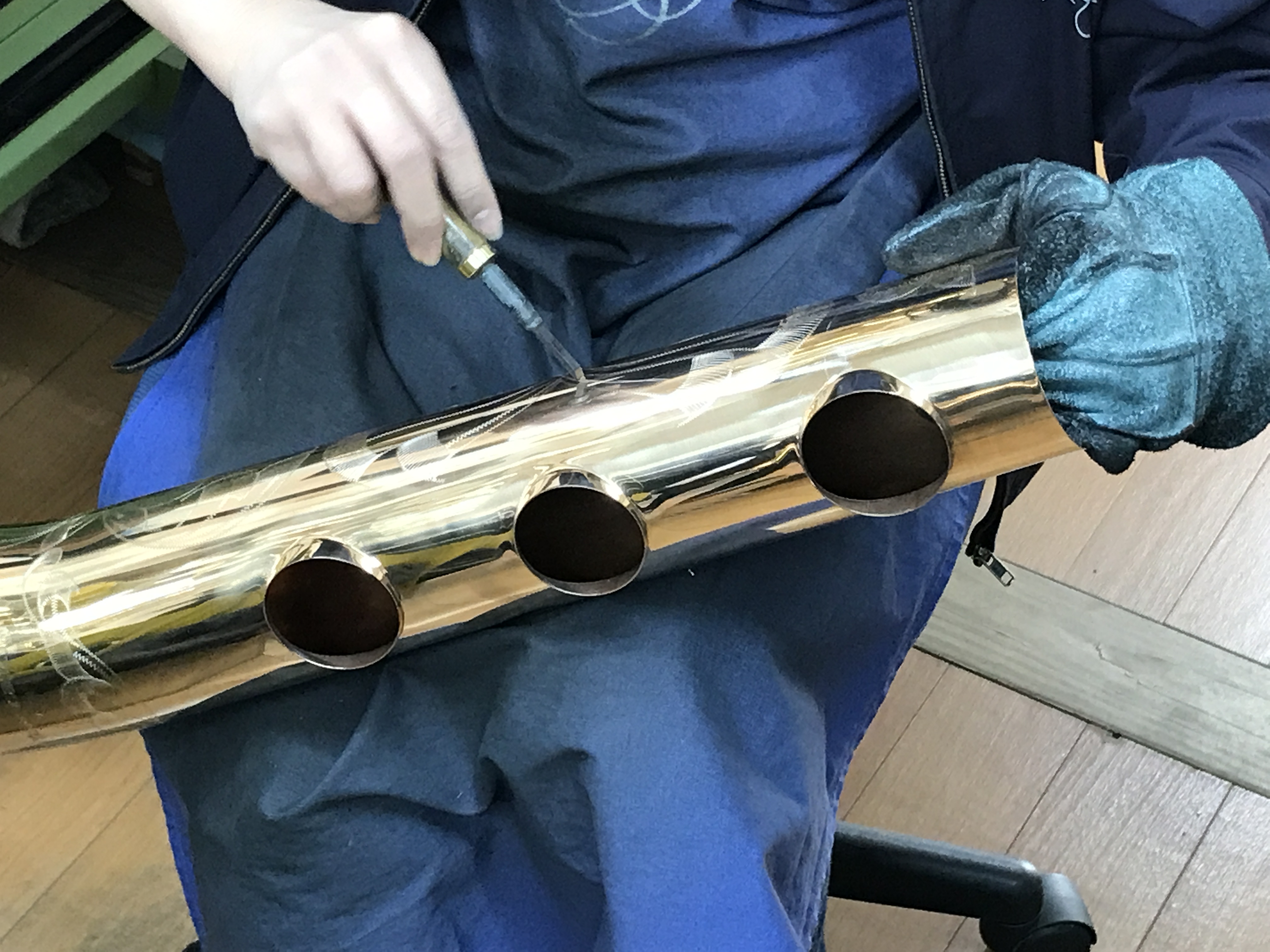 | 引っ張り上げたトーンホールを平らに均す作業。タンポの閉じ具合や音程にも影響する重要な作業 。 | 溶接したU字管の接合部分を削って均す作業、つなぎ目が分からない程の丁寧な仕事を行っています 。 |