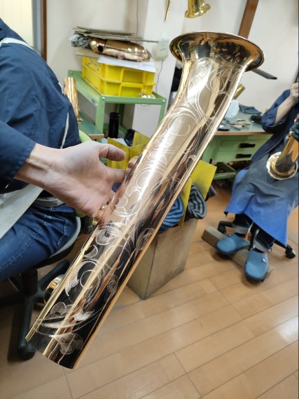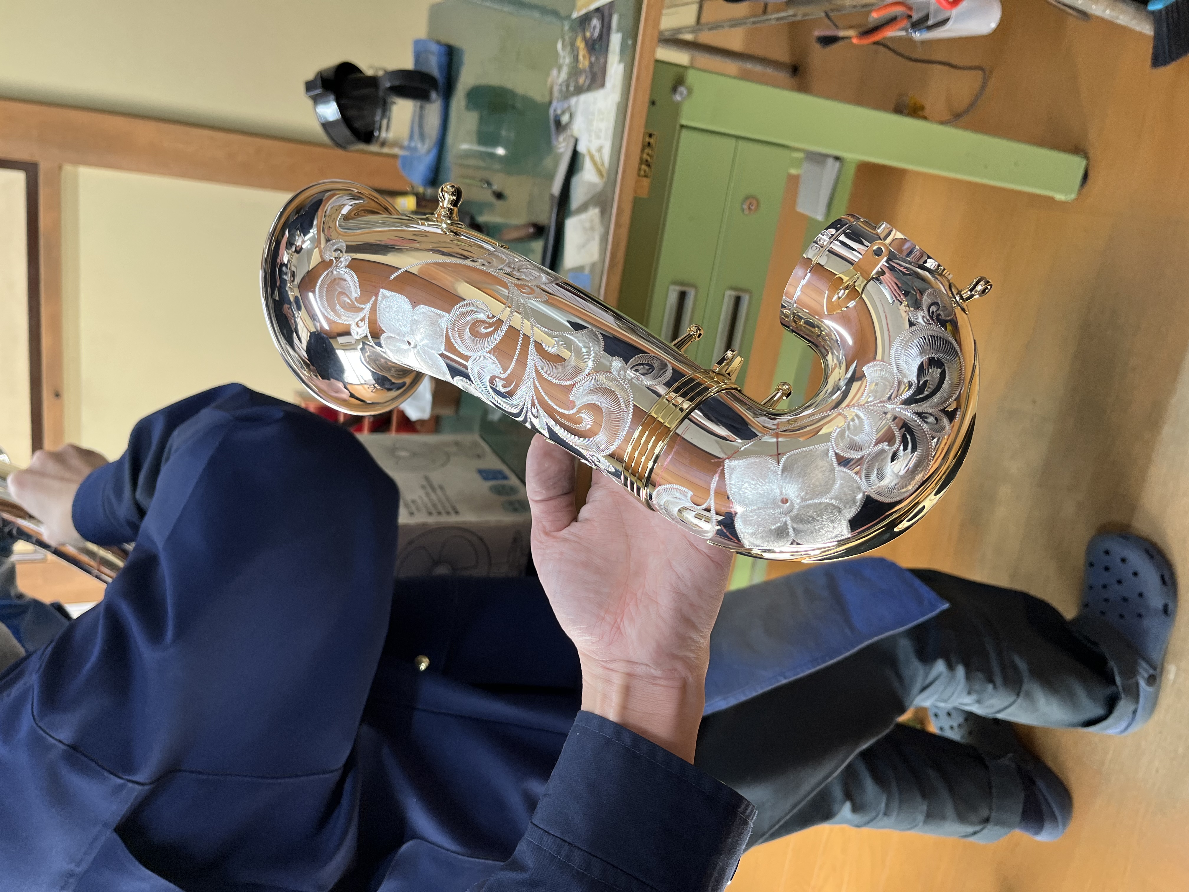 | バリトン1本完成です!手作業なので1本1本少し模様が違って自分の楽器に愛着が湧きます 。 | U字管にも彫刻、客席から良く見えるとこの彫刻は大切ですよね 。 |