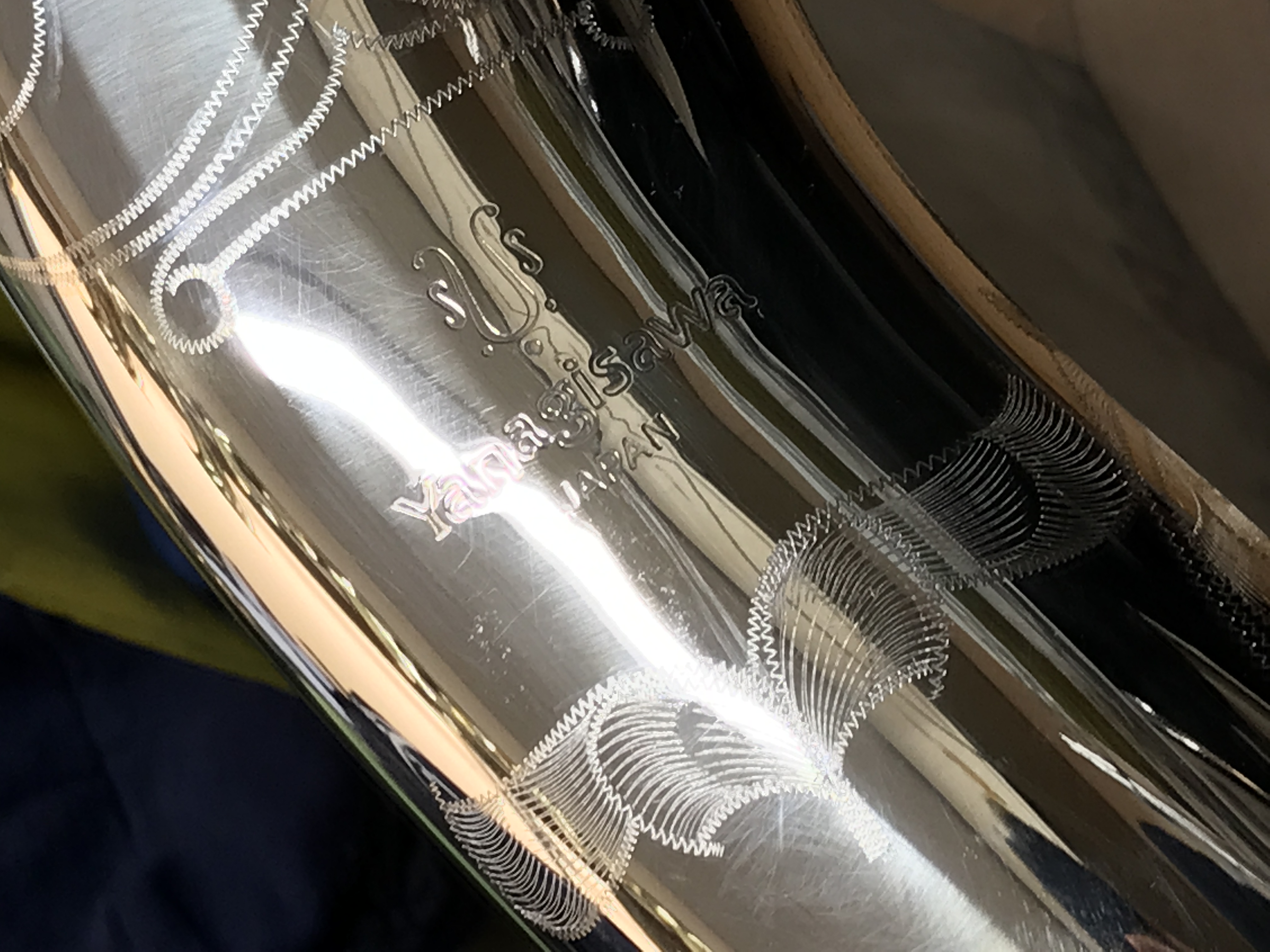| Yanagisawaのロゴは刻印、その周りは手彫り彫刻 。 | 銀製や金メッキの楽器は専任の彫刻師さんが彫っています、立ち作業と座り作業がどちらもあるそうです 。 |