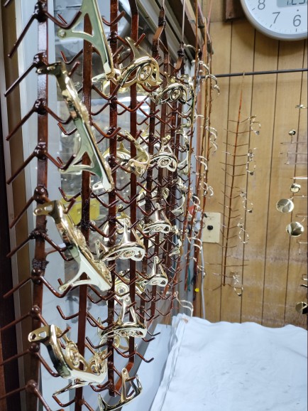 | この炉の中で乾燥させることでラッカーが強く、剥がれにくくなります。 | キィガードも1つ1つワイヤーに掛けてしっかりと乾燥させて次の工程へ 。 |