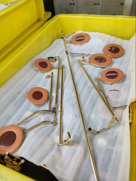 | 手前のようなくすんだキィカップが職人さんの手でピカピカに!いつも見る姿になりました 。 | バリトンサックスなどの大きな管体はバフに当てて回していくのも大変そう 。 |