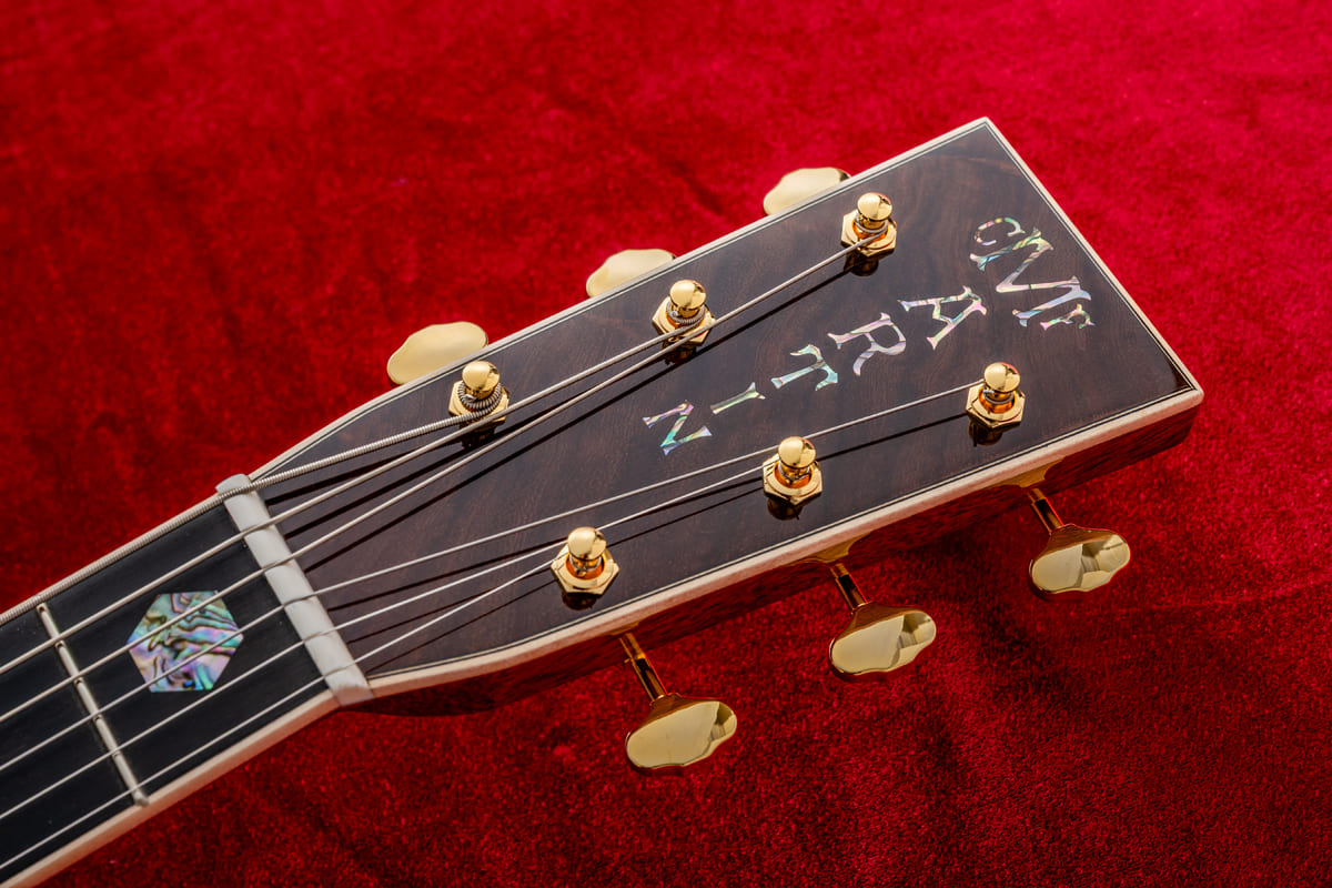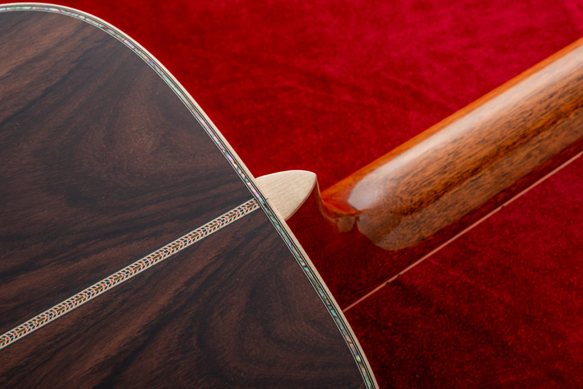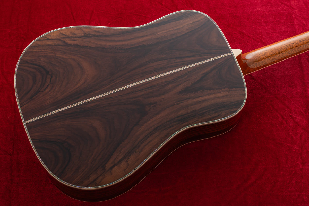 木材の魅力を活かしながらビンテージスタイルを意識した特別なD-45。トップは最上位グレード(プレミアムグレード)のシトカスプルース、サイド・バックには色味の綺麗なローズウッドを板目に切り出す事で躍動感のある木目が現れ美しい見た目を実現するWild Grain East Indian Rosewoodを使用。ともにNAMM SHOW会場現地にて当社スタッフが選定した非常にきれいな木材となっています。