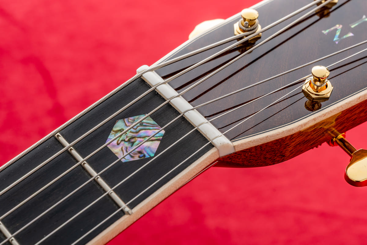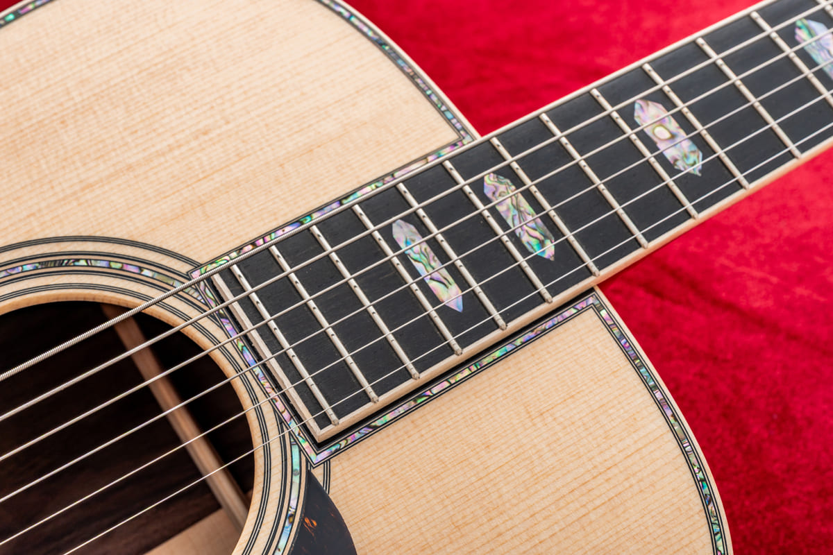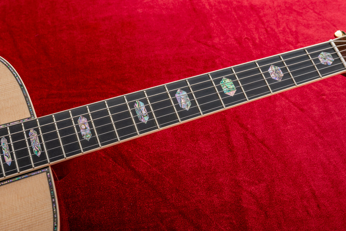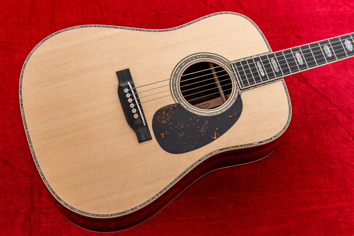 木材の魅力を活かしながらビンテージスタイルを意識した特別なD-45。トップは最上位グレード(プレミアムグレード)のシトカスプルース、サイド・バックには色味の綺麗なローズウッドを板目に切り出す事で躍動感のある木目が現れ美しい見た目を実現するWild Grain East Indian Rosewoodを使用。ともにNAMM SHOW会場現地にて当社スタッフが選定した非常にきれいな木材となっています。