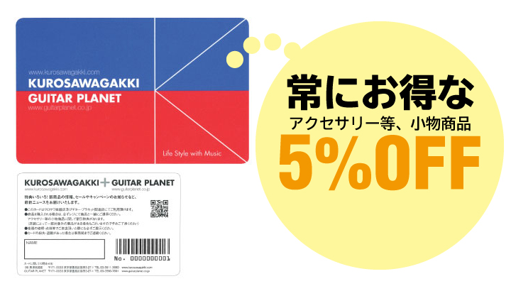 - クロサワ楽器店及びギター・プラネットの全ての関連店舗にて商品を購入されるときに、アクセサリー等の小物商品に関して割引特典があります。