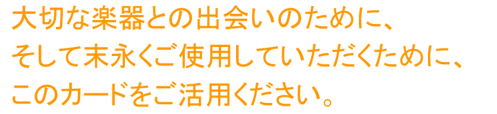 (割引特典は原則として店頭のみのサービスとさせていただきます。また、店舗によって一部対象外の商品がある場合もございますので予めご了承ください) - このカードでは、購入された楽器はすべてデータ管理されますので、アフターサービスにご活用いただけます。楽器の修理・点検等でご来店いただいた際にも必ずご提示ください。