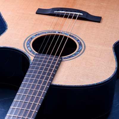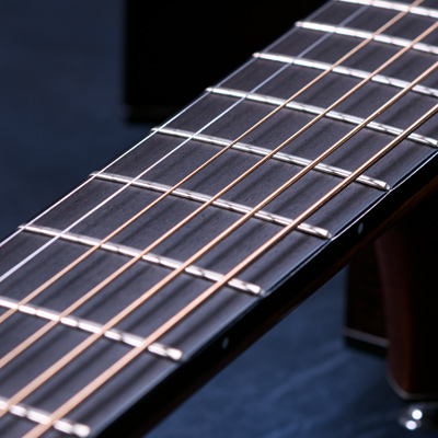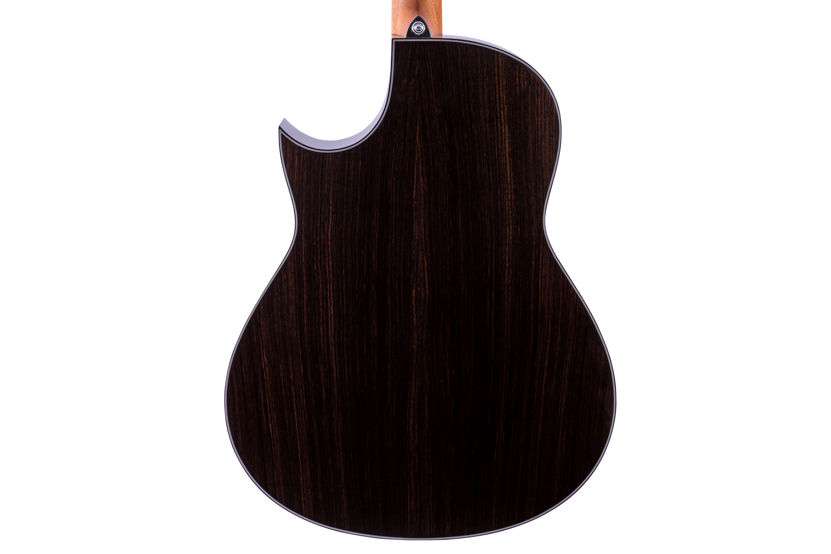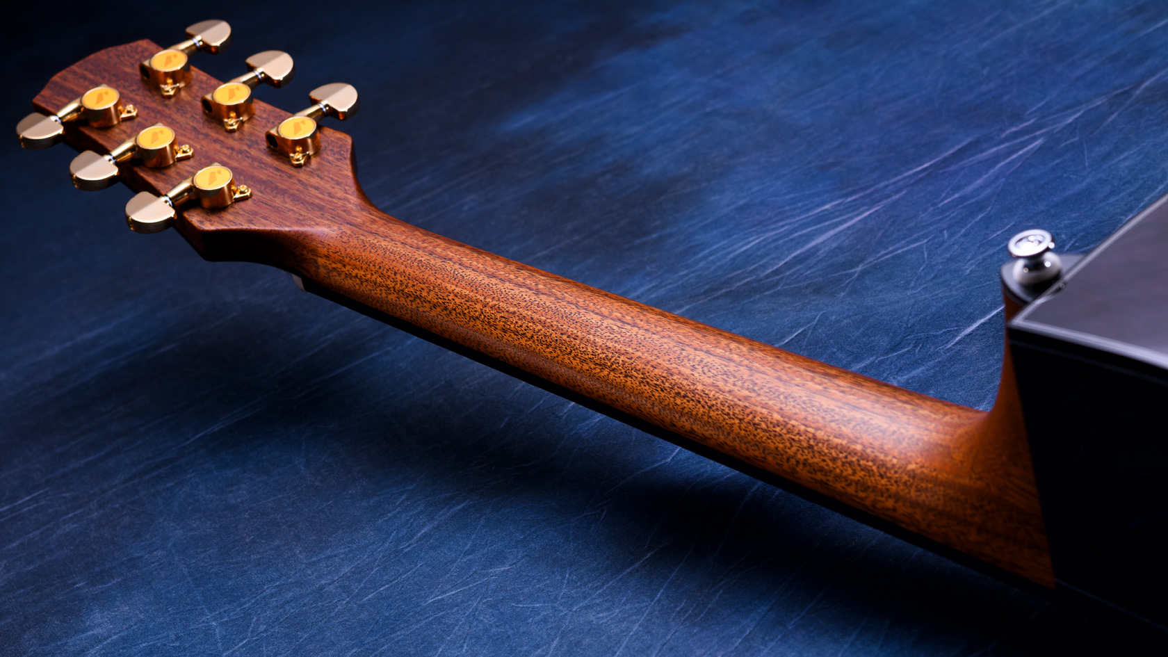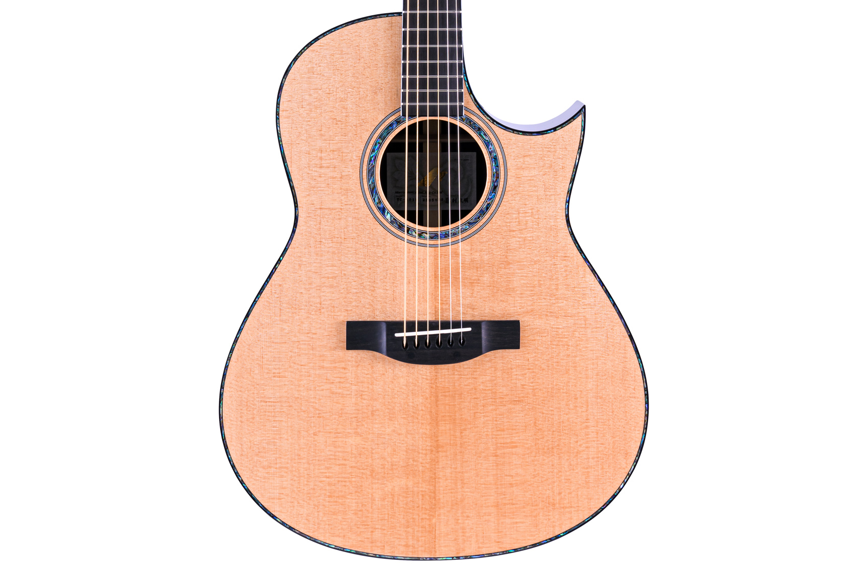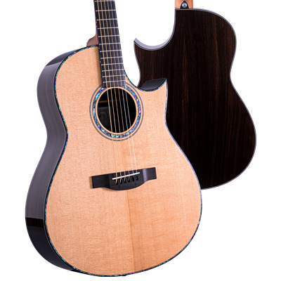 約43mmの細めのネックシェイプと、指板最終フレットよりも高い位置まで深くカーブを描く特徴的な フローレンカッタウェイ により、ローポジションの握りやすさとハイポジションへのスムーズなアプローチを両立。さらに、ボディ厚が約9cm〜10cmと比較的薄めで抱えやすい Thin クラシカルオーディトリアムボディ を採用し、演奏性にも優れています。