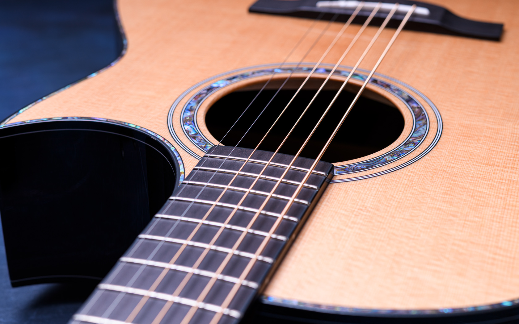 縁取りにアバロンの装飾を追加。ヘッドのインレイ、サウンドホールロゼッタと併せて一際豪華な外観になっています。