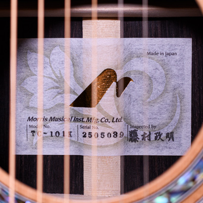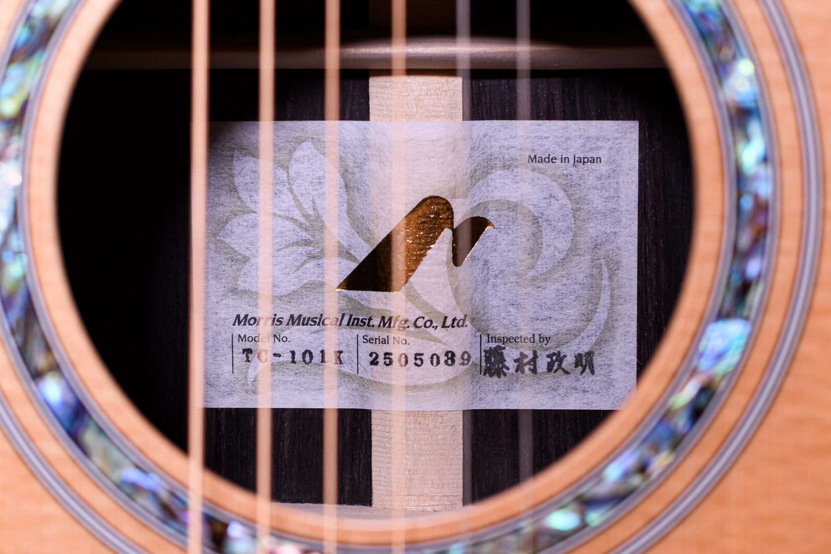 Morris フィンガースタイルモデルのカスタムオーダー品。握りやすいネックと抱えやすいボディシェイプ、生音、装飾にも拘った仕様。クリアでサウンドバランスに優れ、ほのかに混ざる鈴鳴り。当社スタッフが Morris 工場へ足を運び、時間をかけて選び抜いた美しい杢目持った木材を使用しているモデルですので外観からも自信をもっておススメ出来るモデルです。