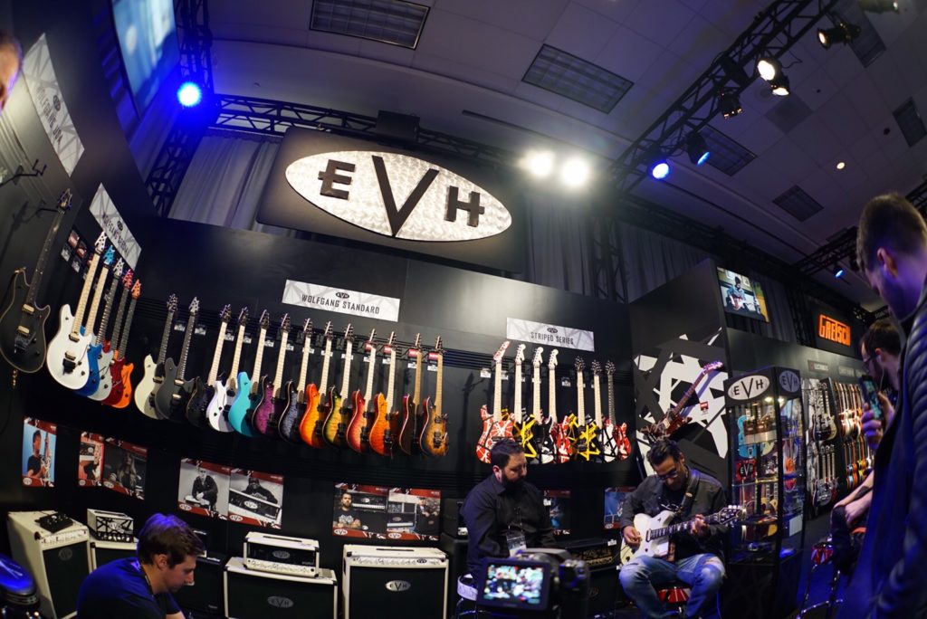 まず、こちらはEVHブース。EVHモデルのギターやアンプがずらりと並んでいます。ちなみにエディは先日1/26に64歳の誕生日を迎えました!