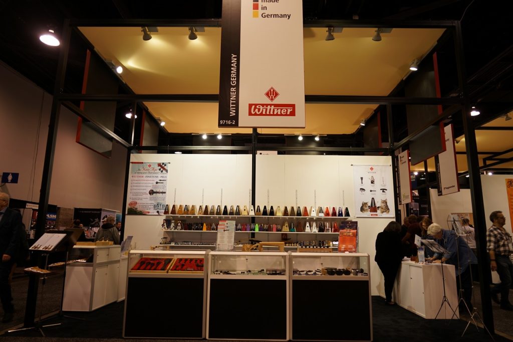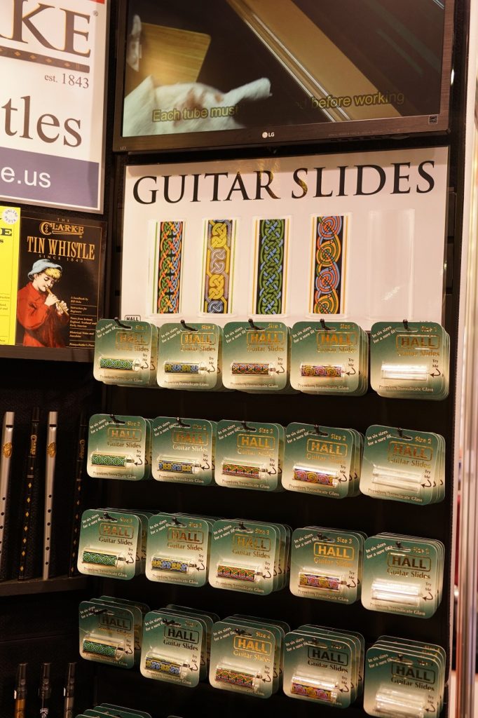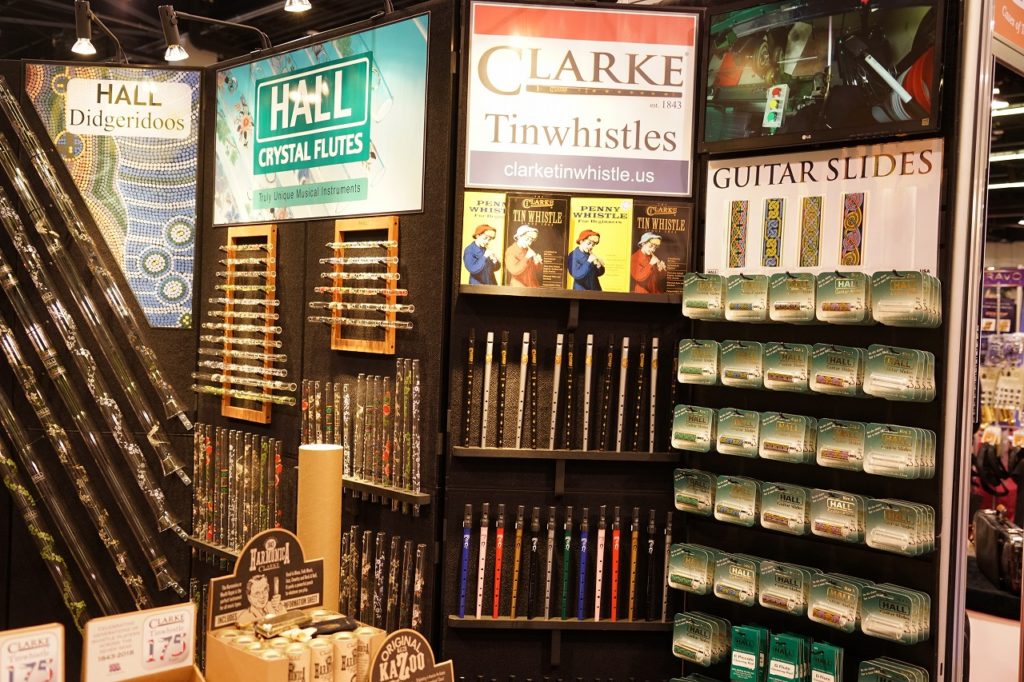 こちらはクリスタル・フルートの「HALL」のブース。「Clarke」ブランドのティン・ホイッスルやアイリッシュなデザインのギター用スライドバーもディスプレイ。