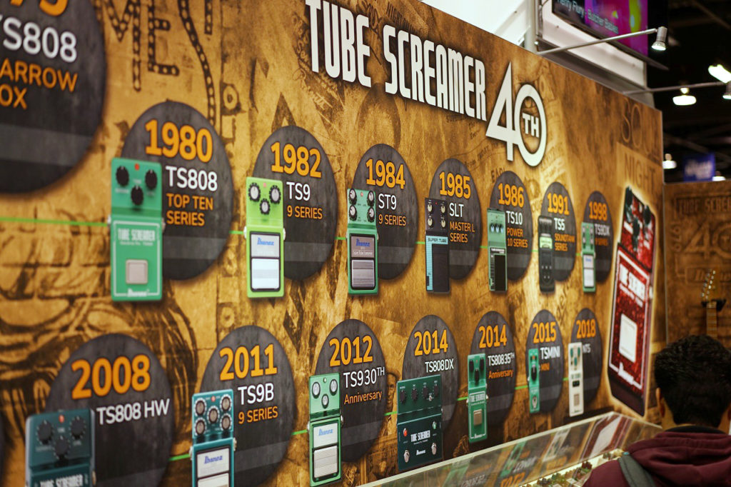 こちらはIbanezブースにあったチューブ・スクリーマー40周年を記念したチューブ・スクリーマー年表。今回のNAMM SHOWでは新たにIbanezとVemuramとのコラボモデル「TSV808」が発表された。
