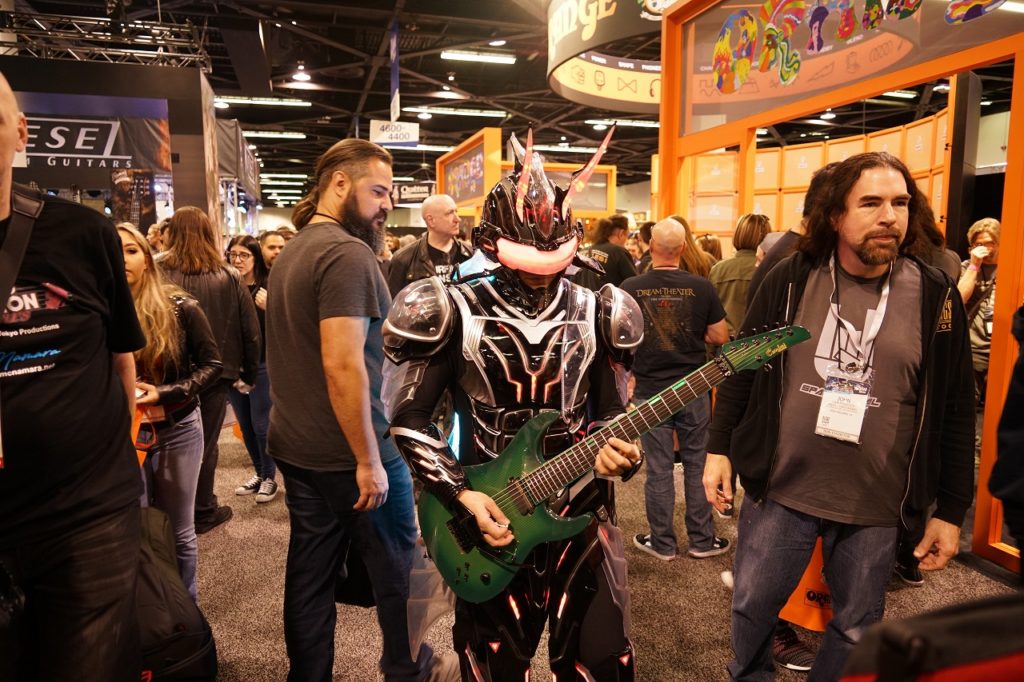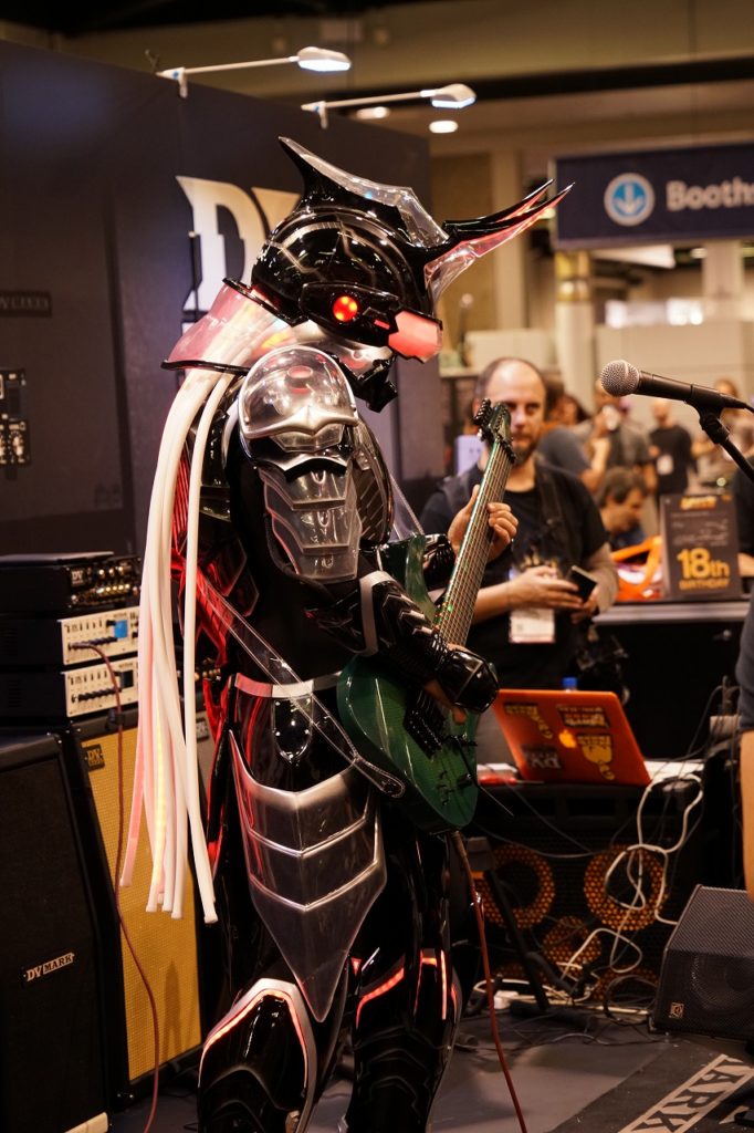 NAMM会場で何度か見かけたこの異様な出で立ちのギタリストは西暦2300年の未来からやって来たというサイボーグ・ギタリストEdiee Ironbunny。