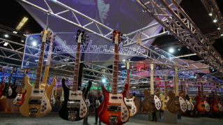 Rickenbackerのブースは壁面にギターをディスプレイするのではなく、広いブース内に頭上からリッケンバッカーのギター/ベースが吊るされているまるでぶどう畑のようなスタイル。 Rickenbackerエレ...