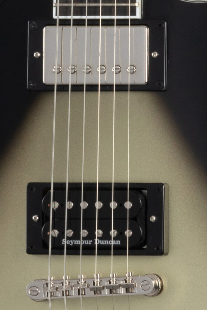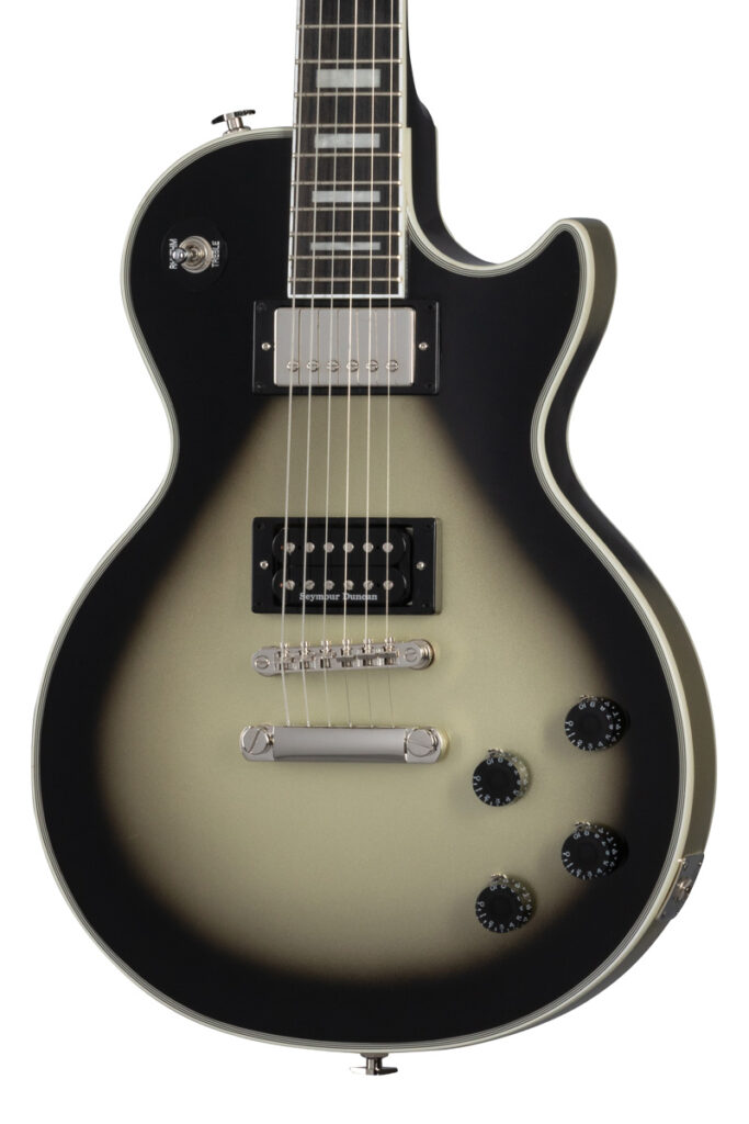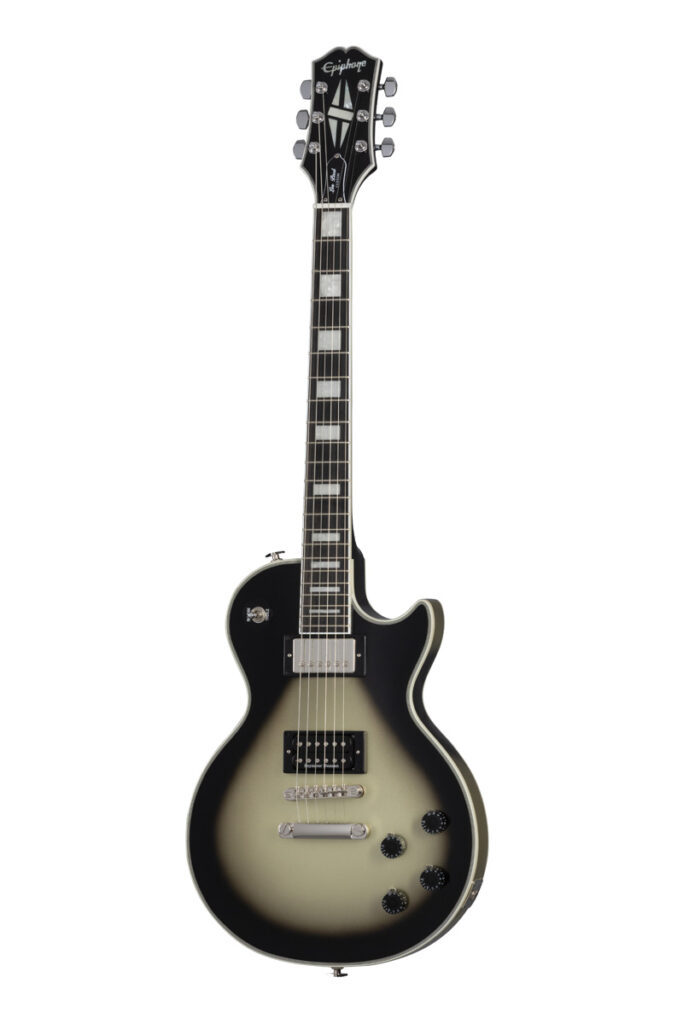 バインディングの施されたマホガニー・ボディにメイプル材が貼られ、ネックデザインは アダム・ジョーンズ・カスタム・プロファイルが採用されています。バインディングの施 された3ピース・メイプル・ネック、エボニー指板等、充実の仕様内容を誇ります。ネッ クポジションには上下逆さにマウントされた Epiphone ProBucker™ Customハムバッカー 、ブリッジには™ Seymour Duncan® Distortionが搭載され、CTS®ポテンショメーターとOrange Drop®コンデンサが結線されています。ボディバックにはアーティスト名と作品名を記したコントロール・プレートがマウントされています。アダムが愛用するオリジナルの1979 Gibson Customシルバーバーストへのオマージュとしてアンティーク・シルバーバーストで仕上げられ、Protectorハードシェルケースが付属となります。