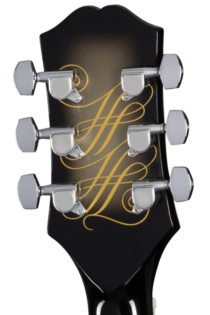 エピフォン・アダム・ジョーンズ・アート・コレクションは、シルバーバースト・フィニッシュで仕上げられた7種類のレスポール・カスタム・モデルで構成され、各モデルのボディバックにはそれぞれ異なる7種の芸術作品のデザインがあしらわれています。
