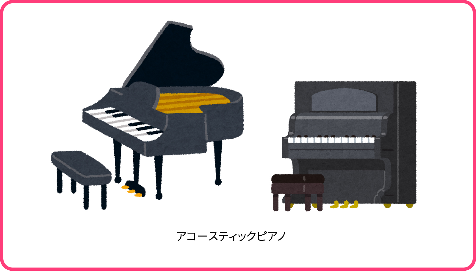グランドピアノやアップライトピアノをアコースティックピアノと呼びます!アコースティックピアノには弦や響板が搭載されており、弦の振動をボディに共鳴させて音が鳴っています。