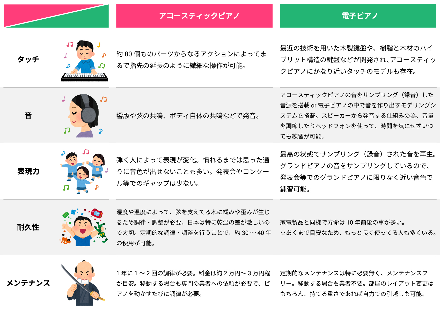 ピアノを始める時、まず最初に迷うのが電子ピアノにするかアコースティックピアノにするか…。そもそも電子ピアノとアコースティックピアノって何が違うの?気になる疑問にお答えします!