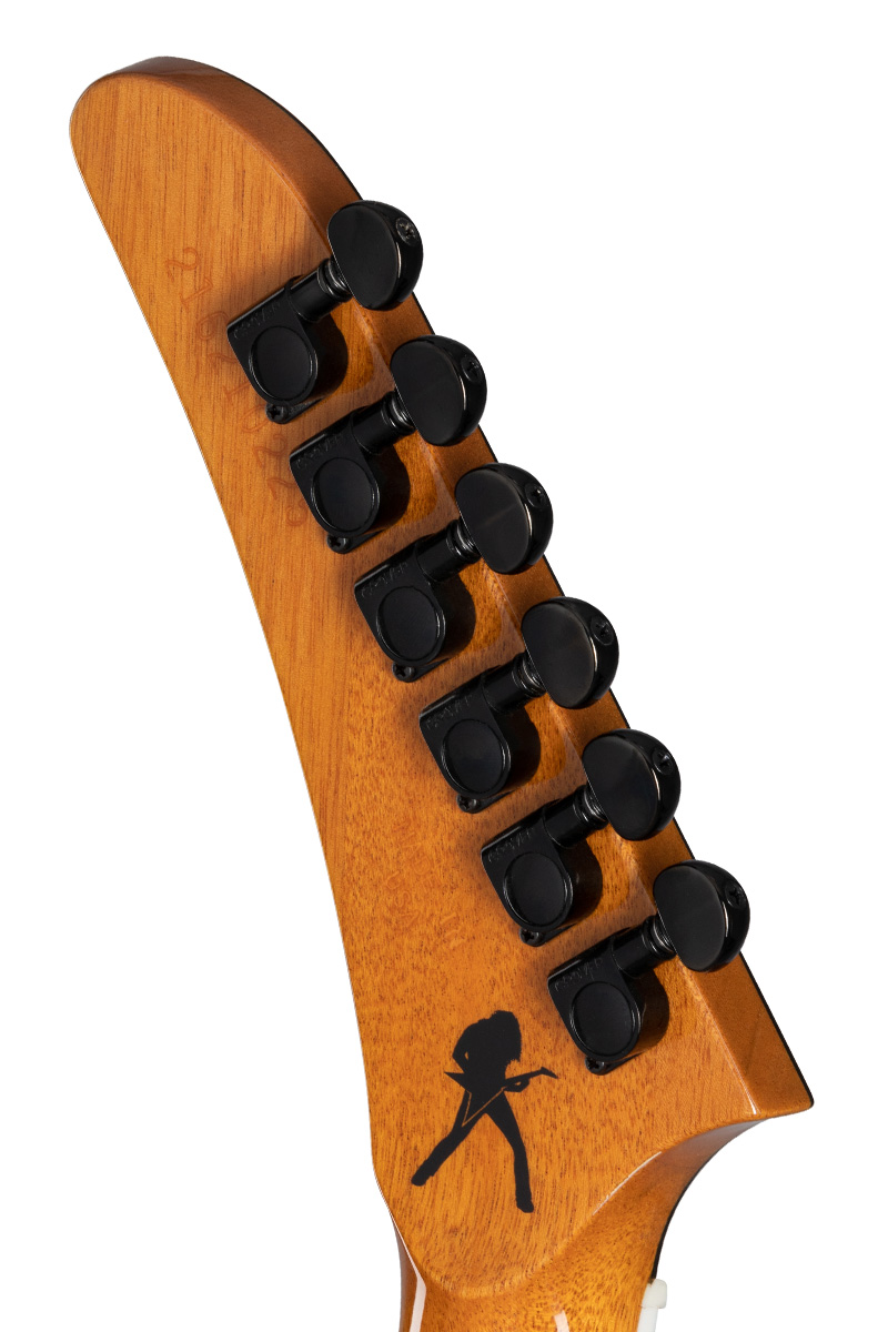 25.5インチ・スケールのマホガニー・ネックは、コンパウンド・フレットボード・ラジアス(平坦度が高い)を持つエボニー・フレットボードに24ミディアム・ジャンボ・フレットとマザー・オブ・パール “teeth” インレイ、そしてキドニー型ボタンの Grover® Mini Rotomatic® チューナーと Graph Tech® ナットが採用され、エクスプローラー・スタイルのヘッドストック仕様となっています。