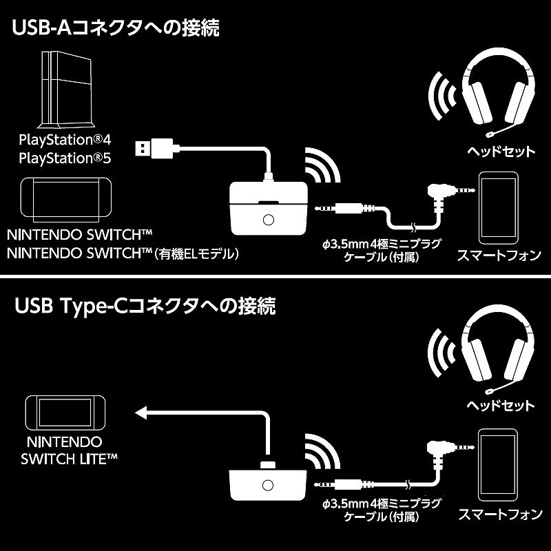• USBアダプターはデジタルミキサー機能付きで、ヘッドセットからゲーム音と通話音声を同時に聞くことができ、チャットアプリなどで通話しながらのプレイが可能です。