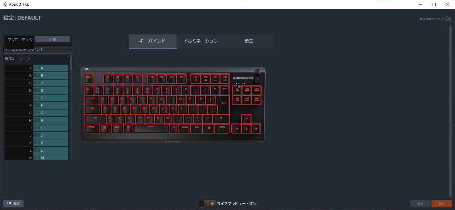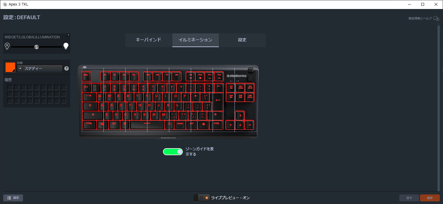 専用ソフト「SteelSeries GG」でイルミネーションの明るさやパターン、キーバインドの変更やマクロの設定も出来ちゃいます!見やすい画面で直感的に設定できます。