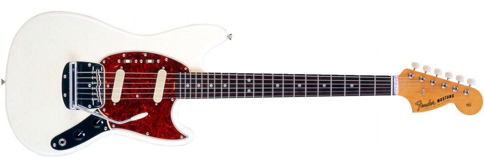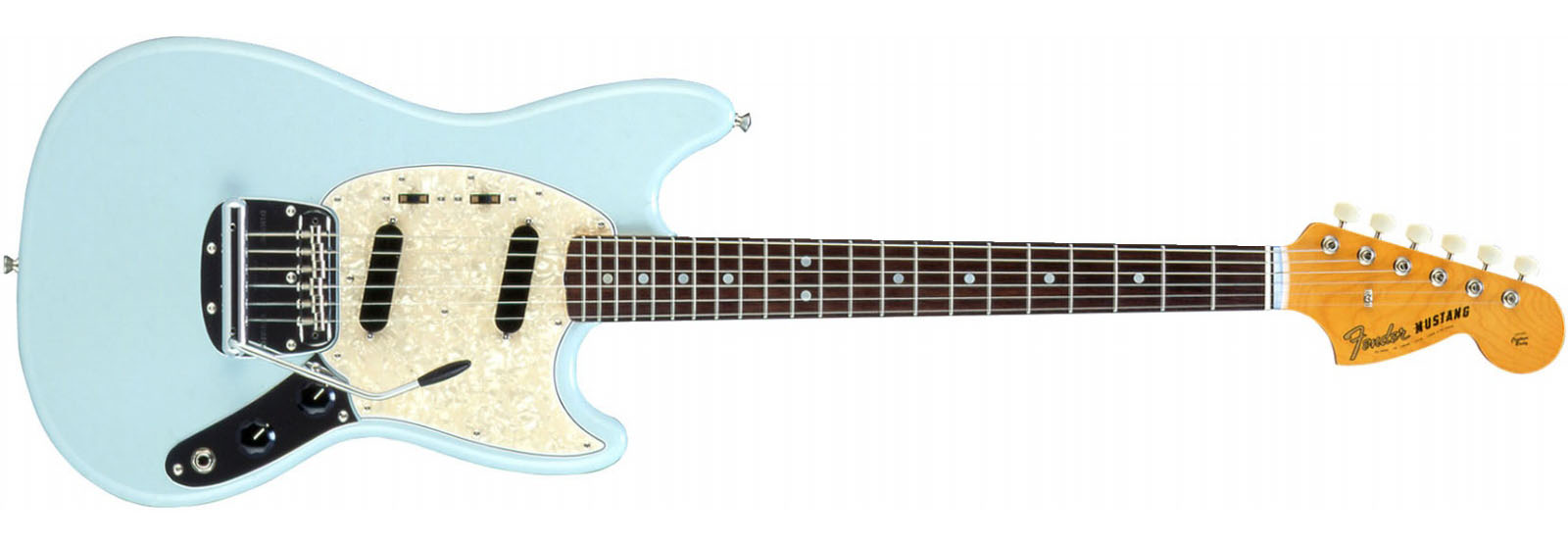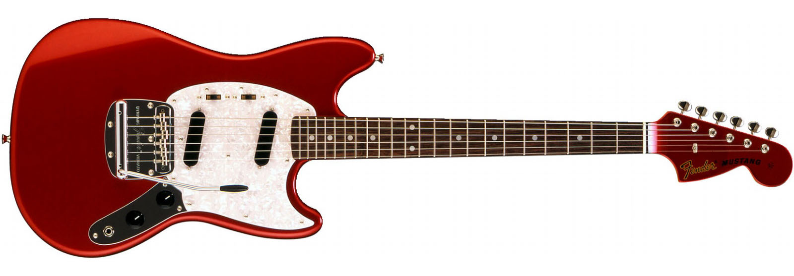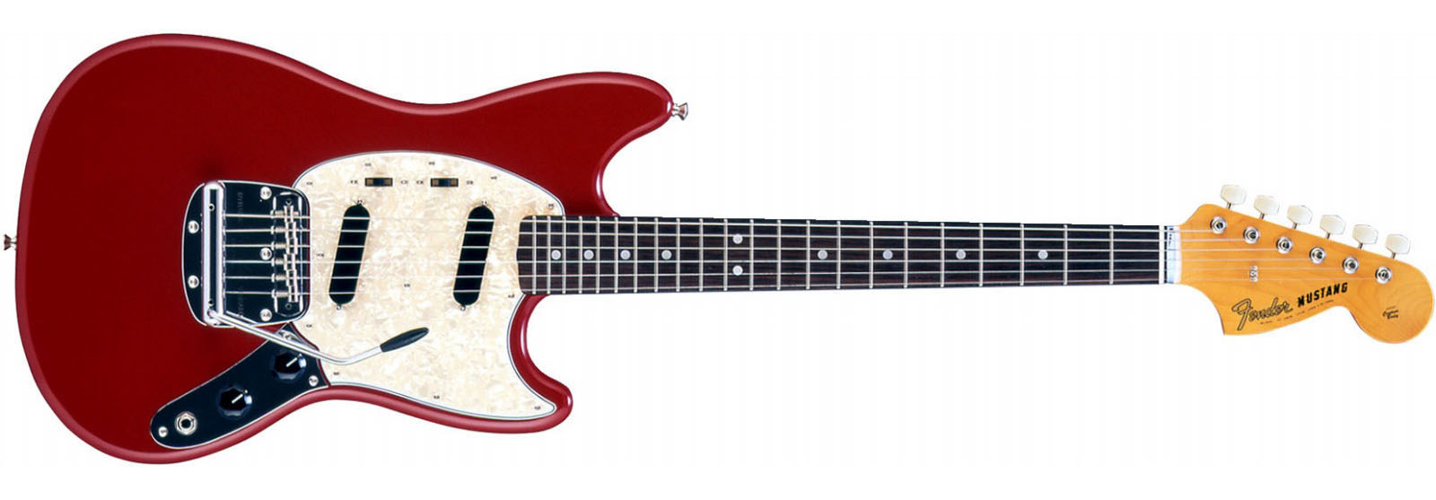 ヴィンテージに倣いポプラ材を採用し、パテントナンバー入りデカール、エイジドボタン・シャーラー糸巻き、USポット&USノブ、ピックガード、グレイファイバーボトム・アルニコマグネット・ポールピース、トレモロベースプレート、そして特徴的な形状のトレモロアームなど、可能な限りオリジナルを再現した'65バージョン・ムスタング。