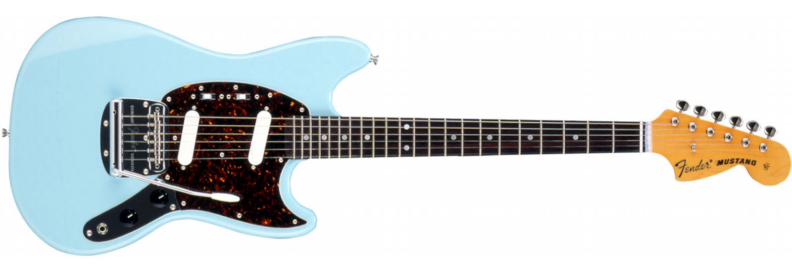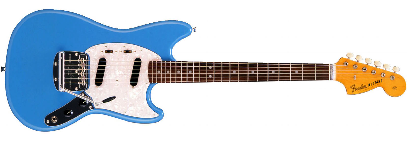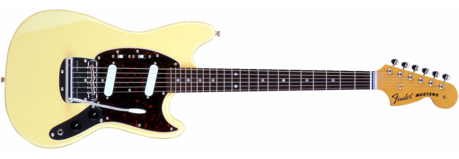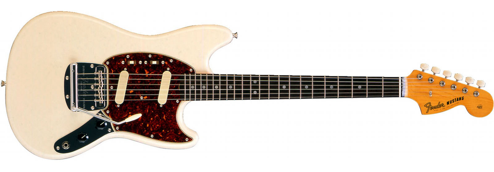 ヴィンテージに倣いポプラ材を採用し、パテントナンバー入りデカール、エイジドボタン・シャーラー糸巻き、USポット&USノブ、ピックガード、グレイファイバーボトム・アルニコマグネット・ポールピース、トレモロベースプレート、そして特徴的な形状のトレモロアームなど、可能な限りオリジナルを再現した'65バージョン・ムスタング。