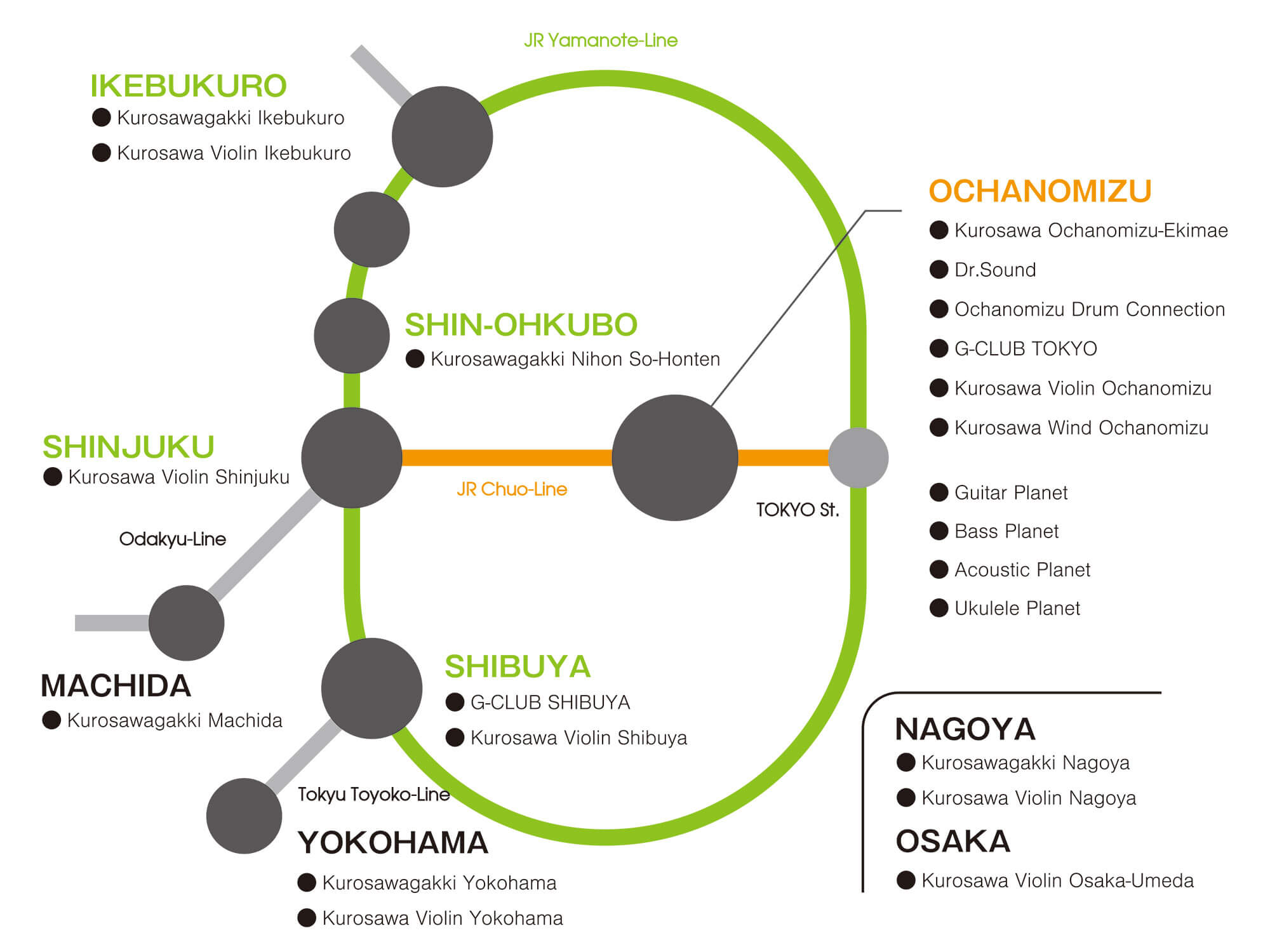 | Kurosawagakki Ochanomizu-Ekimae Acoustic Guitar & Ukulele Kurosawagakki Ochanomizu-Ekimae Acoustic Guitar & Ukulele | 03-3293-5626 03-3293-5626 | 2-4-1, Kandasurugadai, Chiyoda-ku, Tokyo, Japan 101-0062 2-4-1, Kandasurugadai, Chiyoda-ku, Tokyo, Japan 101-0062 | eki@kurosawagakki.com eki@kurosawagakki.com | 11:00~19:00 11:00~19:00 |