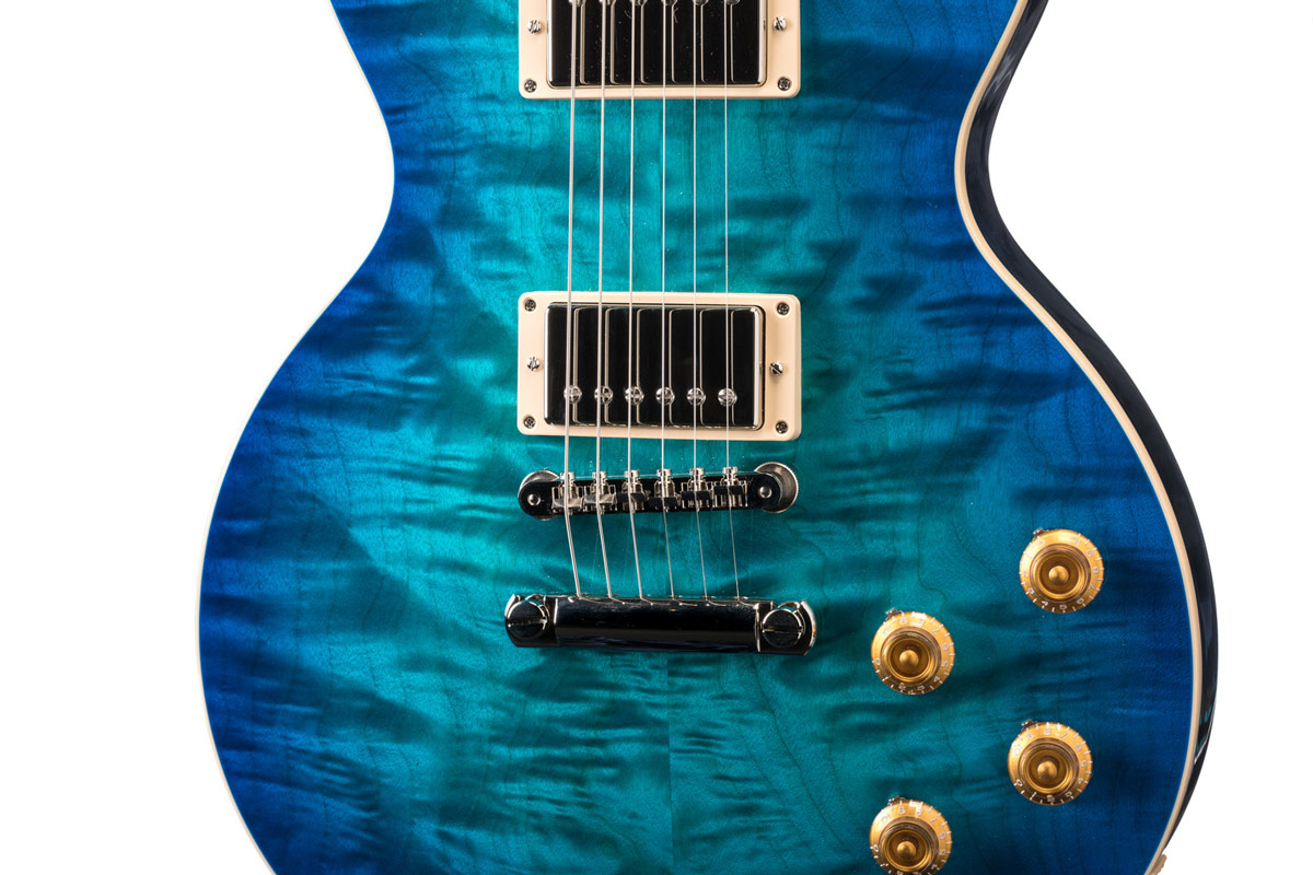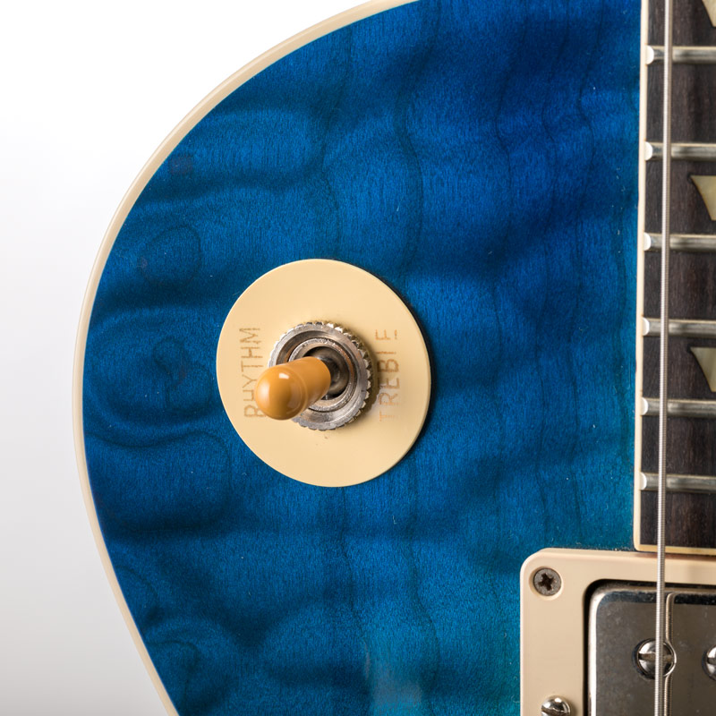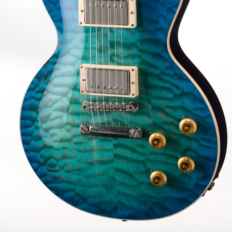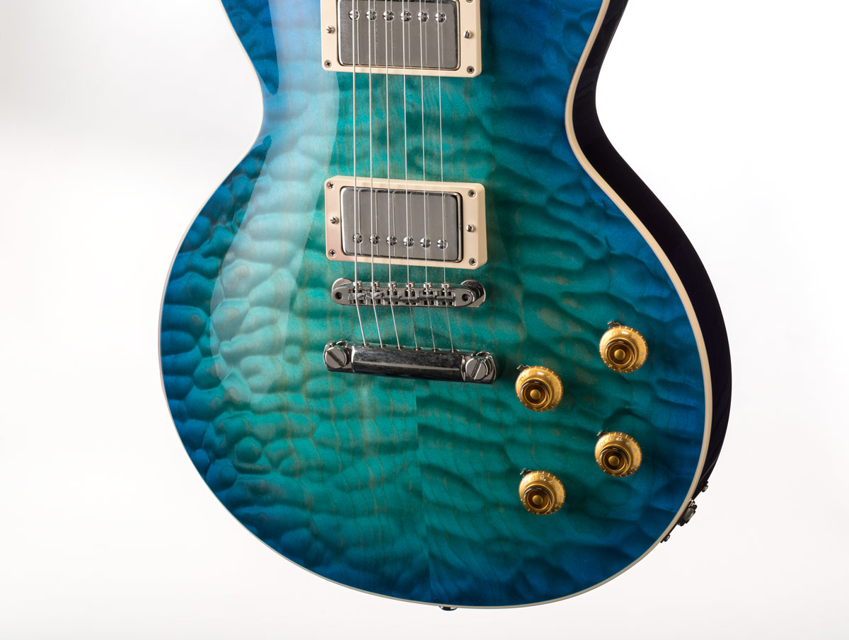 五稜結人のこだわりが全て詰まったこのギターは、世界中のトップ・ギタリストの垂涎の的であり、今や伝説と化した1959年製レスポール・スタンダードのスペックをもとにして、レスポール特有の力強いサウンドと優れた弾き心地を再現しています。さらに、ボディ・トップ(表面)には、最高級メイプル材を使用、その美しい木目をアルゴナビスの舞台となる函館の海を彷彿させる鮮やかなブルー・バーストが引き立てます。