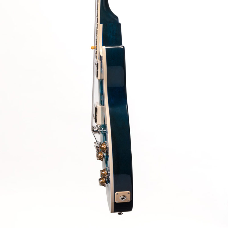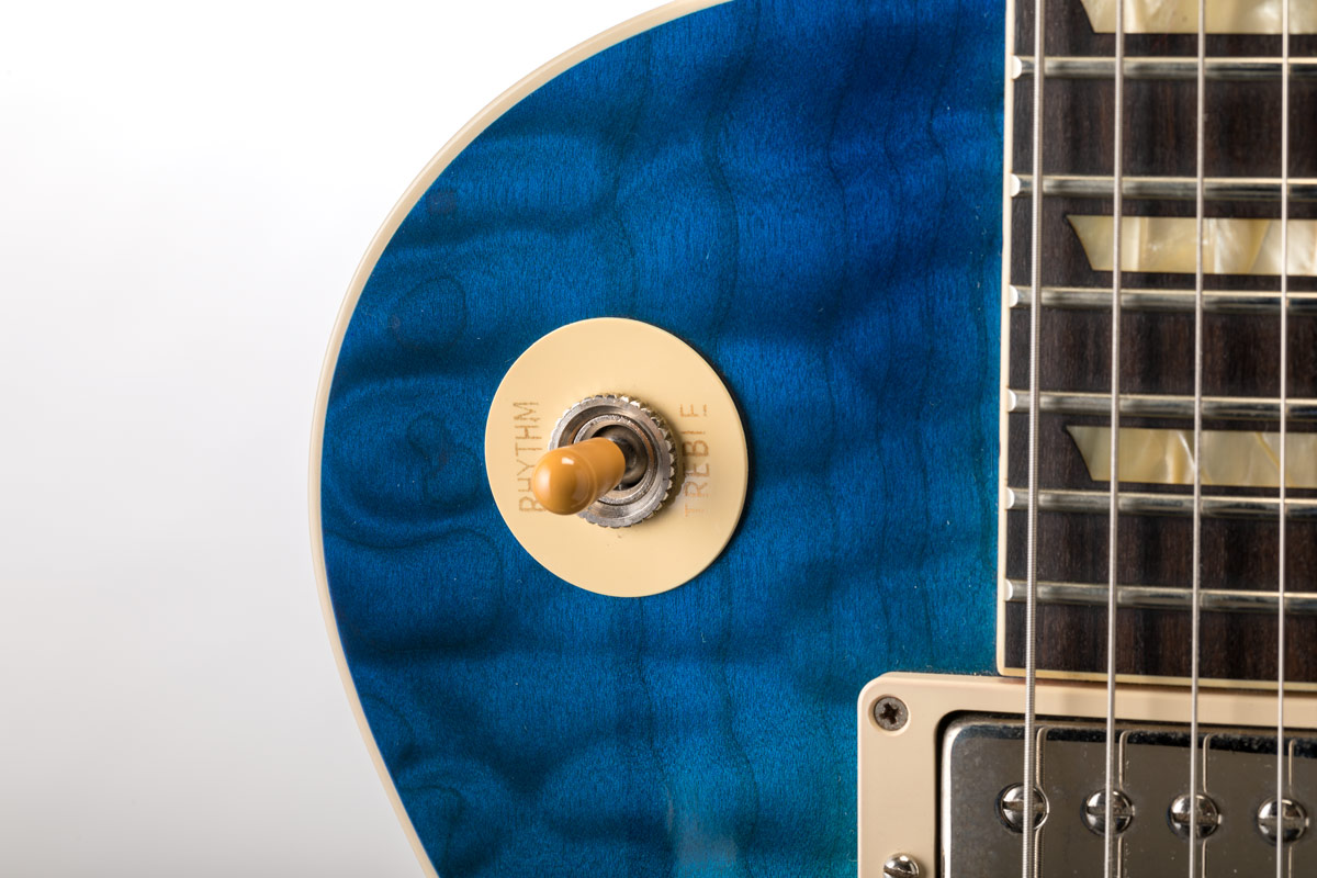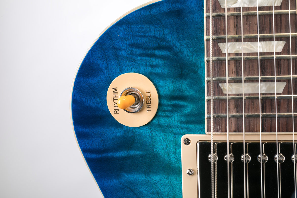 劇中で五稜結人が愛用するカスタムショップ製のレスポールをもとに、よりリーズナブルなスペックを採用したギブソンのレギュラー・ラインモデル。カスタムショップ製と同じく、ボディ・トップ(表面)には、希少なキルトの美しい木目のメイプル材に、アルゴナビス の舞台である函館の海をイメージしたブルー・バーストをマッチング。その力強いロック・サウンドからは、アルゴナビスのバンドリーダーでもある五稜結人の人々を惹きつける熱いスピリットを感じることができます。