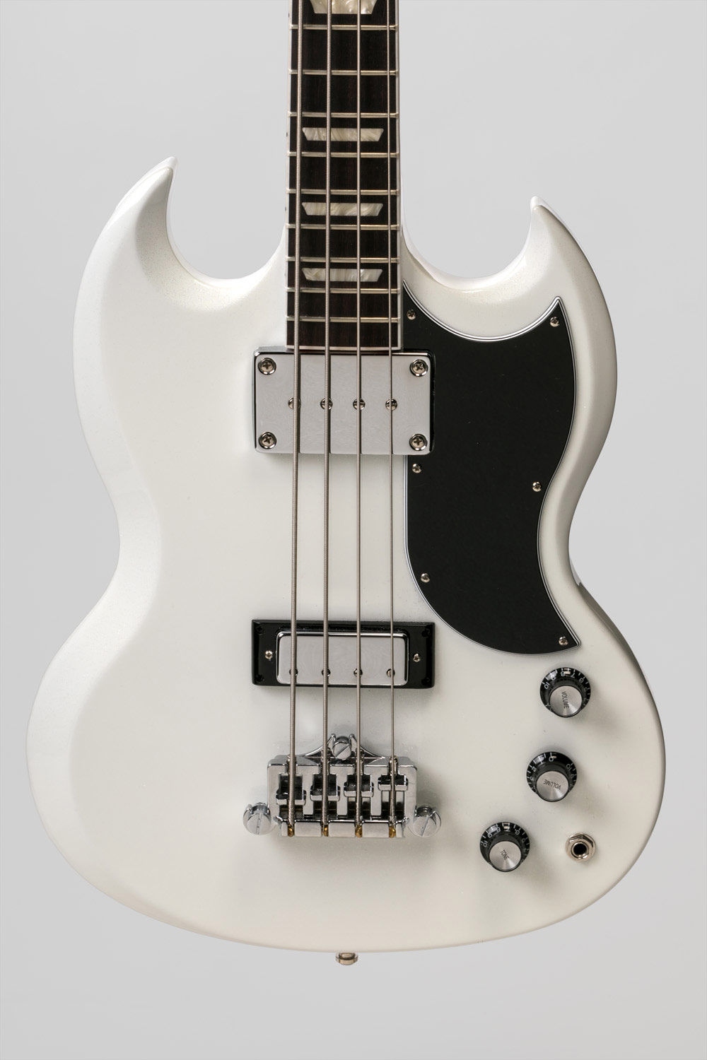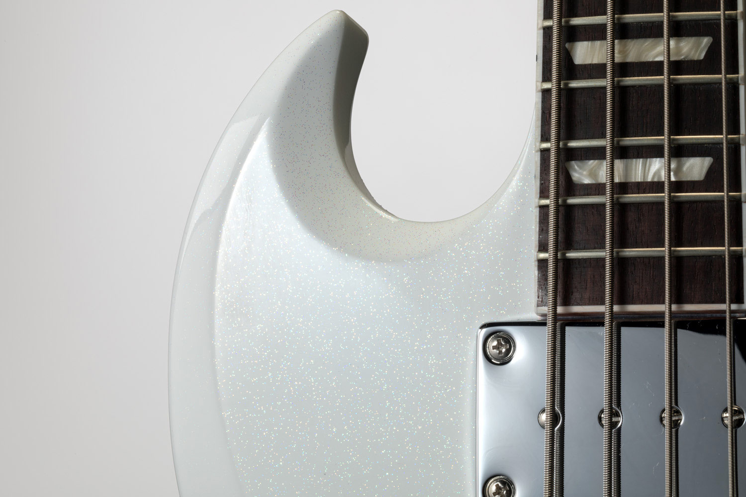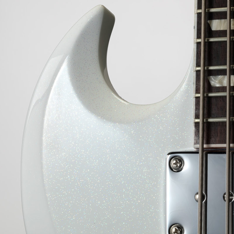 『アルゴナビス from BanG Dream!』の的場航海の特別仕様ベース。長年名プレイヤーに愛されてきたギブソンの歴史的モデルであるSGベースをもとに、光の加減で夜空の星の様に輝くレインボー・スパークルをちりばめたパールホワイト・カラーを採用。プレイしやすいショート・スケールもこのベースの特徴です。