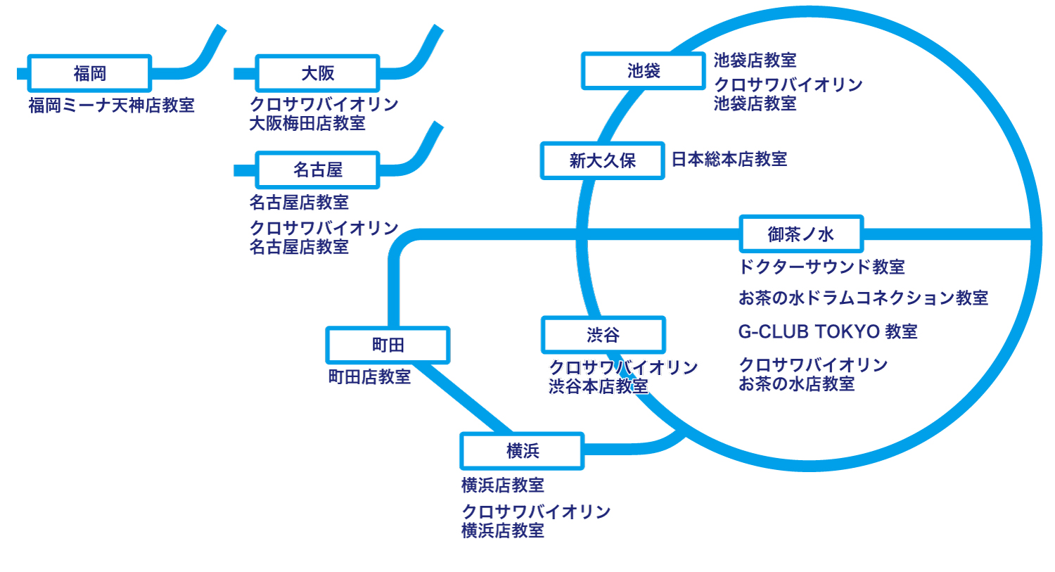 クロサワ音楽教室では東京23区内に8教室、横浜、町田、名古屋、大阪、福岡を含め計15教室をそれぞれ各ターミナル駅の近くに展開しております。ご自宅、学校、お仕事先よりご都合のよい教室をお選びください。各教室はクロサワ楽器店、クロサワバイオリンと併設しておりますので楽器のメンテナンス等もご相談いただけます。
