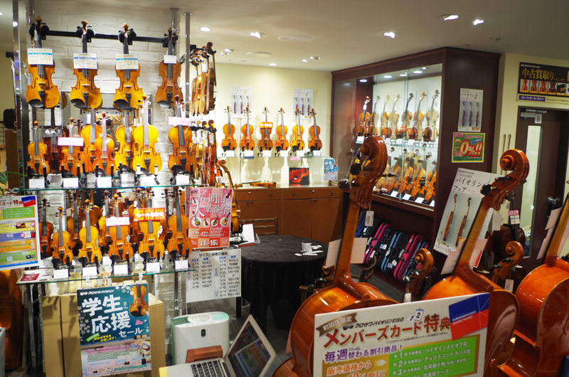 全教室が楽器店と併設しておりますので、楽器のメンテナンスや買い替えもお気軽にご相談いただけます。 弦などの消耗品は割引サービスもございます。 レッスンの待ち時間やお帰り前に、最新の楽器情報を得ることもできます。
