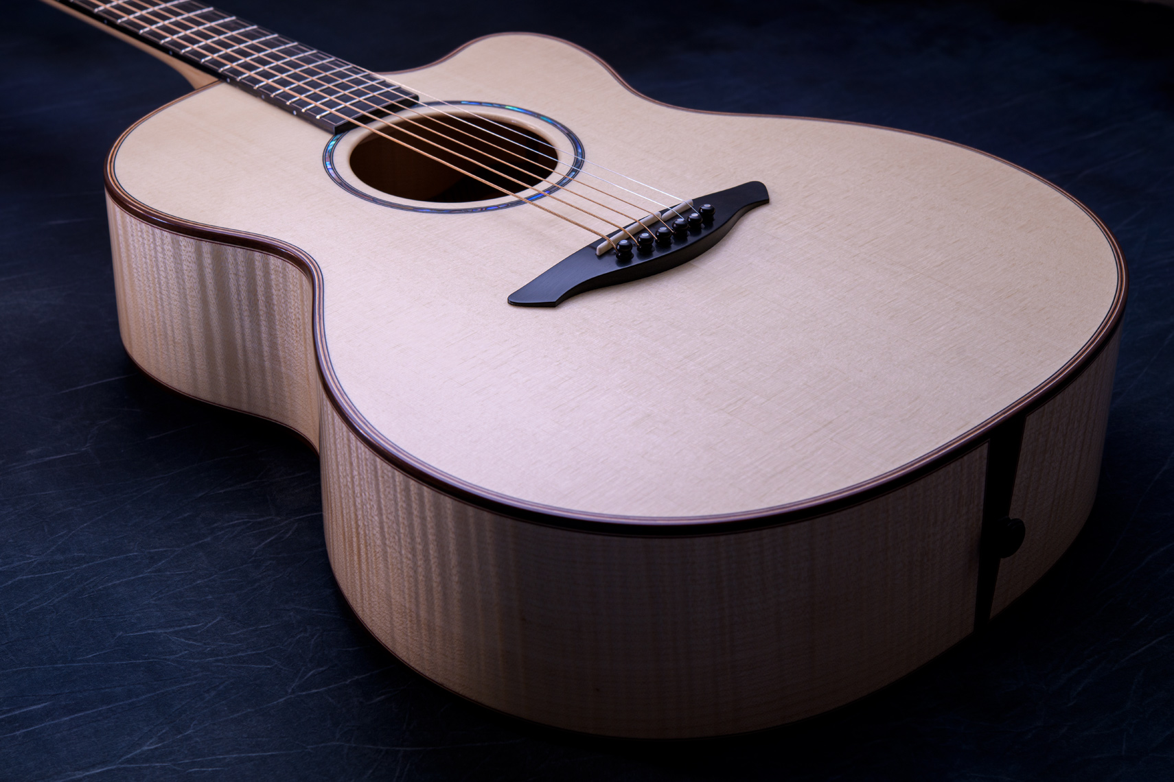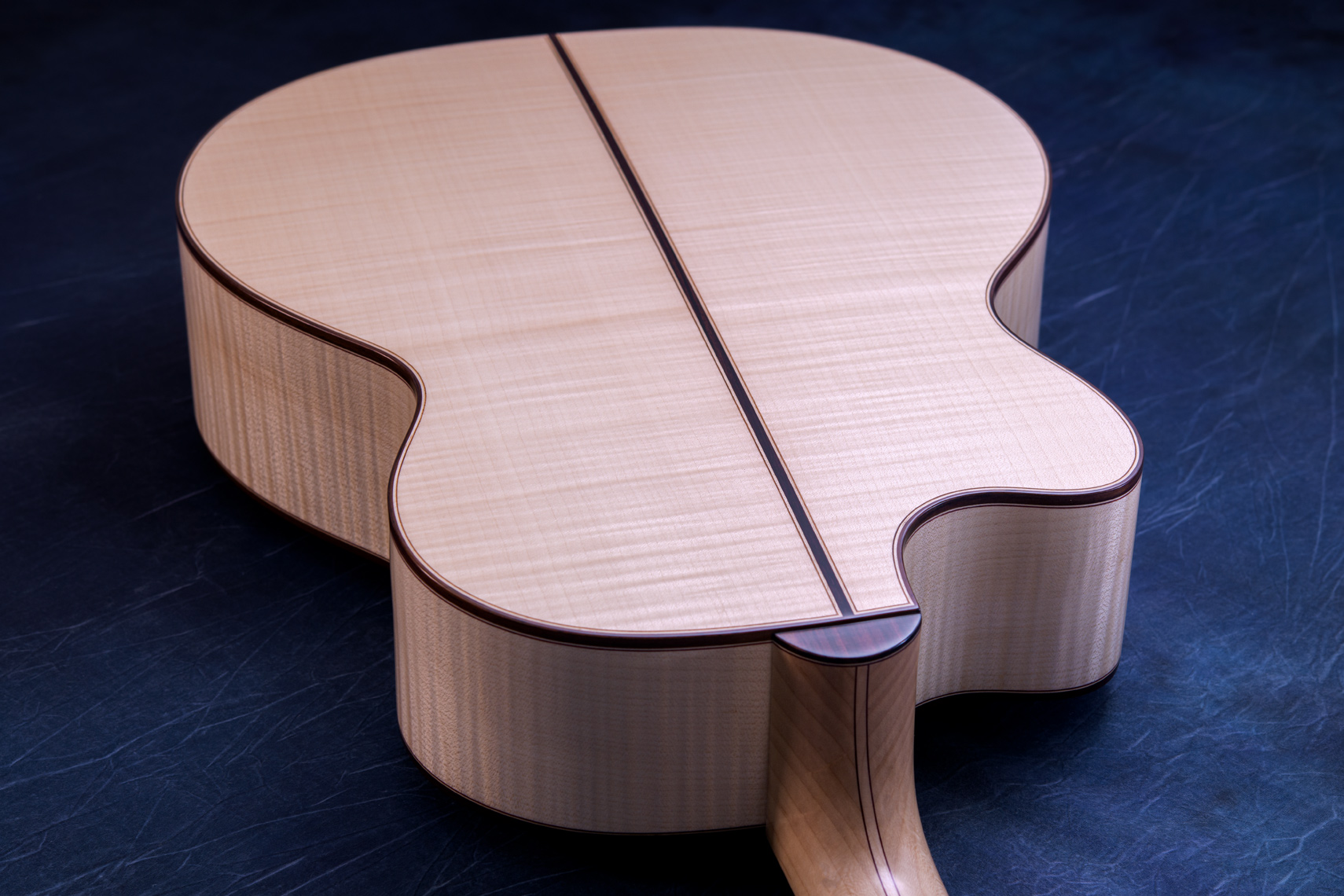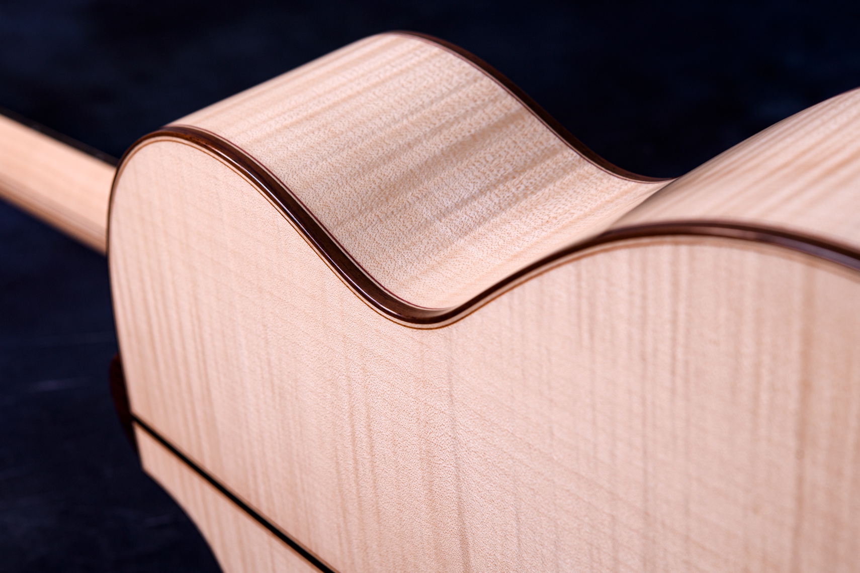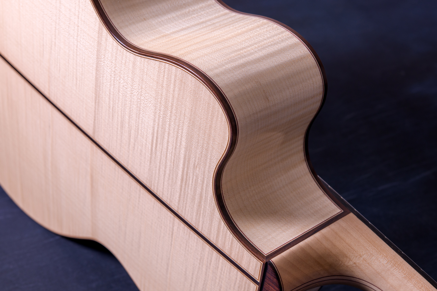 白く美しいフレイムメイプル。メイプルの特徴として硬質な木材であることから、サウンド面でもはっきりとした音が特徴的です。ソロギターでも好まれますが、コード弾きの場面では迫力もあります。一般的なローズウッドやマホガニーでは得られない出音です。