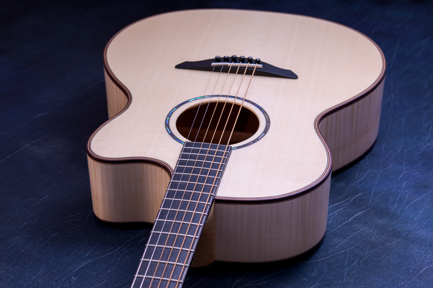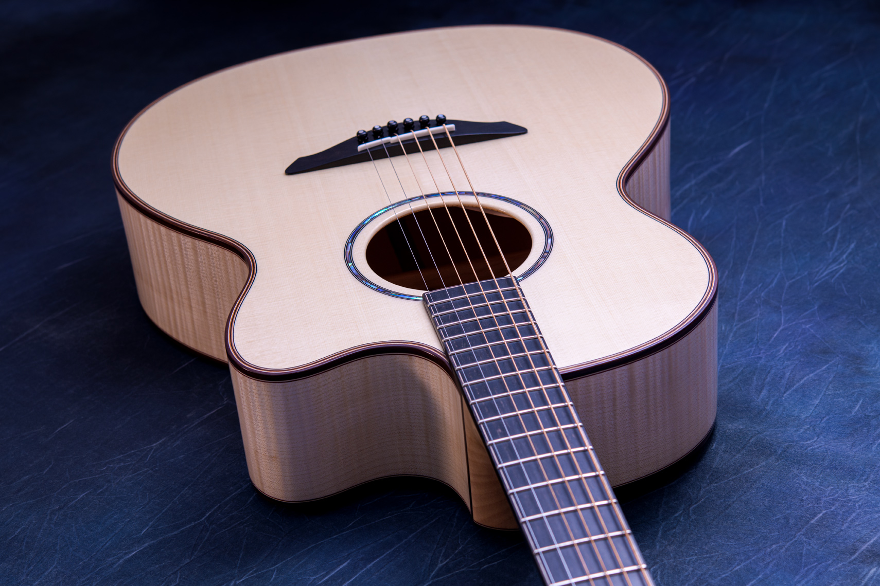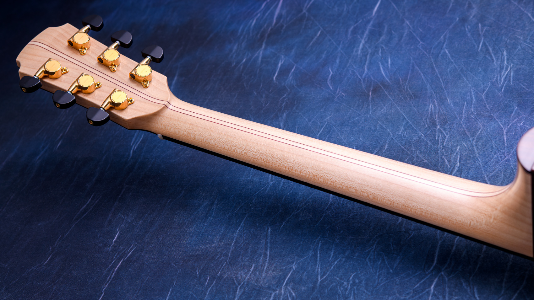 白く美しいフレイムメイプル。メイプルの特徴として硬質な木材であることから、サウンド面でもはっきりとした音が特徴的です。ソロギターでも好まれますが、コード弾きの場面では迫力もあります。一般的なローズウッドやマホガニーでは得られない出音です。