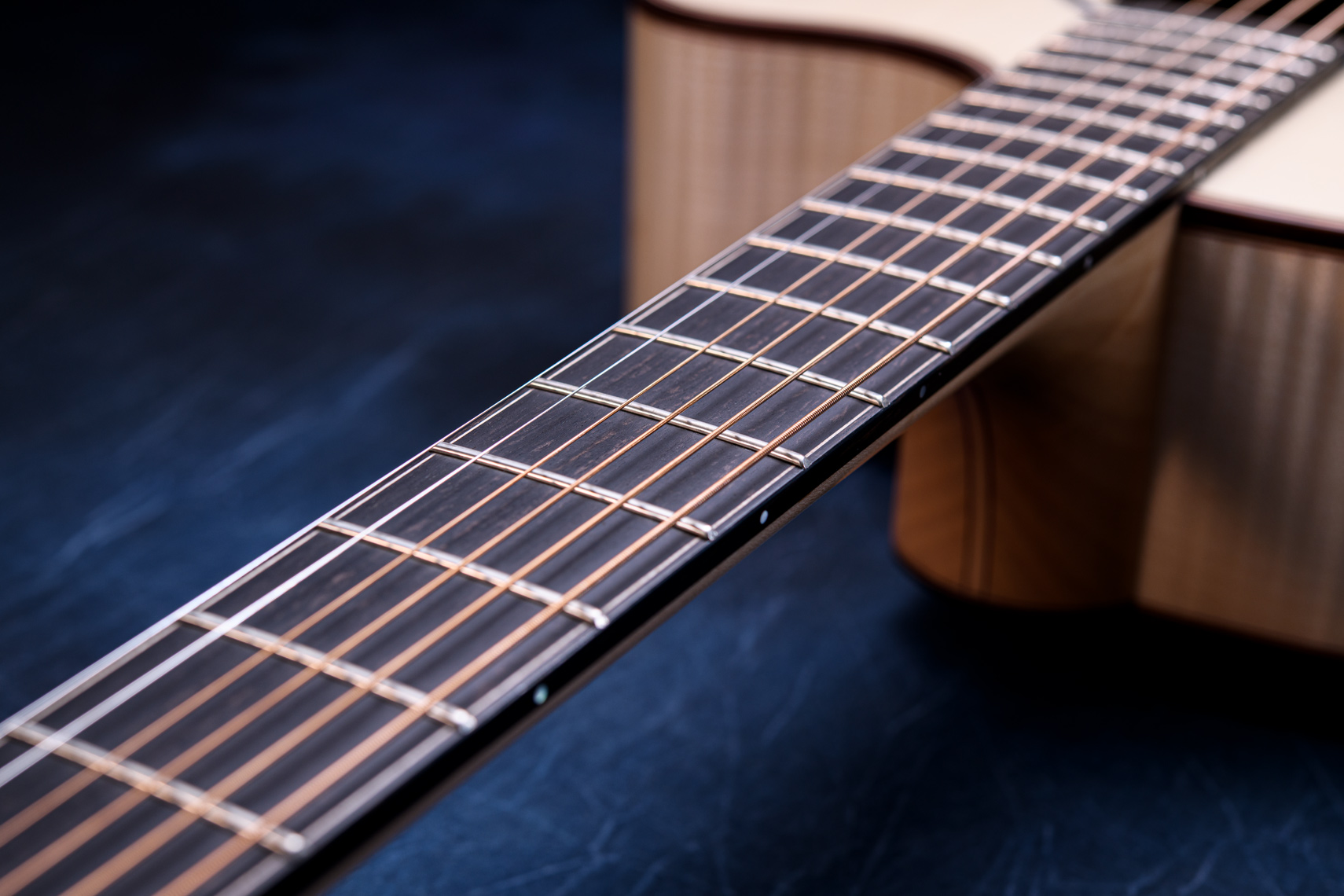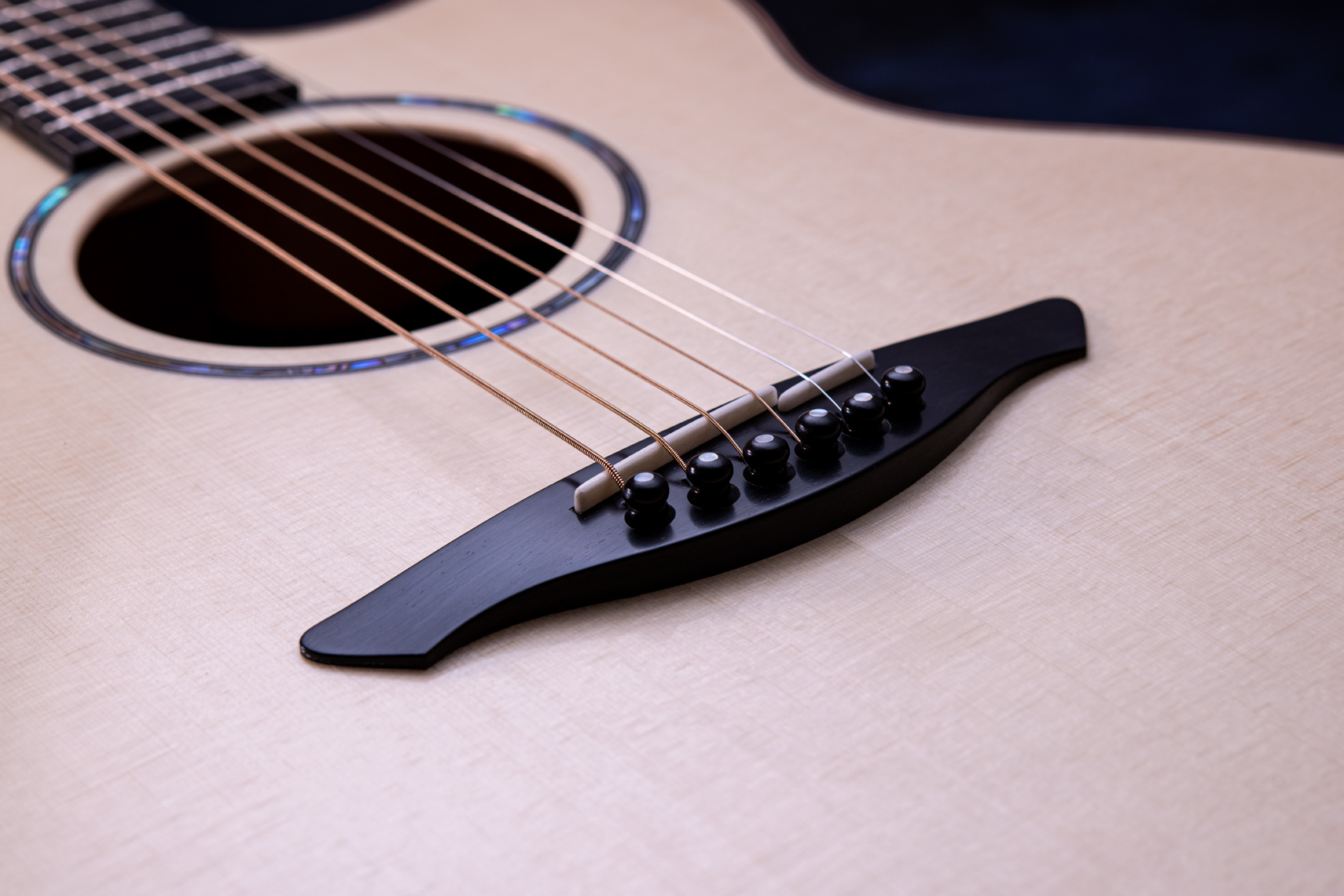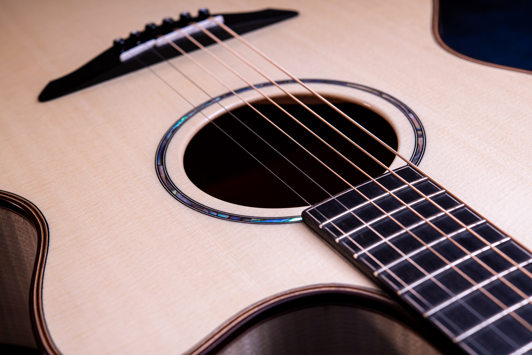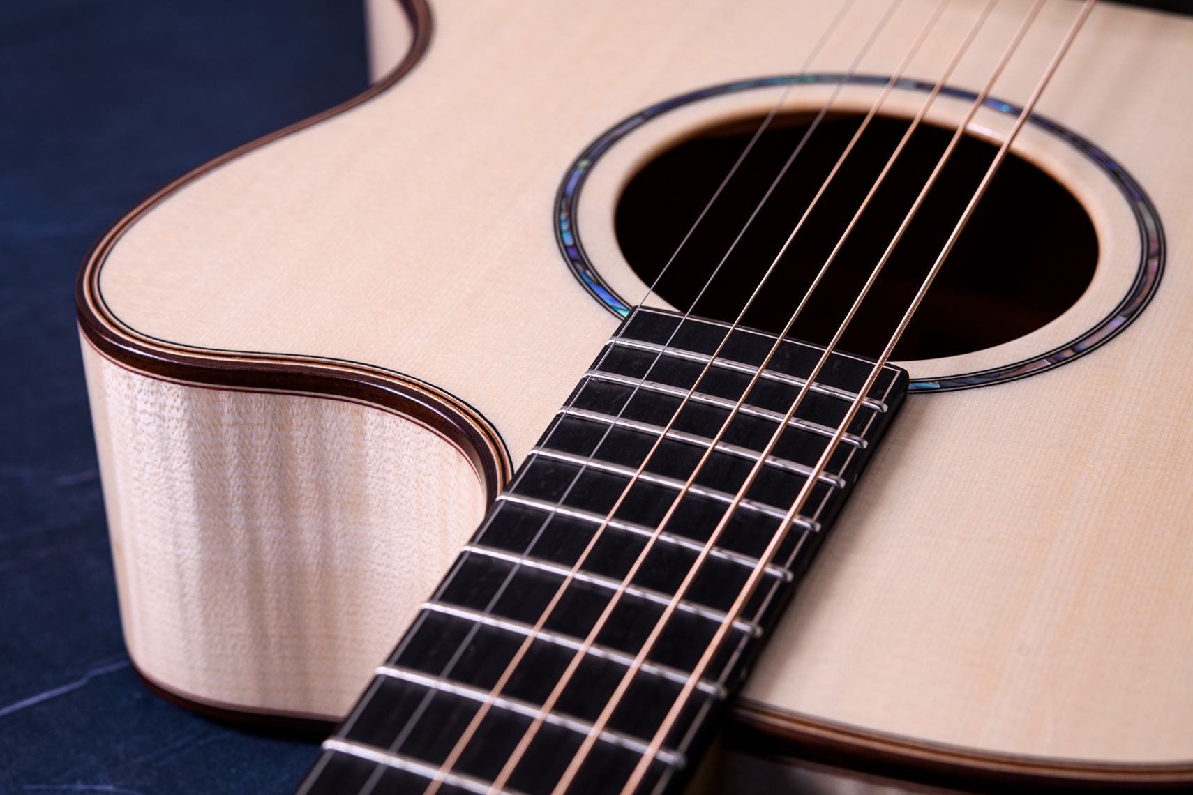 白く美しいフレイムメイプル。メイプルの特徴として硬質な木材であることから、サウンド面でもはっきりとした音が特徴的です。ソロギターでも好まれますが、コード弾きの場面では迫力もあります。一般的なローズウッドやマホガニーでは得られない出音です。