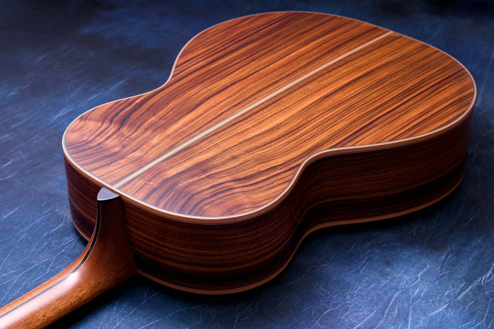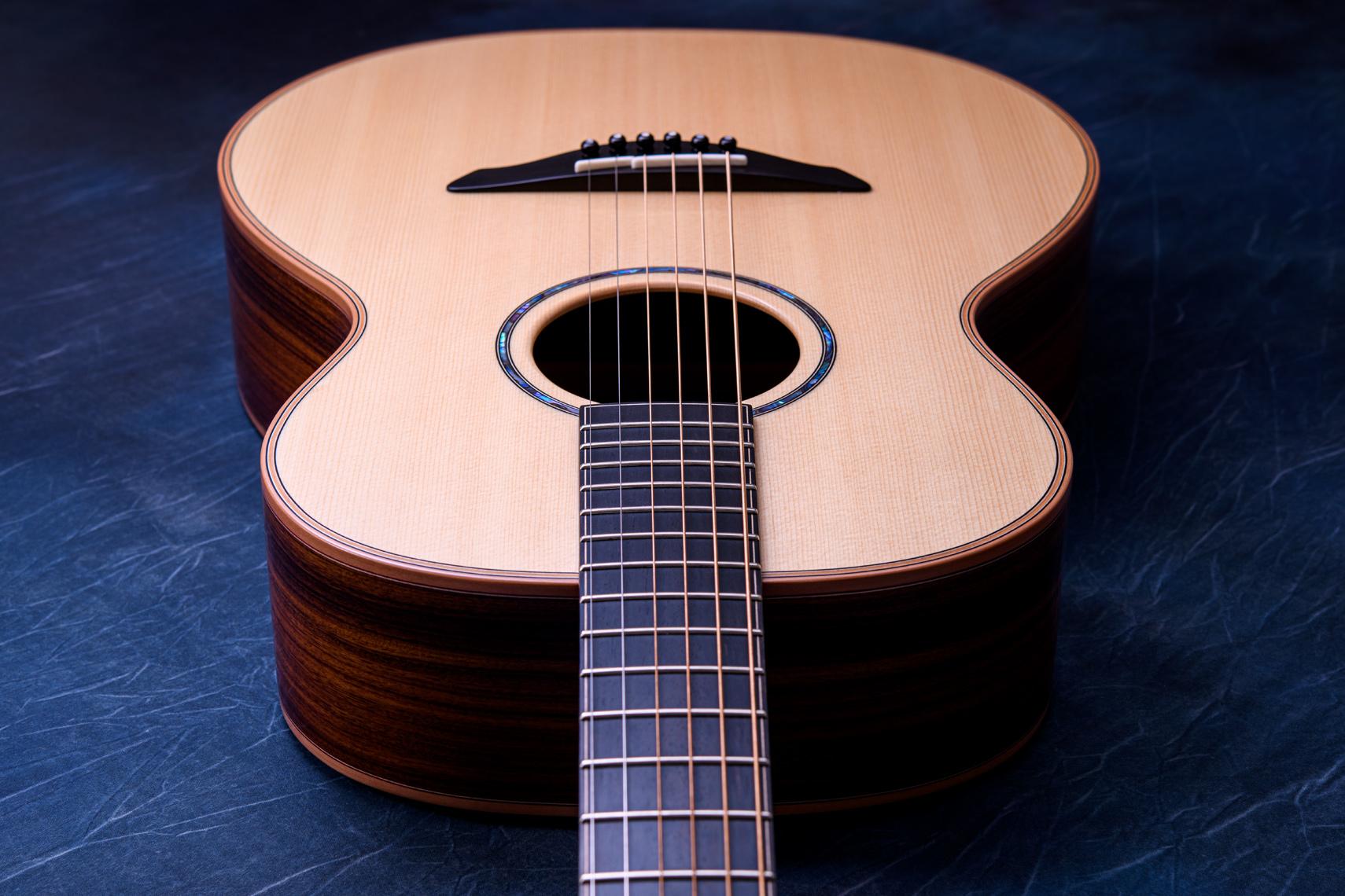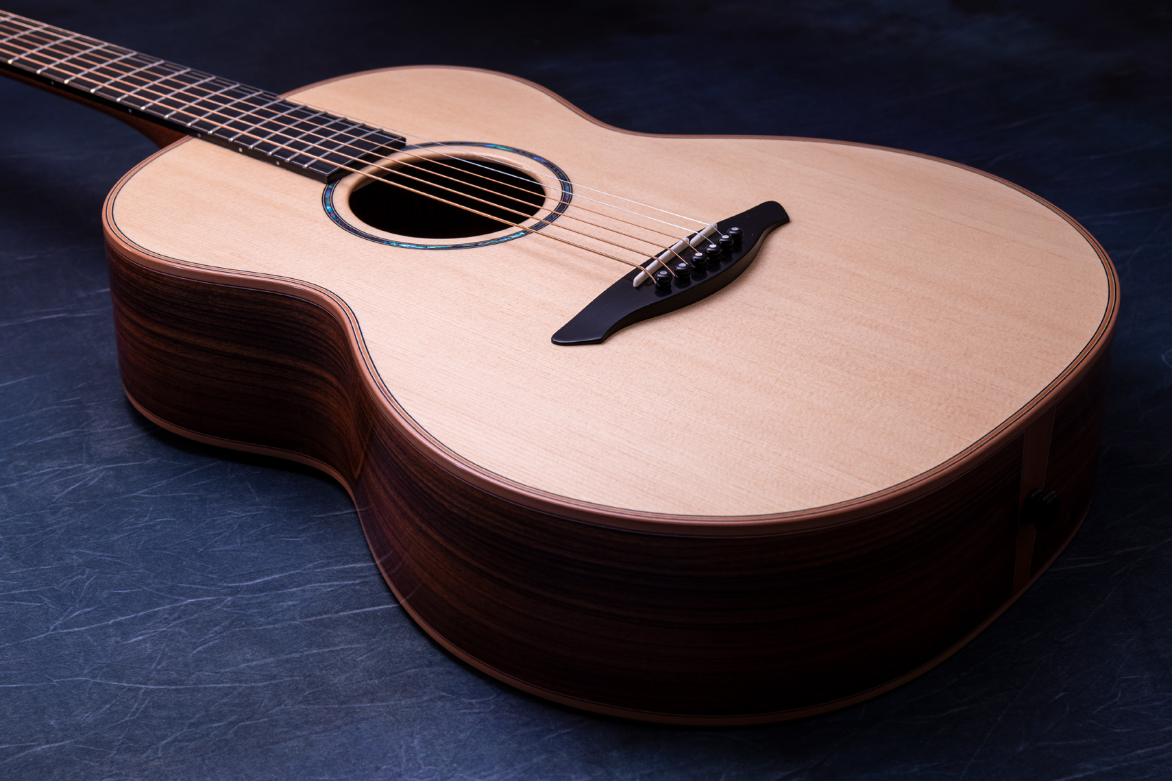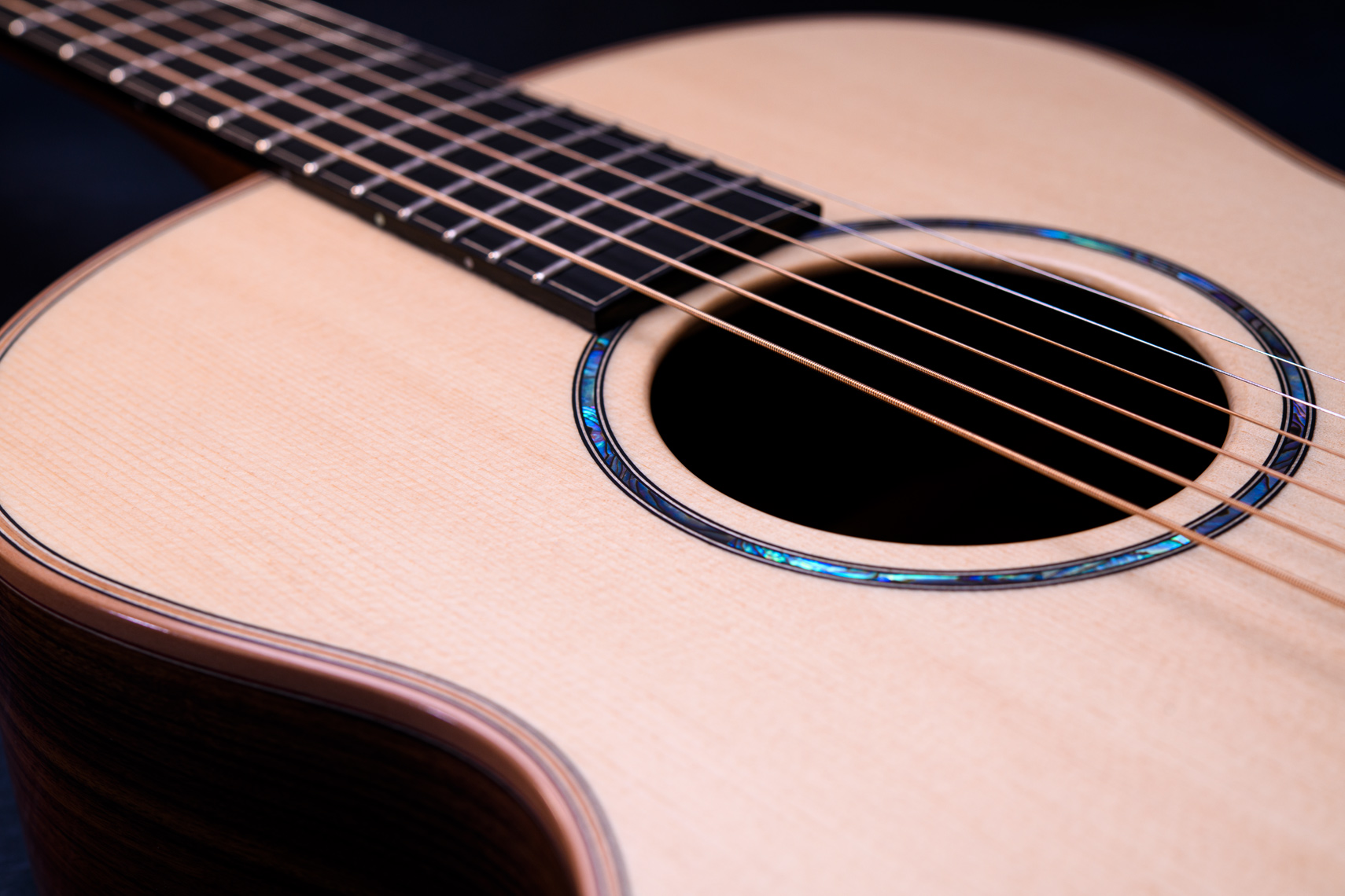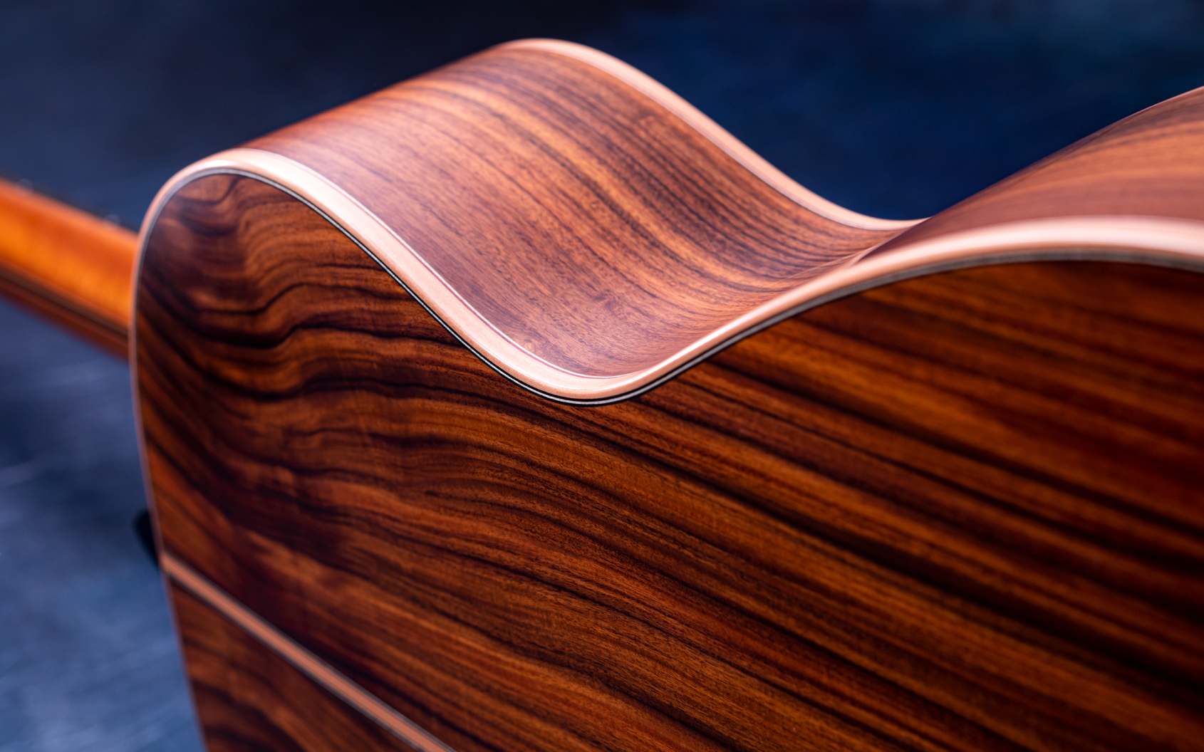 ニューハカランダとして名高いココボロをサイドバックに採用したモデル。ココボロ材はハカランダに比べても木材の特徴として重厚です。サウンド面でも同様に深い鈴なりが得られます。よく使用されるローズウッドはインディアン・ローズウッドですが、鈴なりの深さが違い「キラキラ」というよりは「ゴーン」というような重厚な鈴なりです。