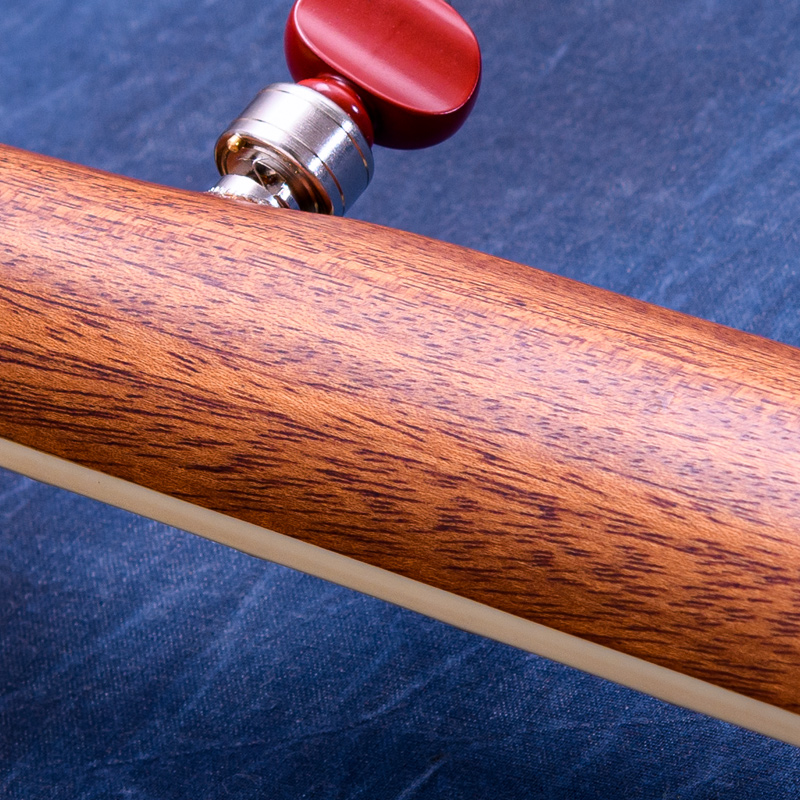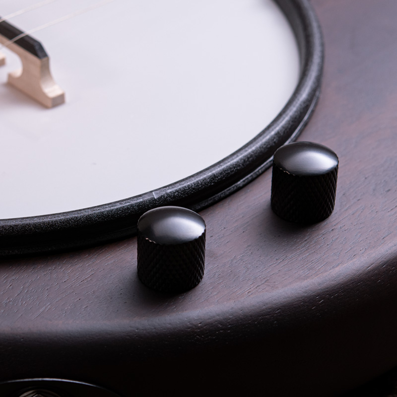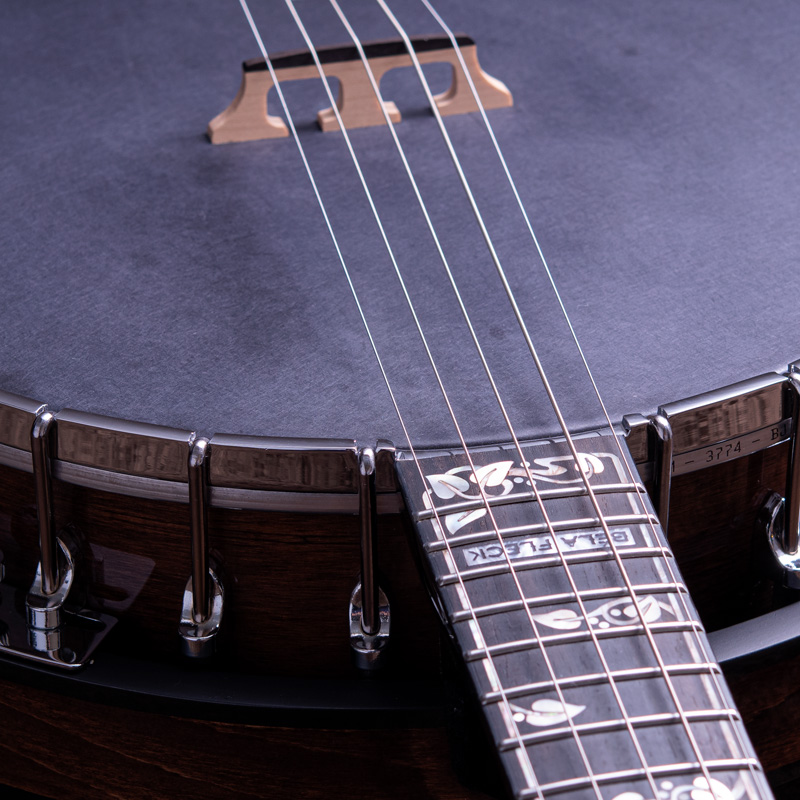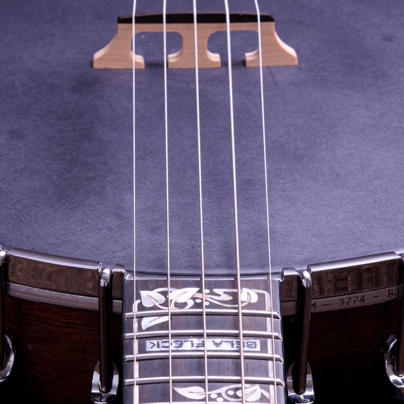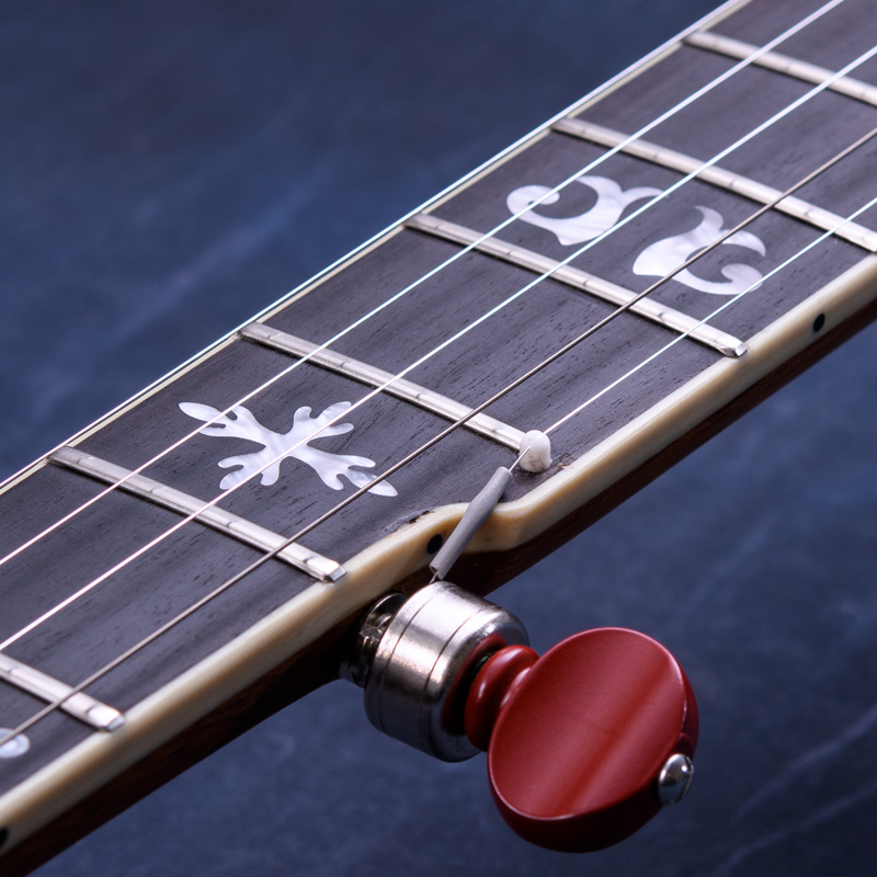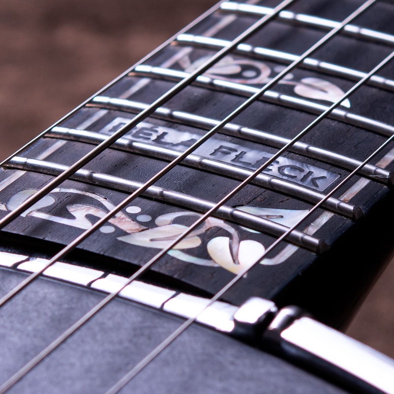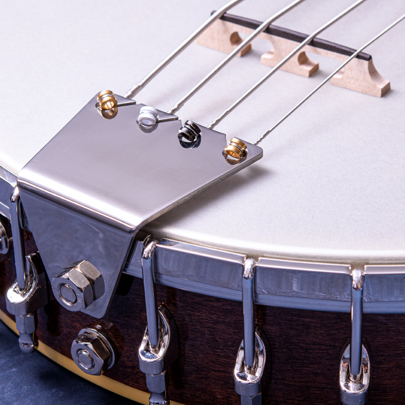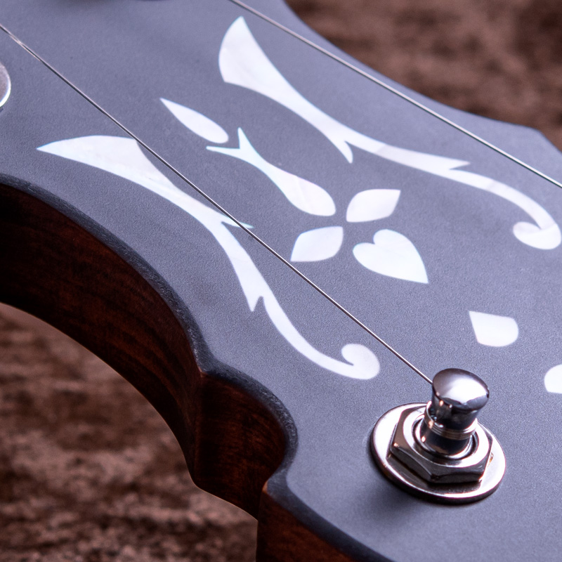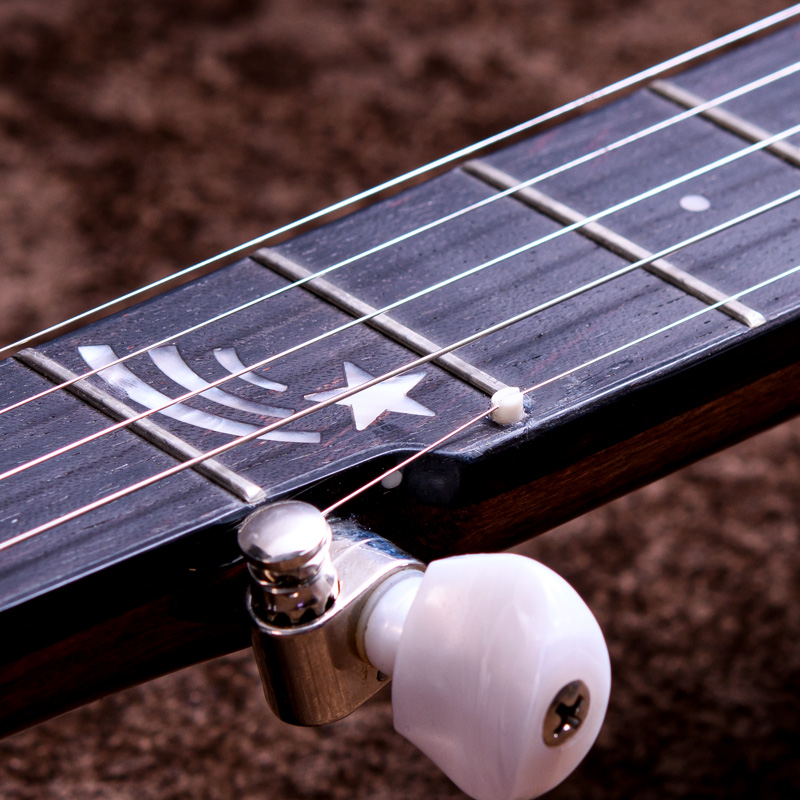 ペグには Rickard Cyclone チューナーがセレクトされており、10:1レシオの高精度なチューニングが可能です。ペグボタンは真鍮製になっており、ネック全体の重量を持たせることで独特の中低音と比較的ずっしりとした、あの独特なのサウンドを生み出しています。ネックの仕込み角度に至るまで、Bela のバンジョーを徹底的にセットアップに至るまで追求したプロフェッショナル仕様のバンジョーです。