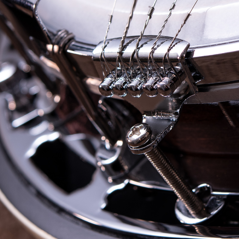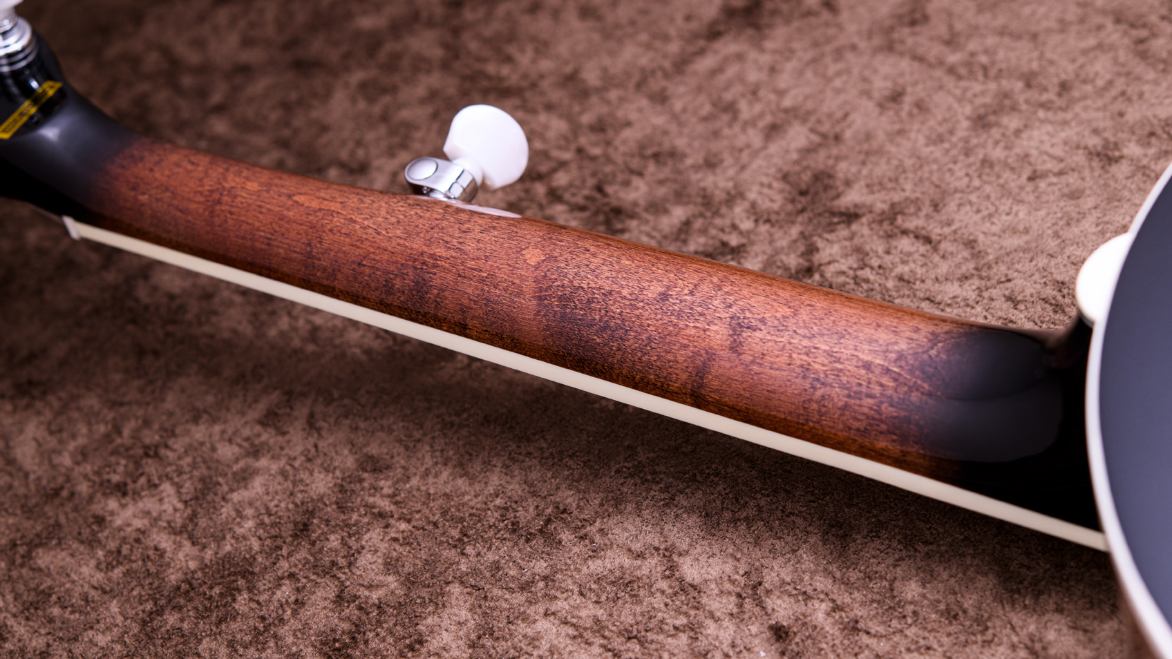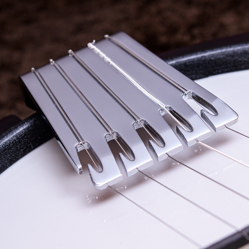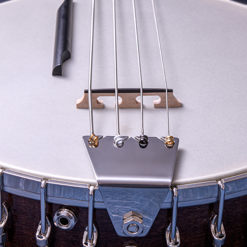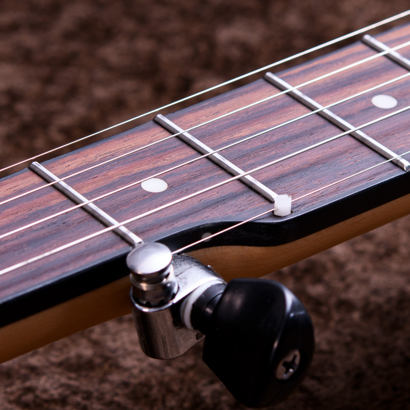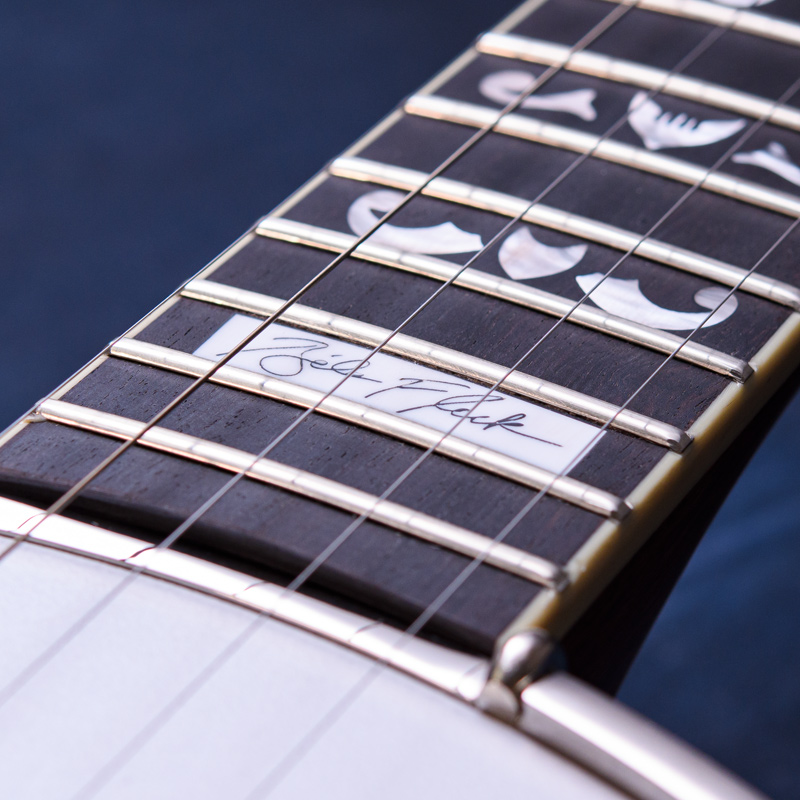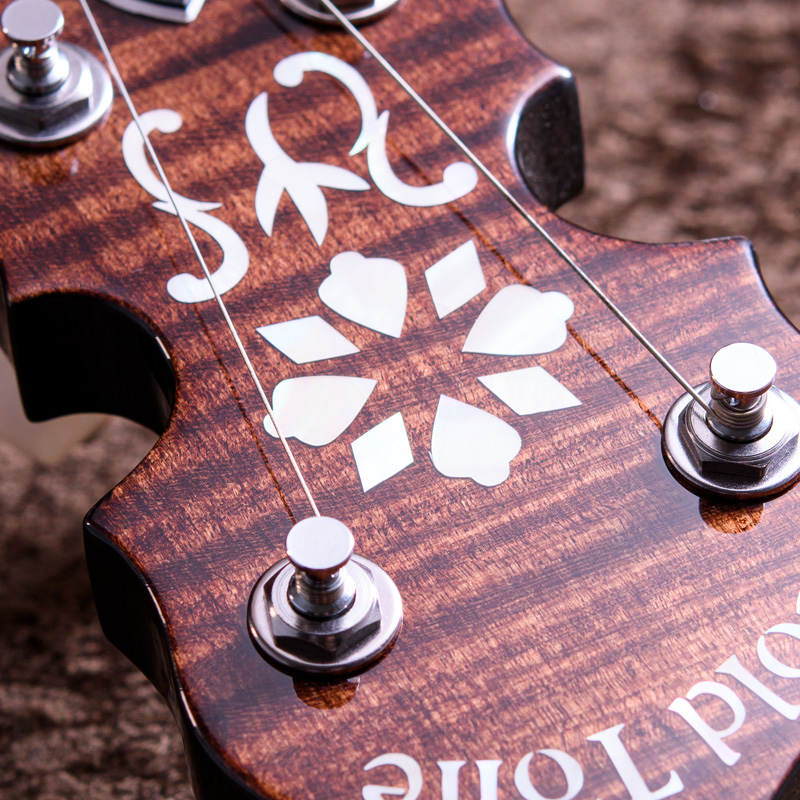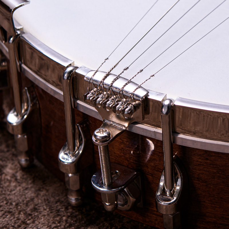 ペグには Rickard Cyclone チューナーがセレクトされており、10:1レシオの高精度なチューニングが可能です。ペグボタンは真鍮製になっており、ネック全体の重量を持たせることで独特の中低音と比較的ずっしりとした、あの独特なのサウンドを生み出しています。ネックの仕込み角度に至るまで、Bela のバンジョーを徹底的にセットアップに至るまで追求したプロフェッショナル仕様のバンジョーです。