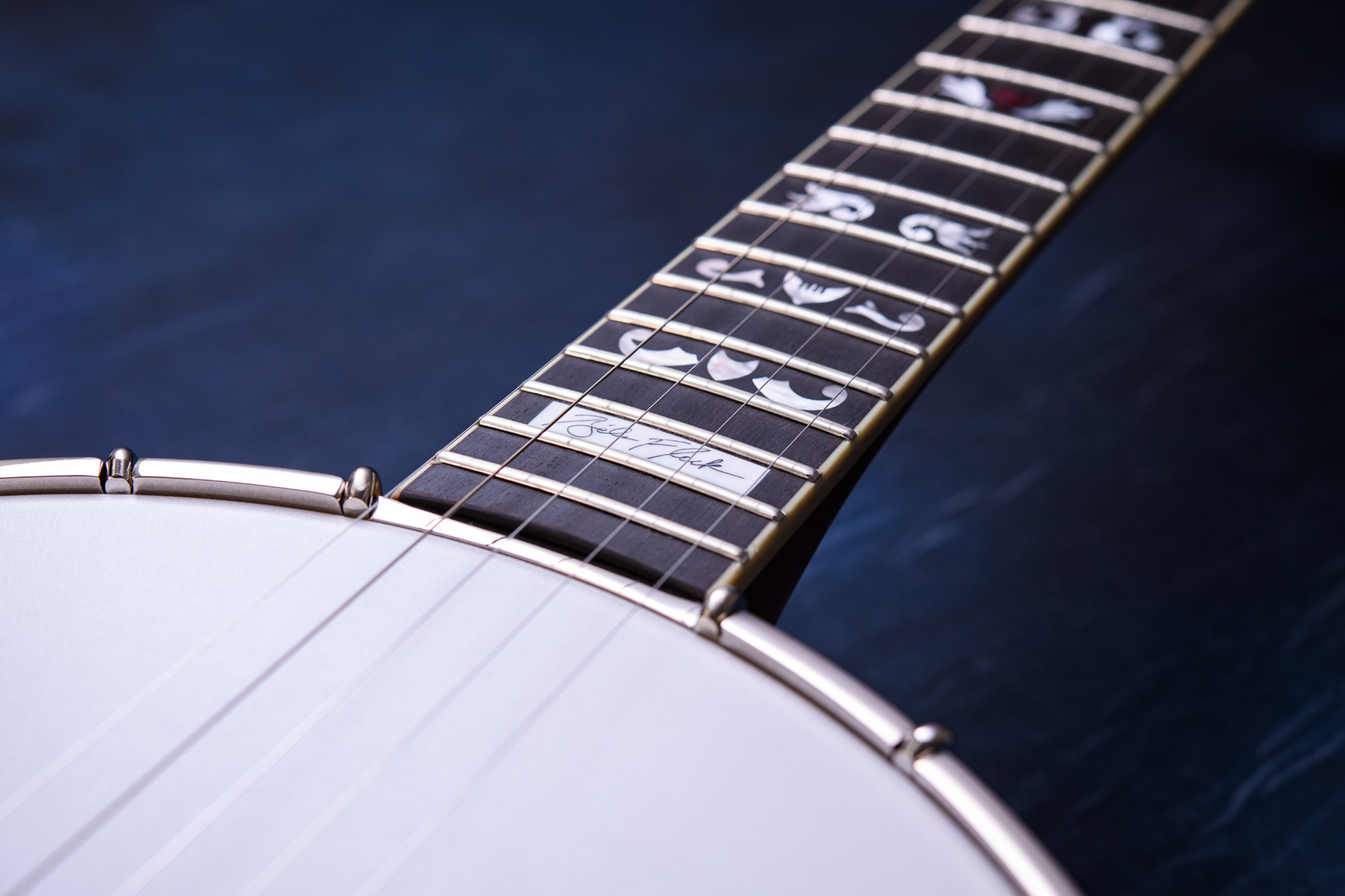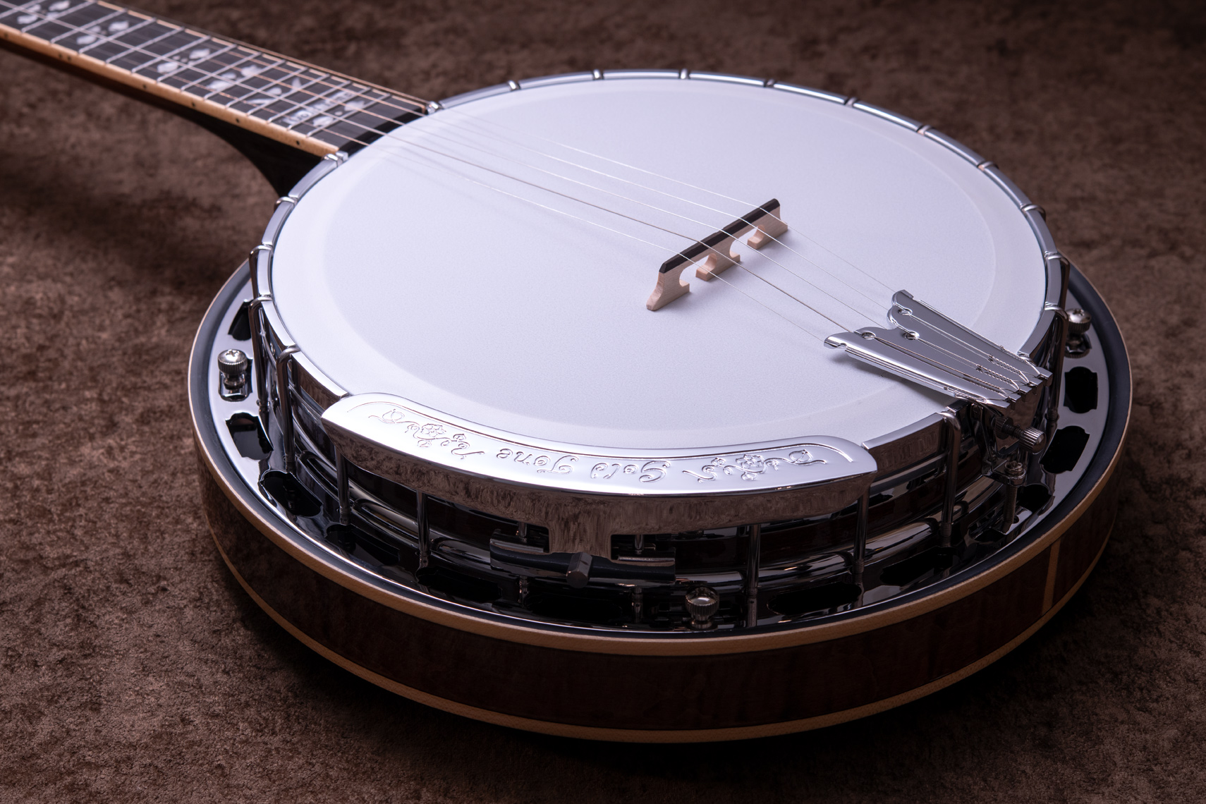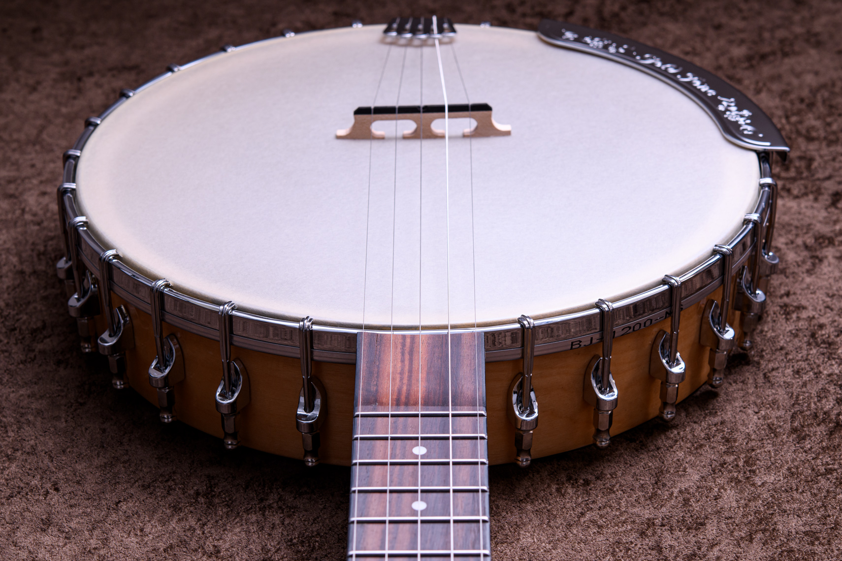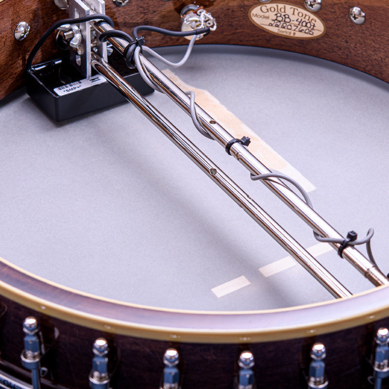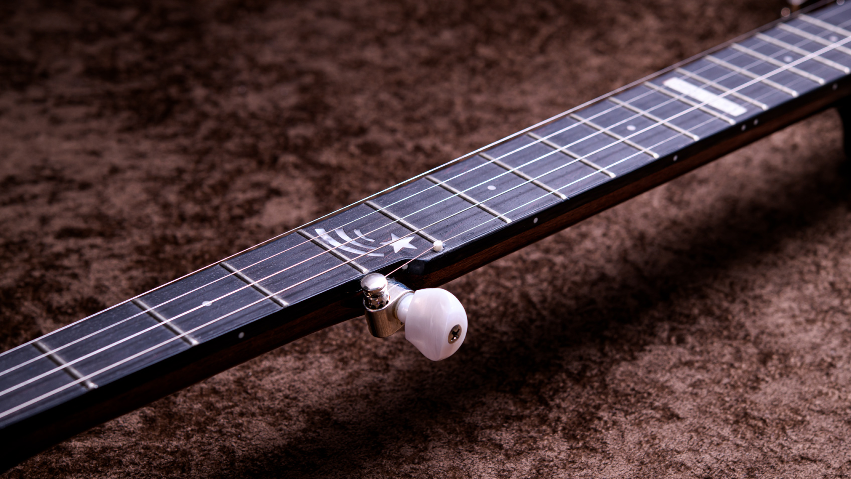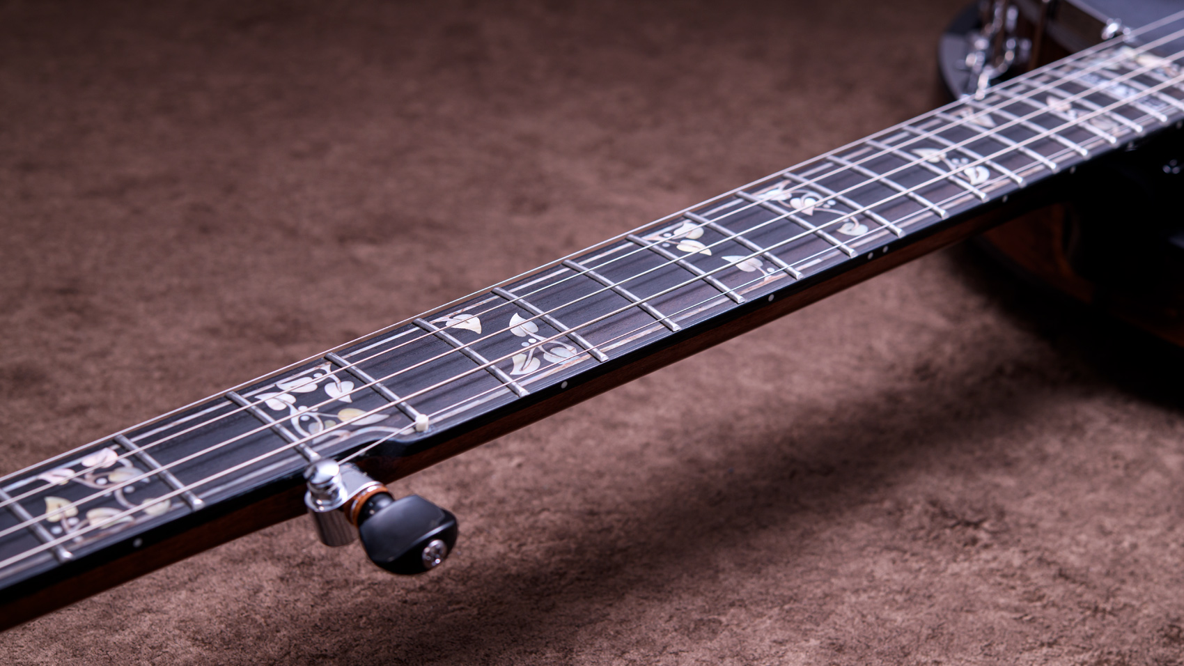 ペグには Rickard Cyclone チューナーがセレクトされており、10:1レシオの高精度なチューニングが可能です。ペグボタンは真鍮製になっており、ネック全体の重量を持たせることで独特の中低音と比較的ずっしりとした、あの独特なのサウンドを生み出しています。ネックの仕込み角度に至るまで、Bela のバンジョーを徹底的にセットアップに至るまで追求したプロフェッショナル仕様のバンジョーです。