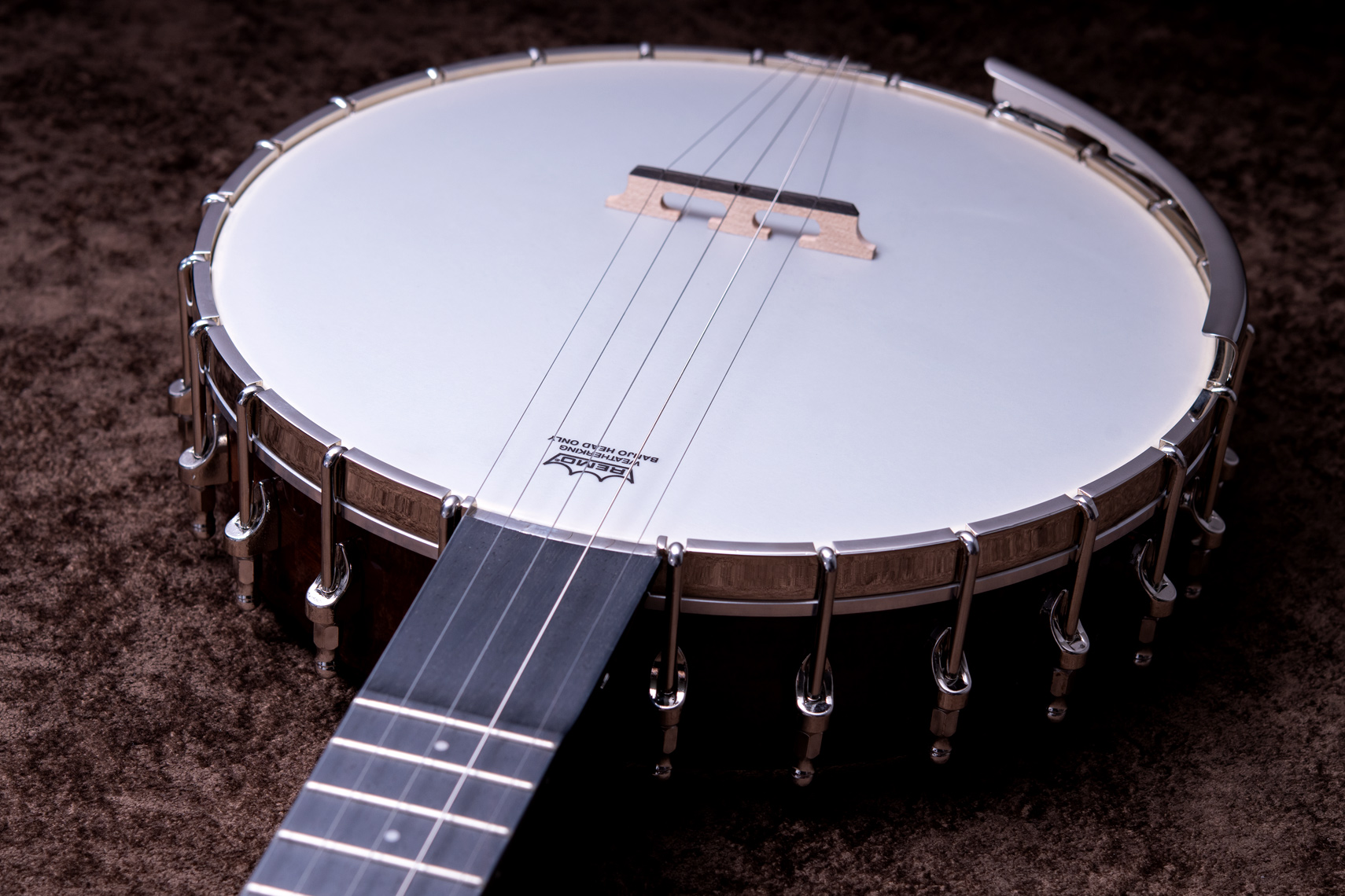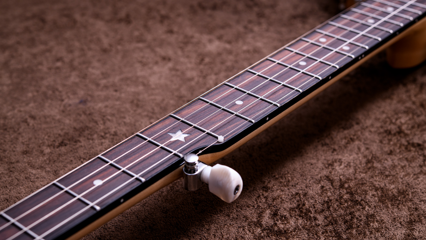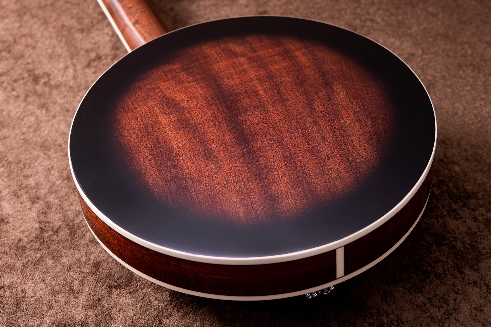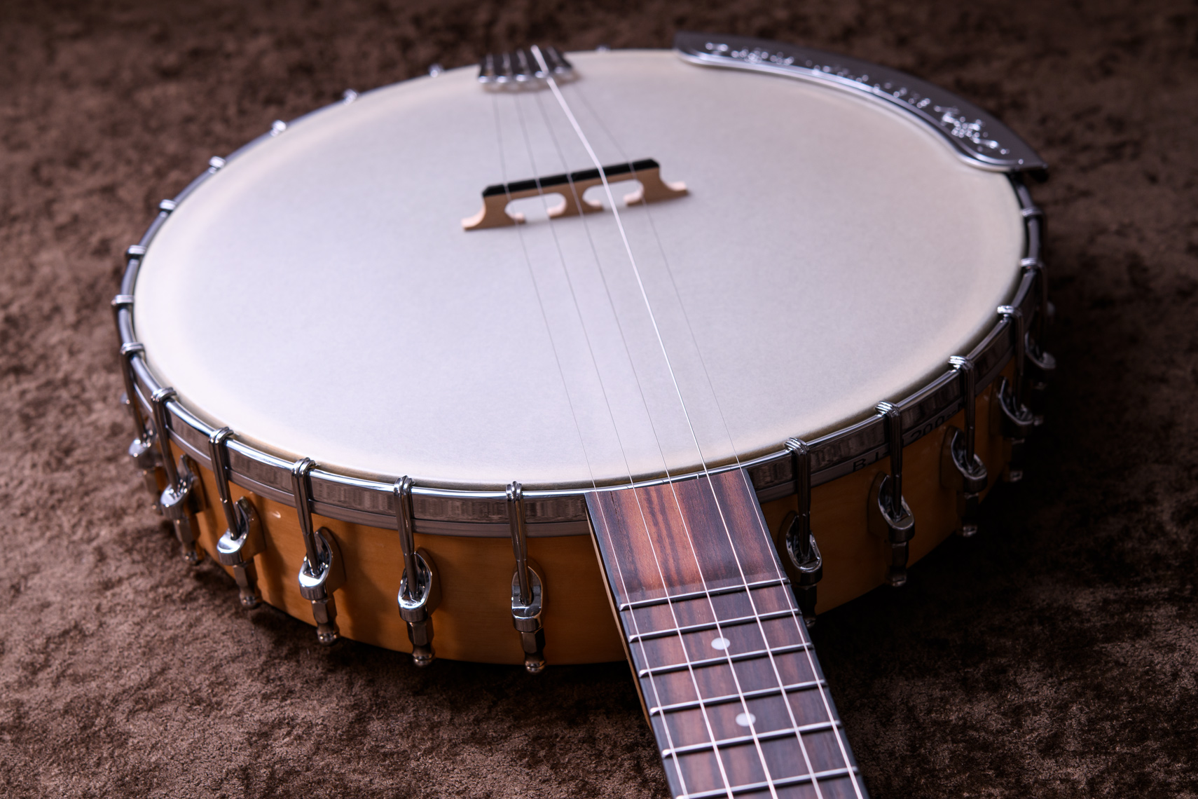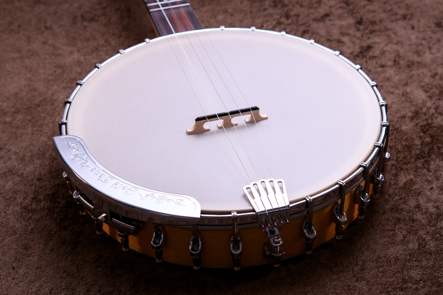 ペグには Rickard Cyclone チューナーがセレクトされており、10:1レシオの高精度なチューニングが可能です。ペグボタンは真鍮製になっており、ネック全体の重量を持たせることで独特の中低音と比較的ずっしりとした、あの独特なのサウンドを生み出しています。ネックの仕込み角度に至るまで、Bela のバンジョーを徹底的にセットアップに至るまで追求したプロフェッショナル仕様のバンジョーです。