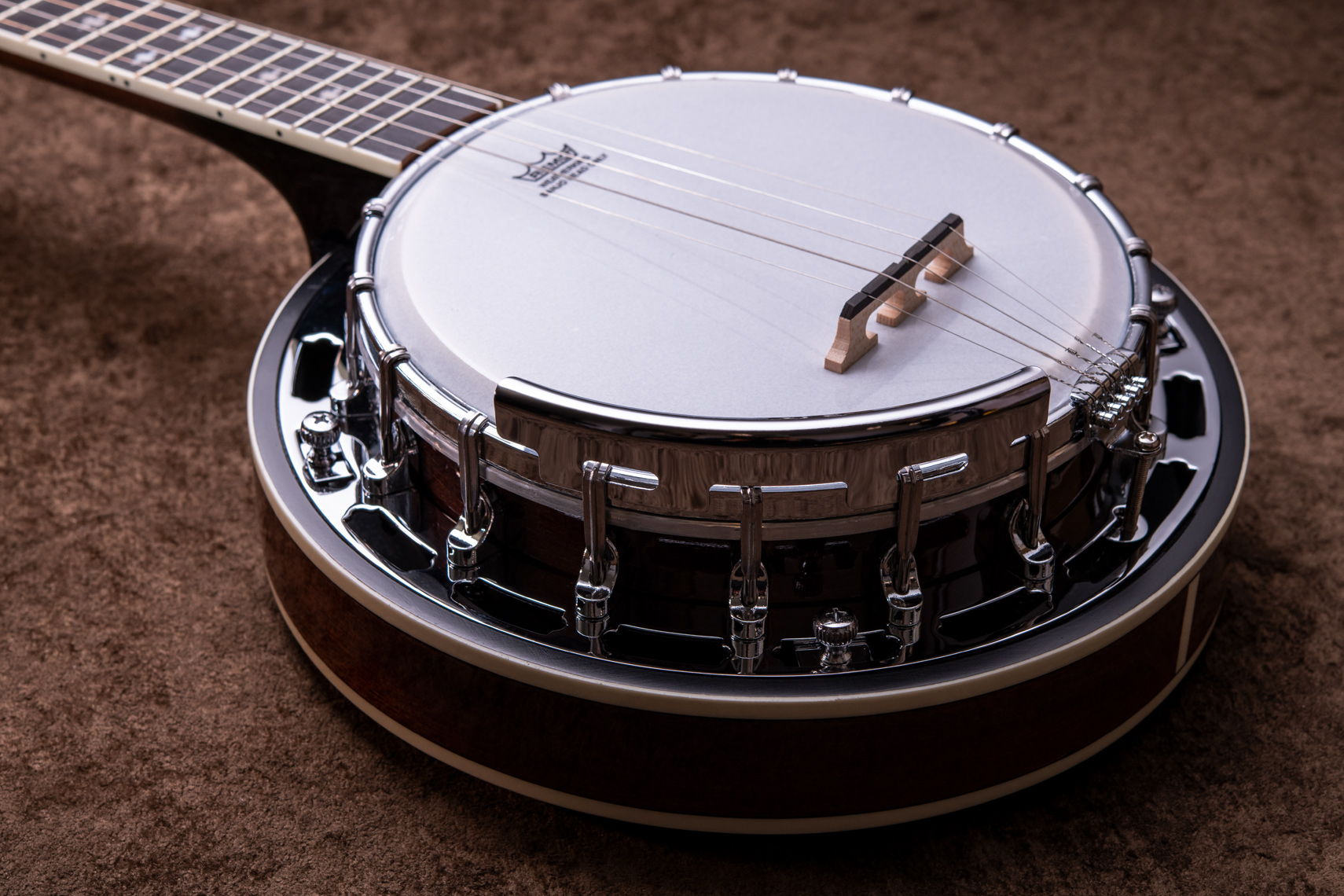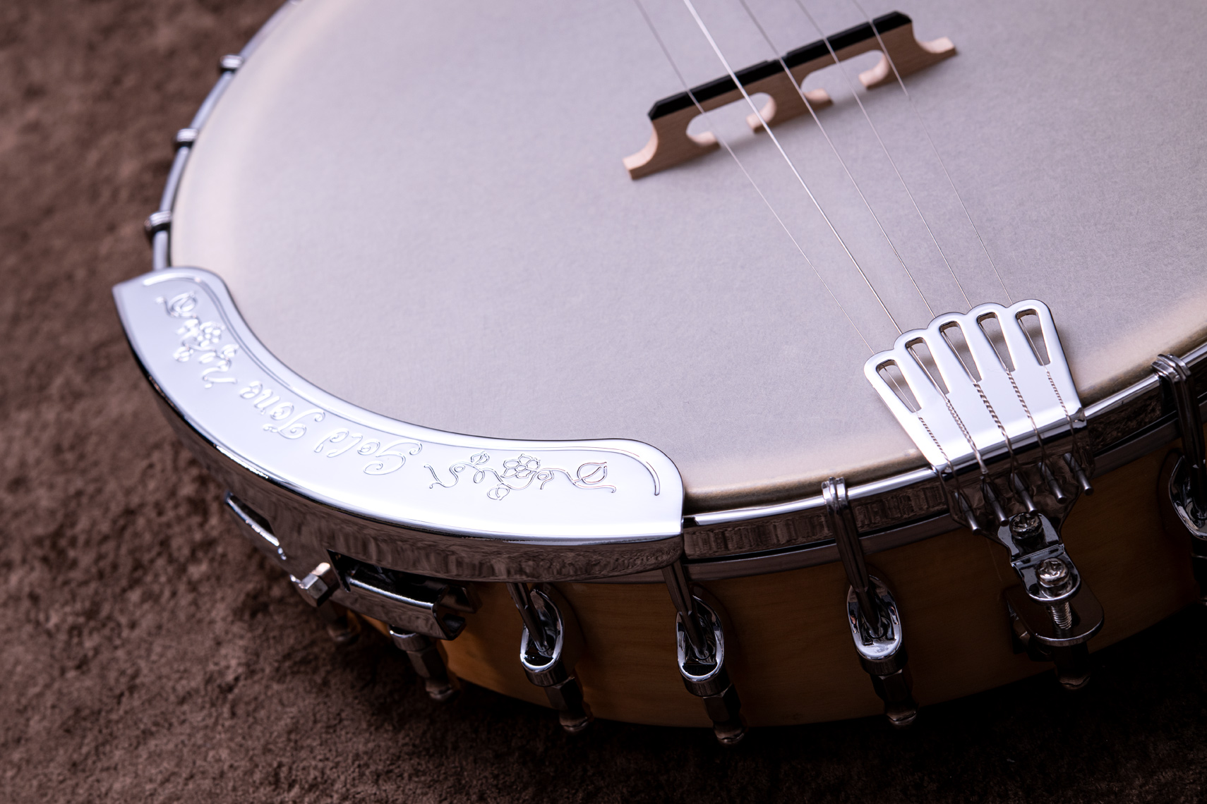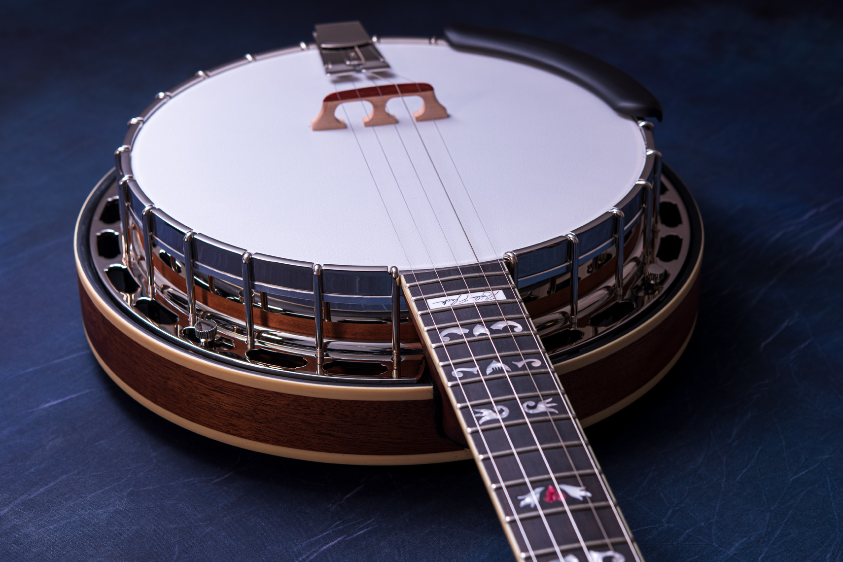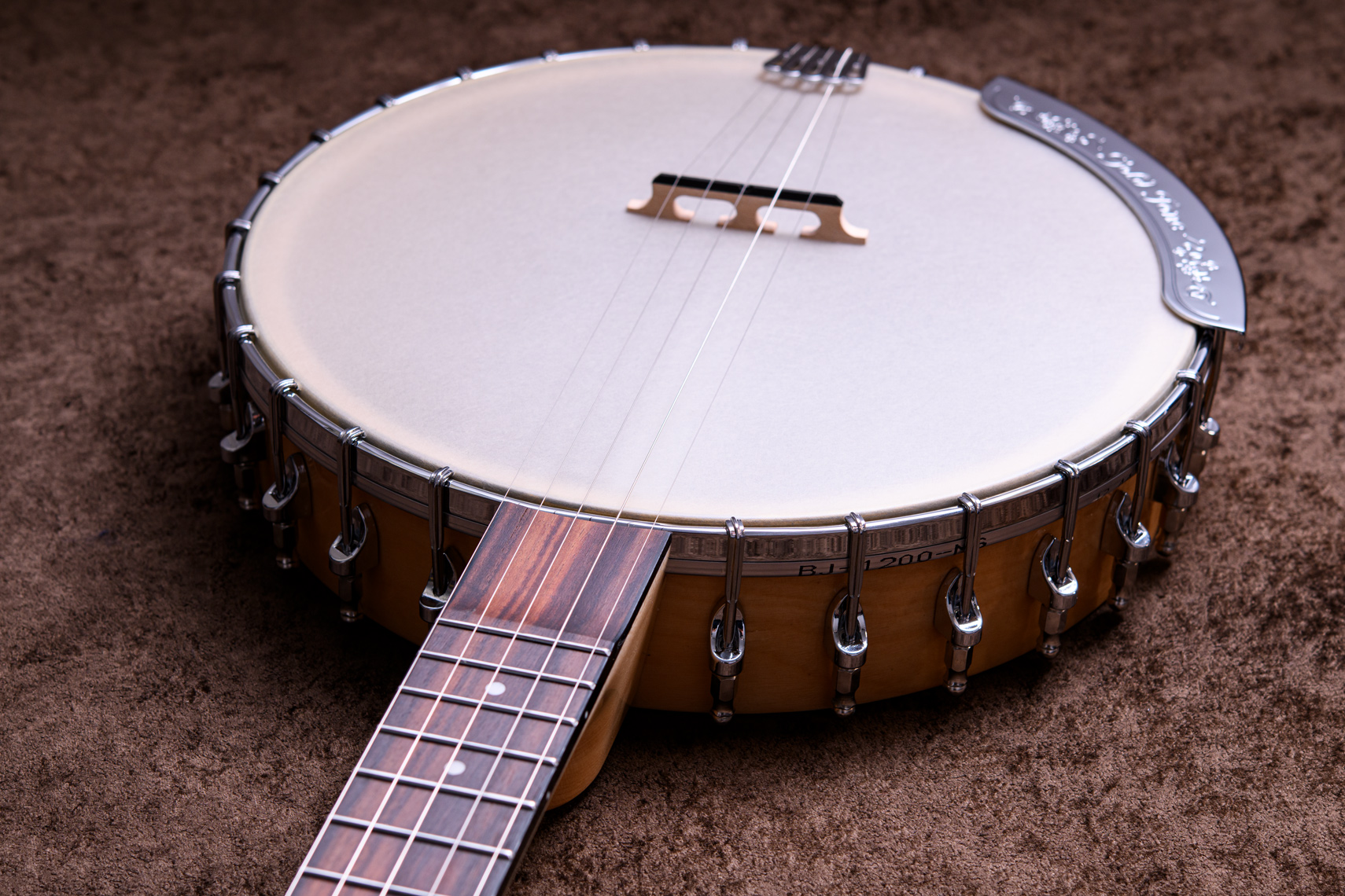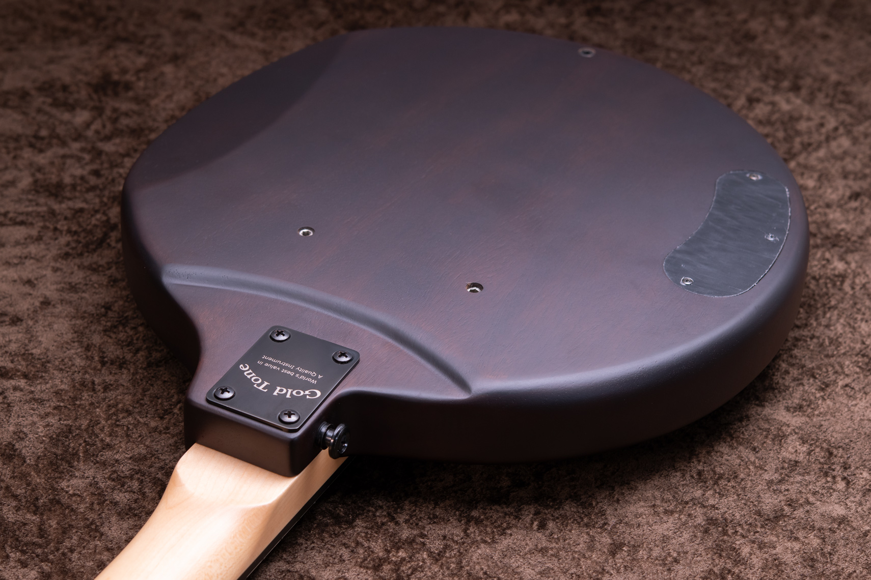 ペグには Rickard Cyclone チューナーがセレクトされており、10:1レシオの高精度なチューニングが可能です。ペグボタンは真鍮製になっており、ネック全体の重量を持たせることで独特の中低音と比較的ずっしりとした、あの独特なのサウンドを生み出しています。ネックの仕込み角度に至るまで、Bela のバンジョーを徹底的にセットアップに至るまで追求したプロフェッショナル仕様のバンジョーです。