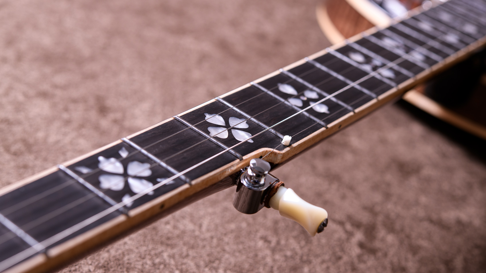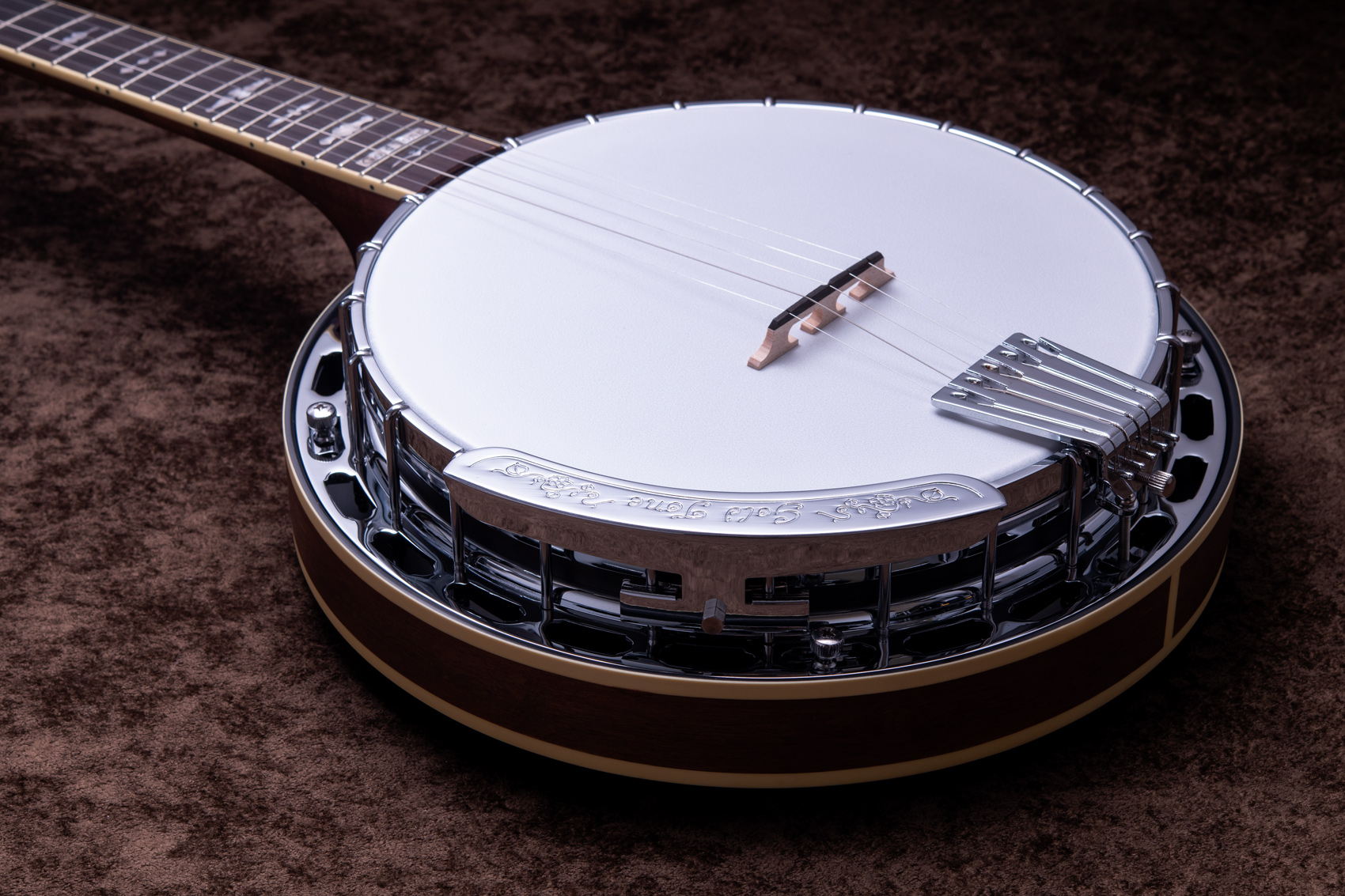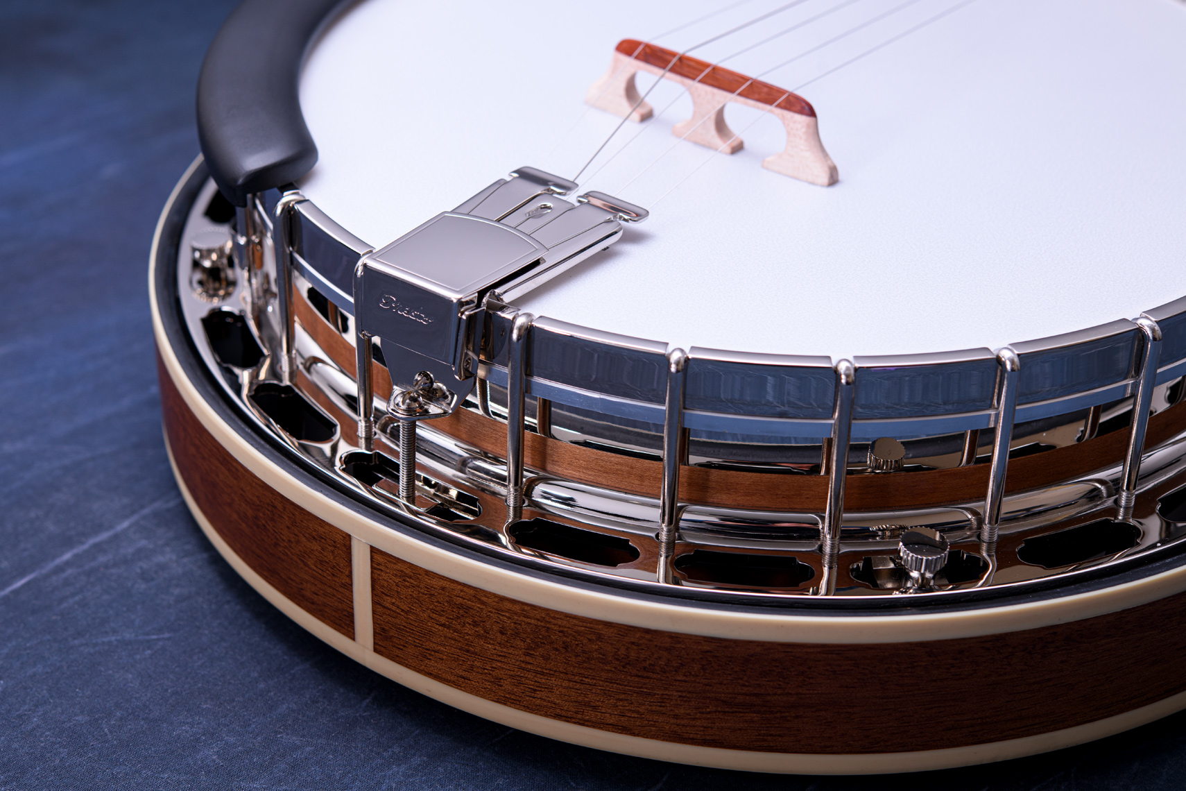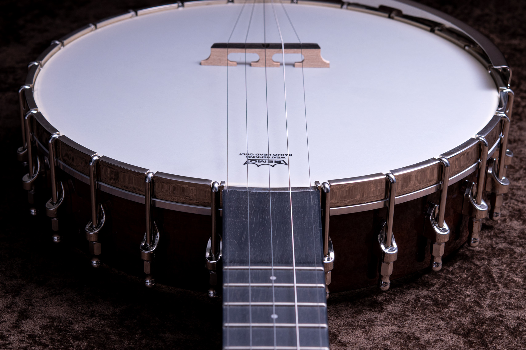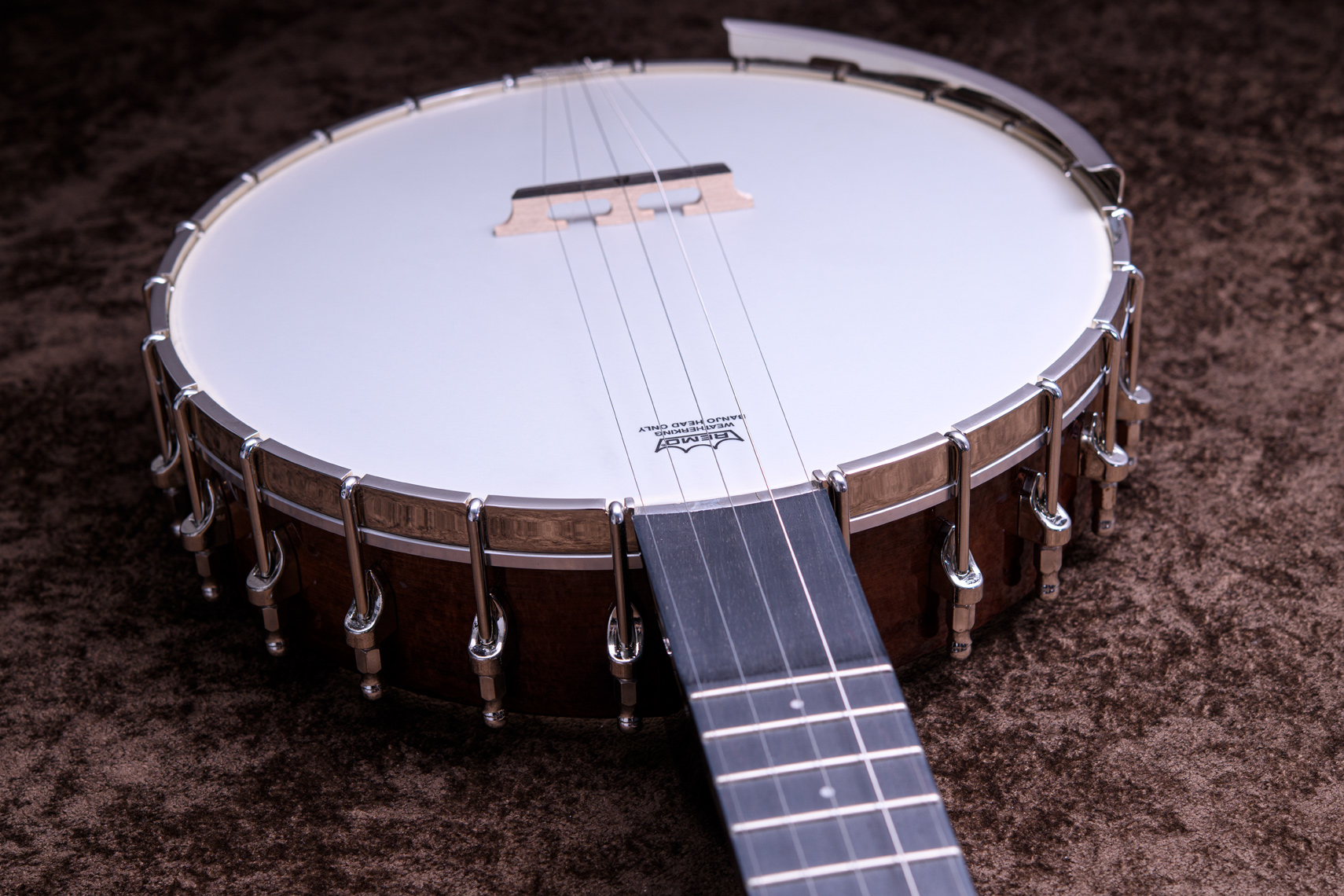 ペグには Rickard Cyclone チューナーがセレクトされており、10:1レシオの高精度なチューニングが可能です。ペグボタンは真鍮製になっており、ネック全体の重量を持たせることで独特の中低音と比較的ずっしりとした、あの独特なのサウンドを生み出しています。ネックの仕込み角度に至るまで、Bela のバンジョーを徹底的にセットアップに至るまで追求したプロフェッショナル仕様のバンジョーです。