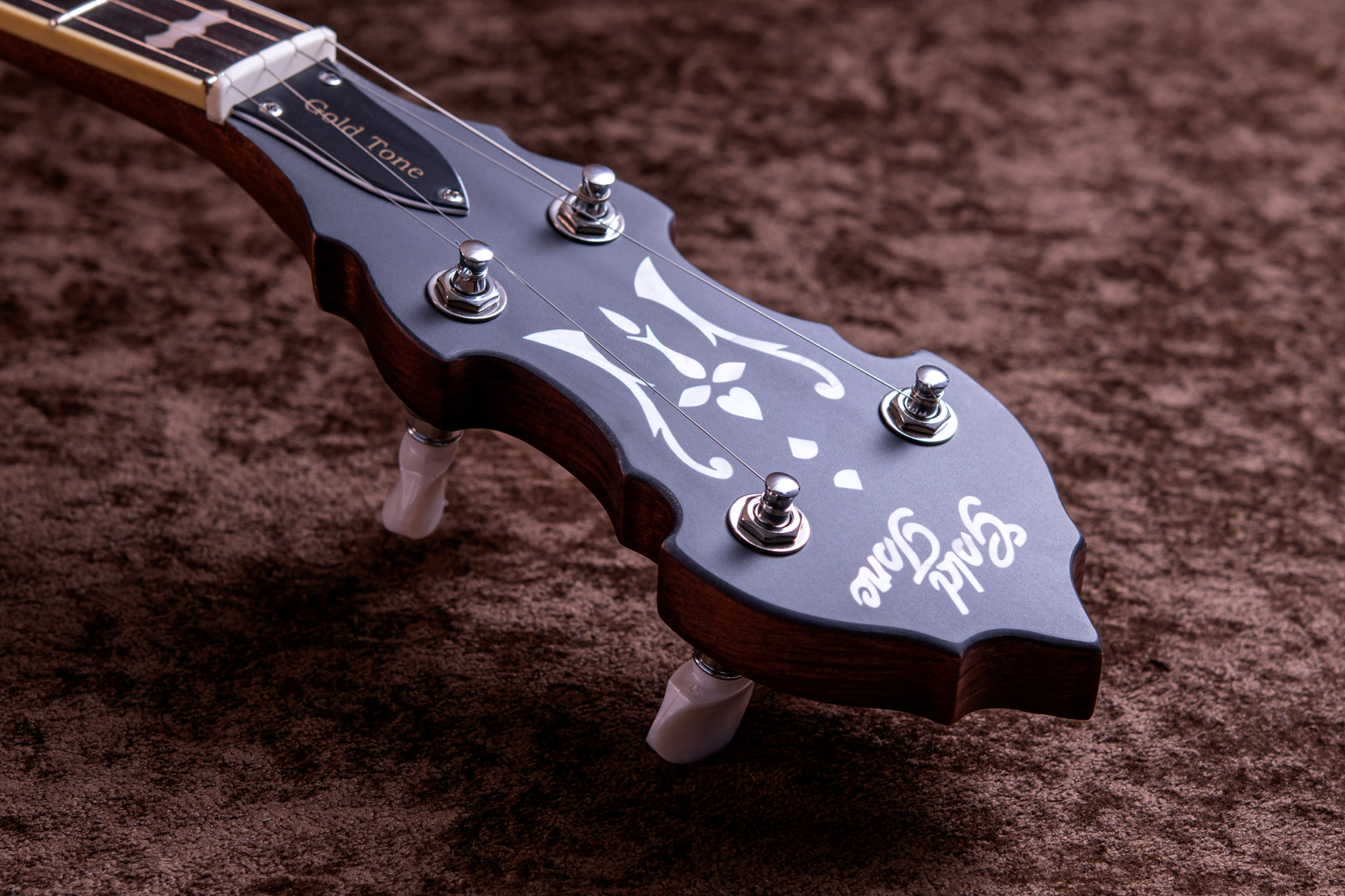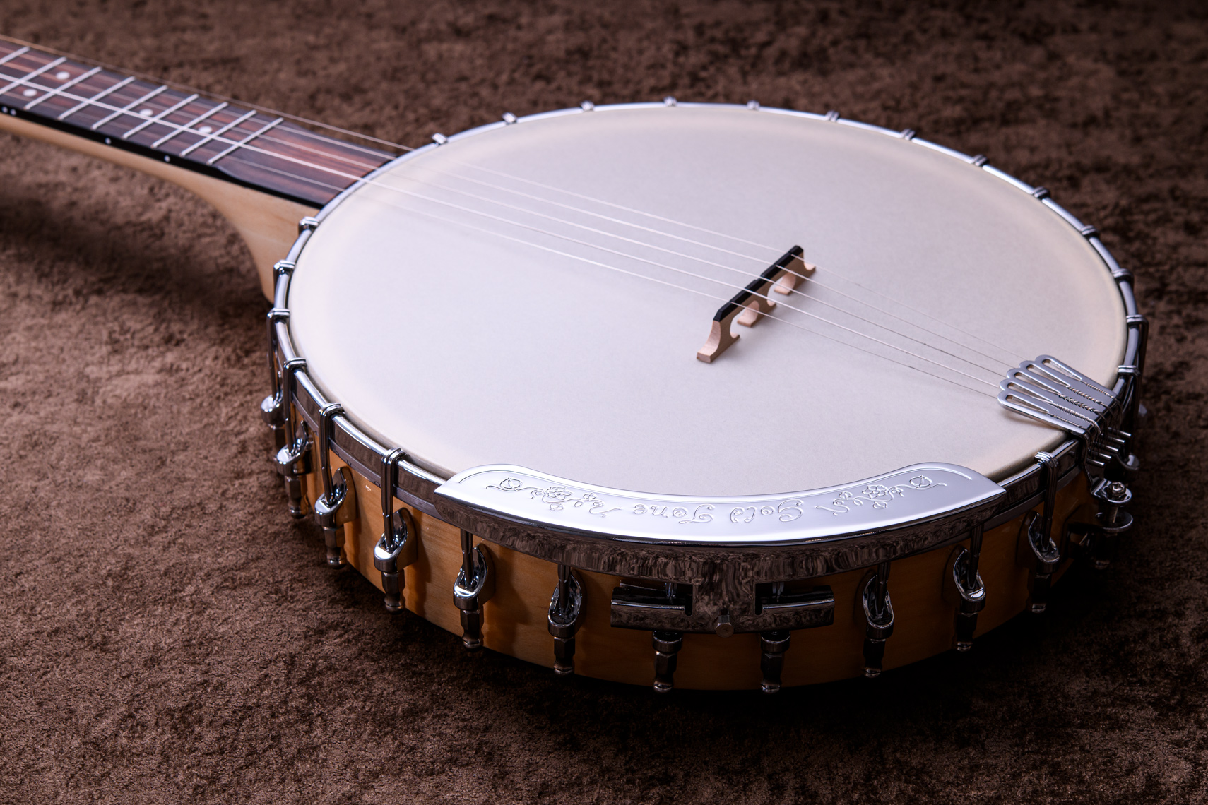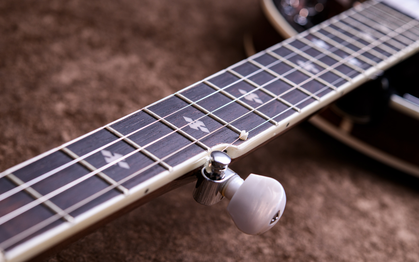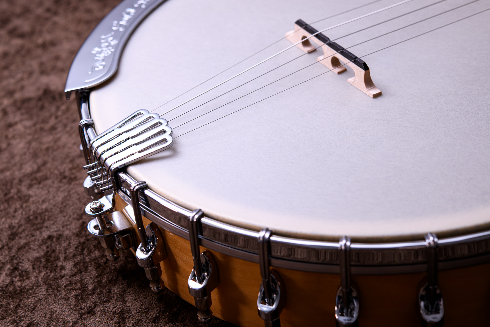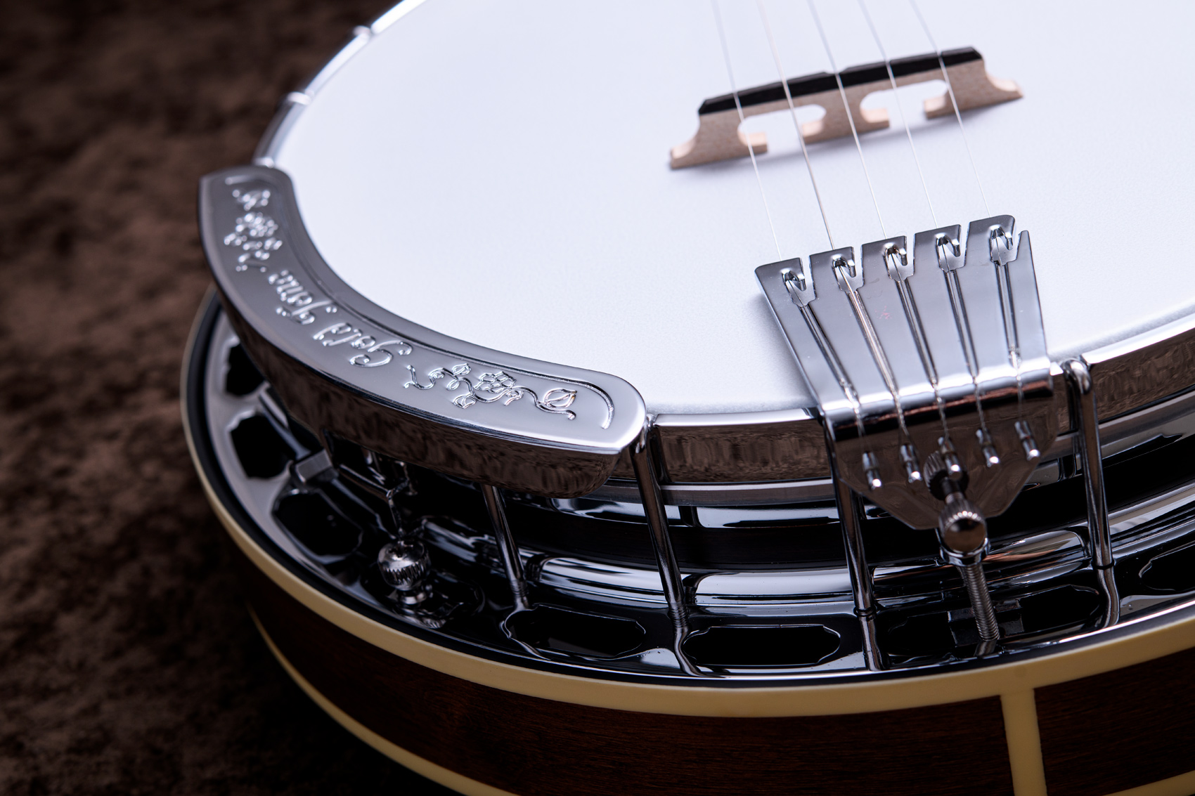 ペグには Rickard Cyclone チューナーがセレクトされており、10:1レシオの高精度なチューニングが可能です。ペグボタンは真鍮製になっており、ネック全体の重量を持たせることで独特の中低音と比較的ずっしりとした、あの独特なのサウンドを生み出しています。ネックの仕込み角度に至るまで、Bela のバンジョーを徹底的にセットアップに至るまで追求したプロフェッショナル仕様のバンジョーです。