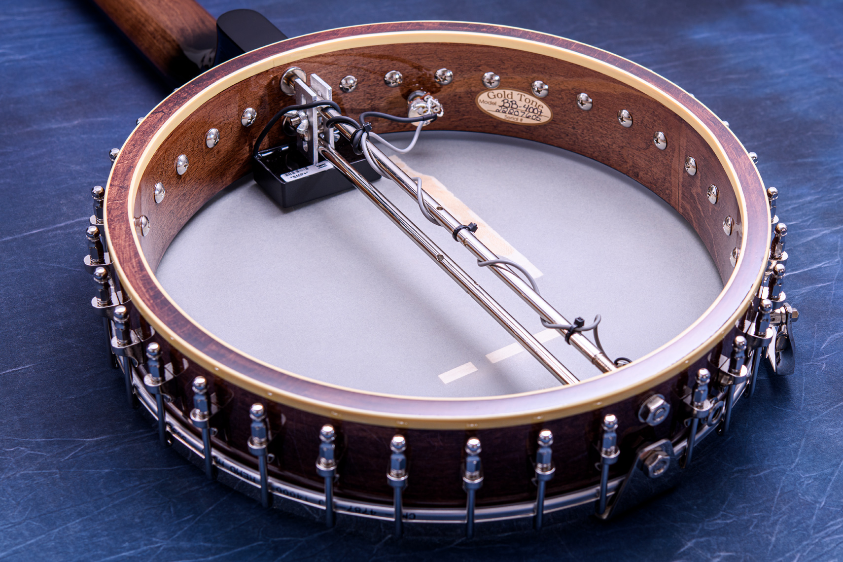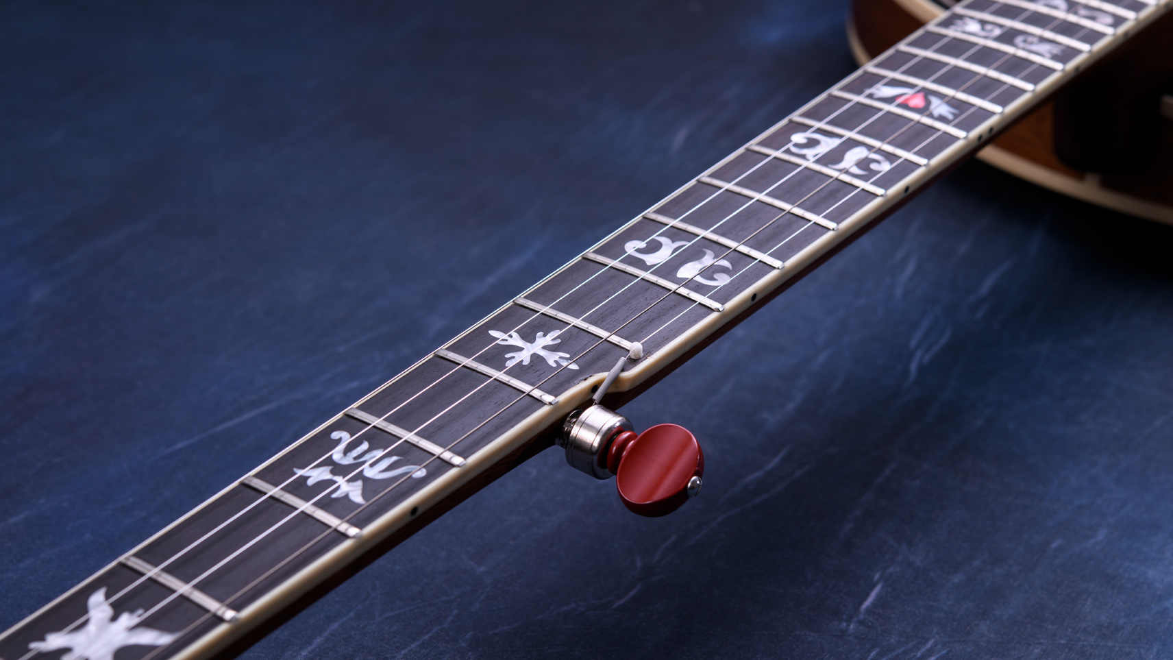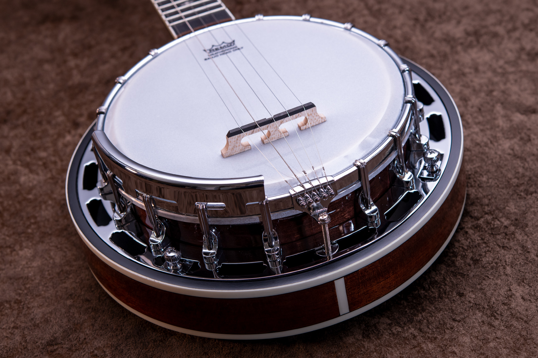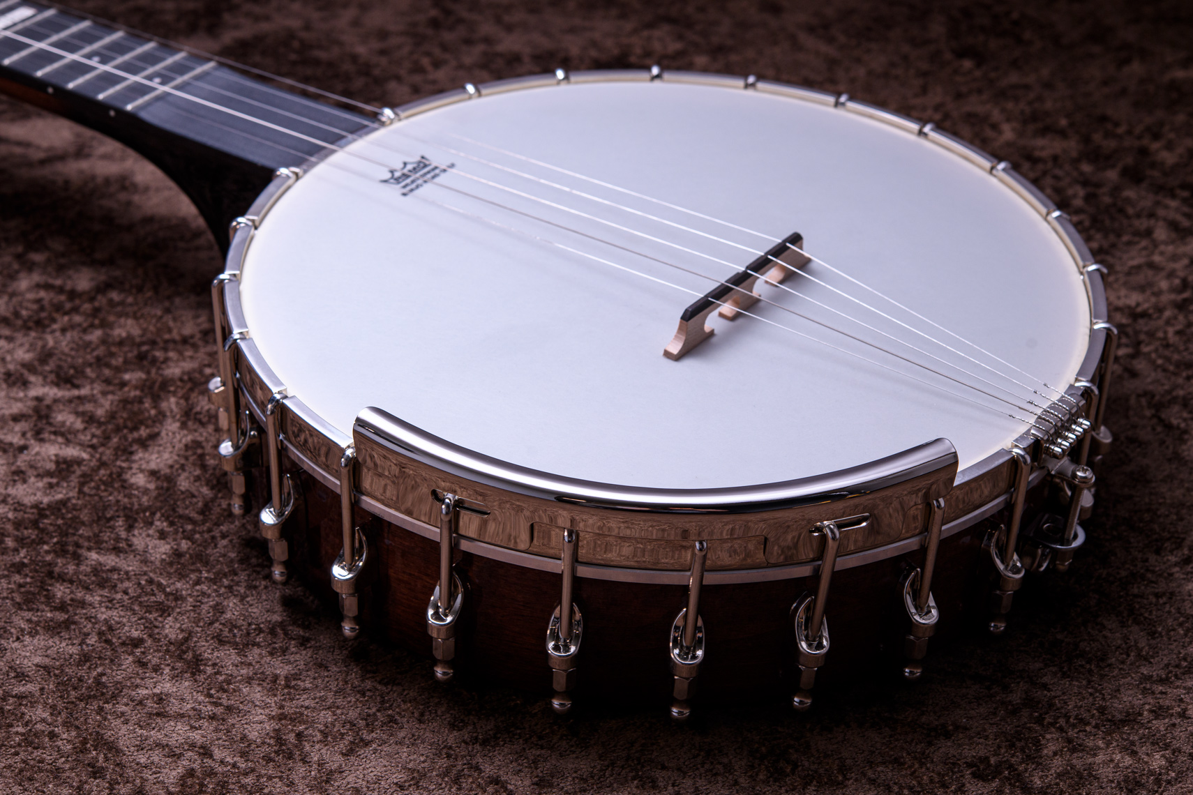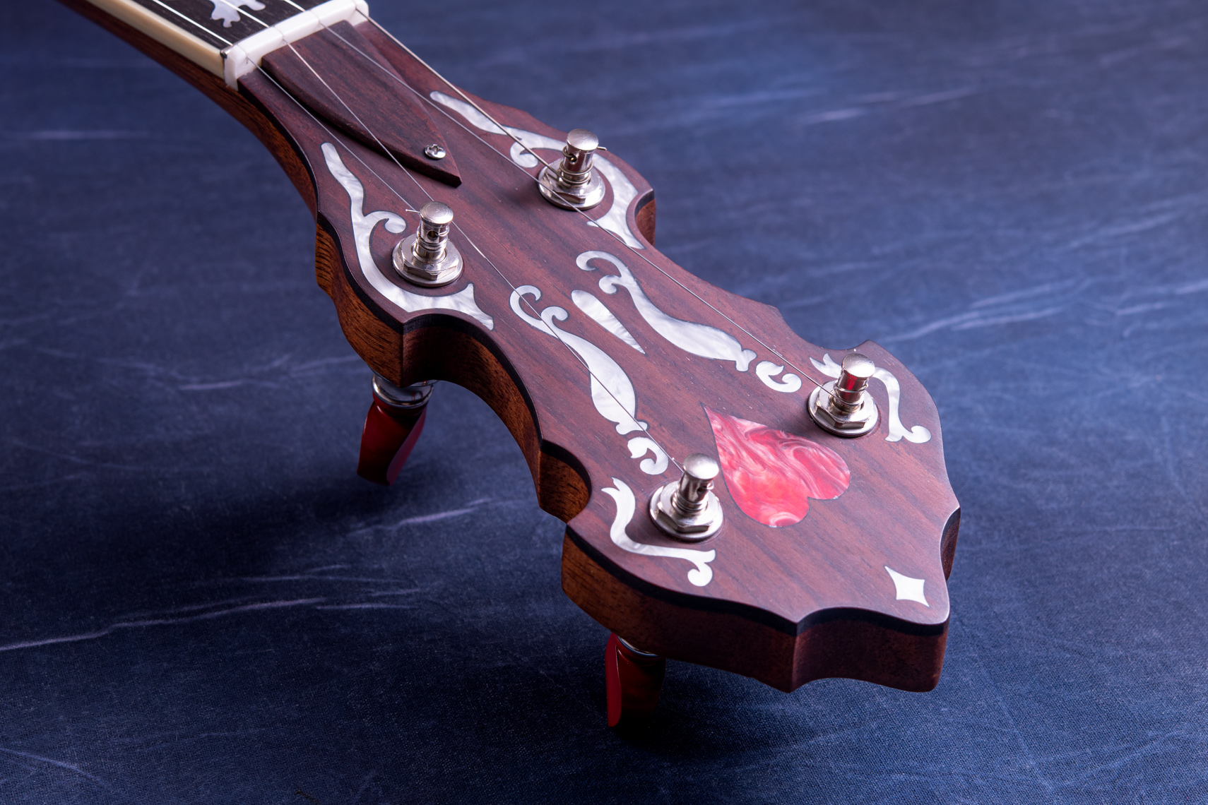 ペグには Rickard Cyclone チューナーがセレクトされており、10:1レシオの高精度なチューニングが可能です。ペグボタンは真鍮製になっており、ネック全体の重量を持たせることで独特の中低音と比較的ずっしりとした、あの独特なのサウンドを生み出しています。ネックの仕込み角度に至るまで、Bela のバンジョーを徹底的にセットアップに至るまで追求したプロフェッショナル仕様のバンジョーです。