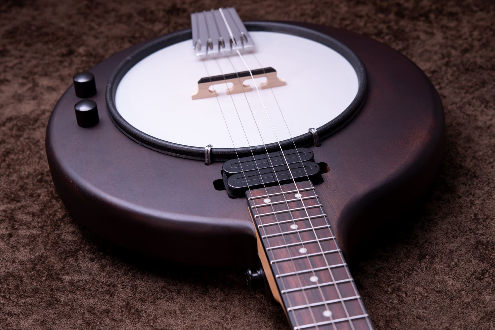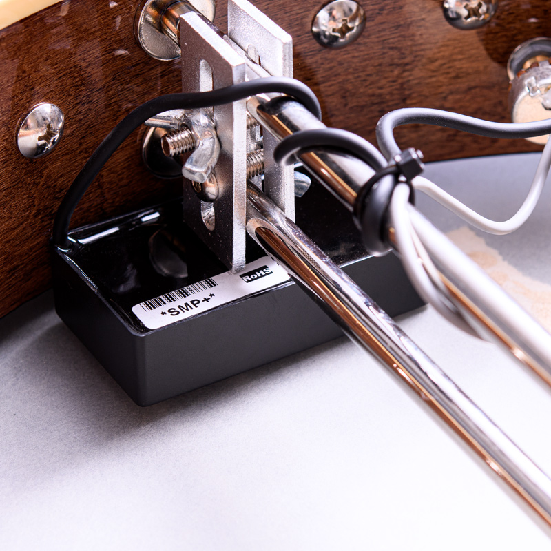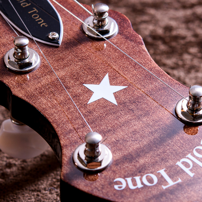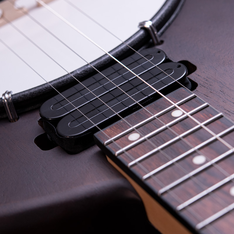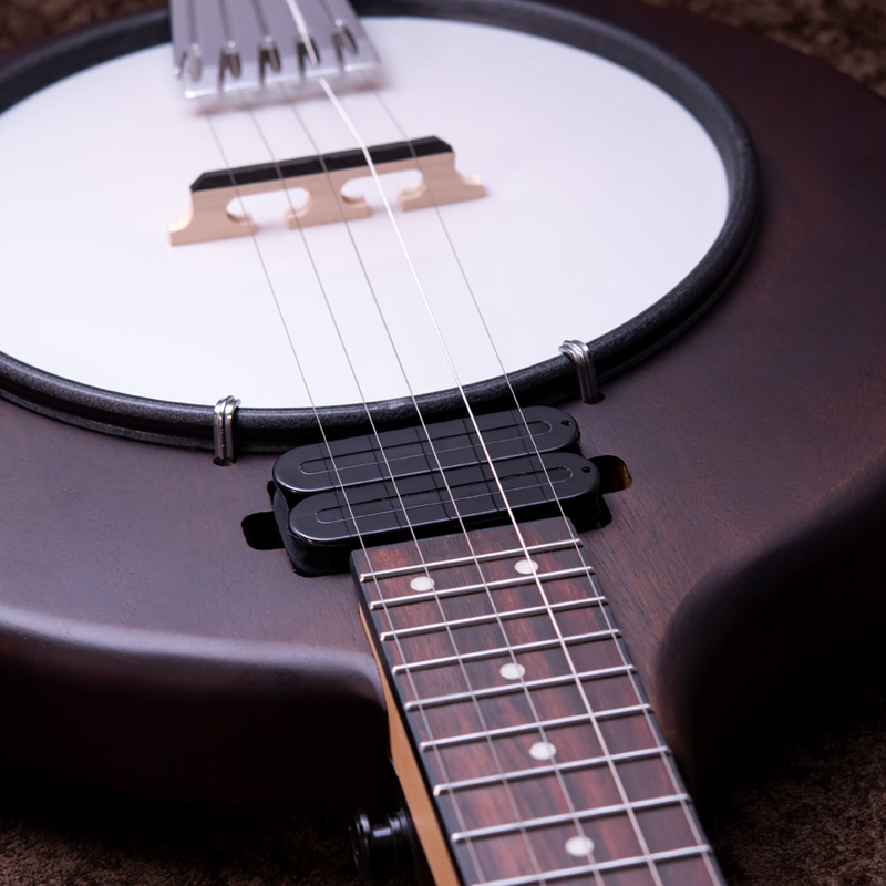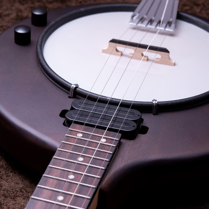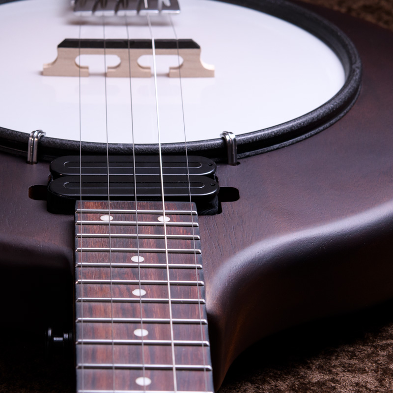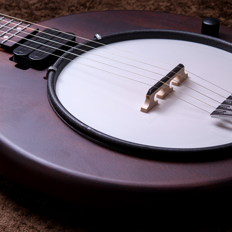 マホガニーリゾネーター、カナディアンメイプル3プライリム、キャスト1ピースフランジ、ベルブロンズノーホールフラットヘッドトーンリングといった仕様のポットに専用ブリッジ、Prucha製テールピース、Little Mountain スタイルアームレストといったセレクトされたハードウェアを採用しています。