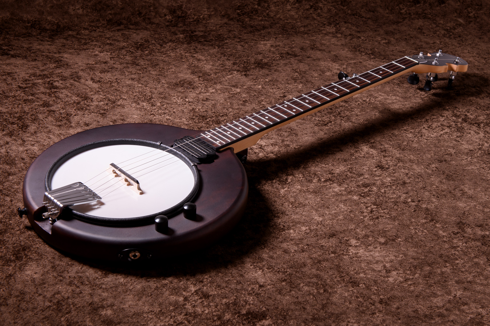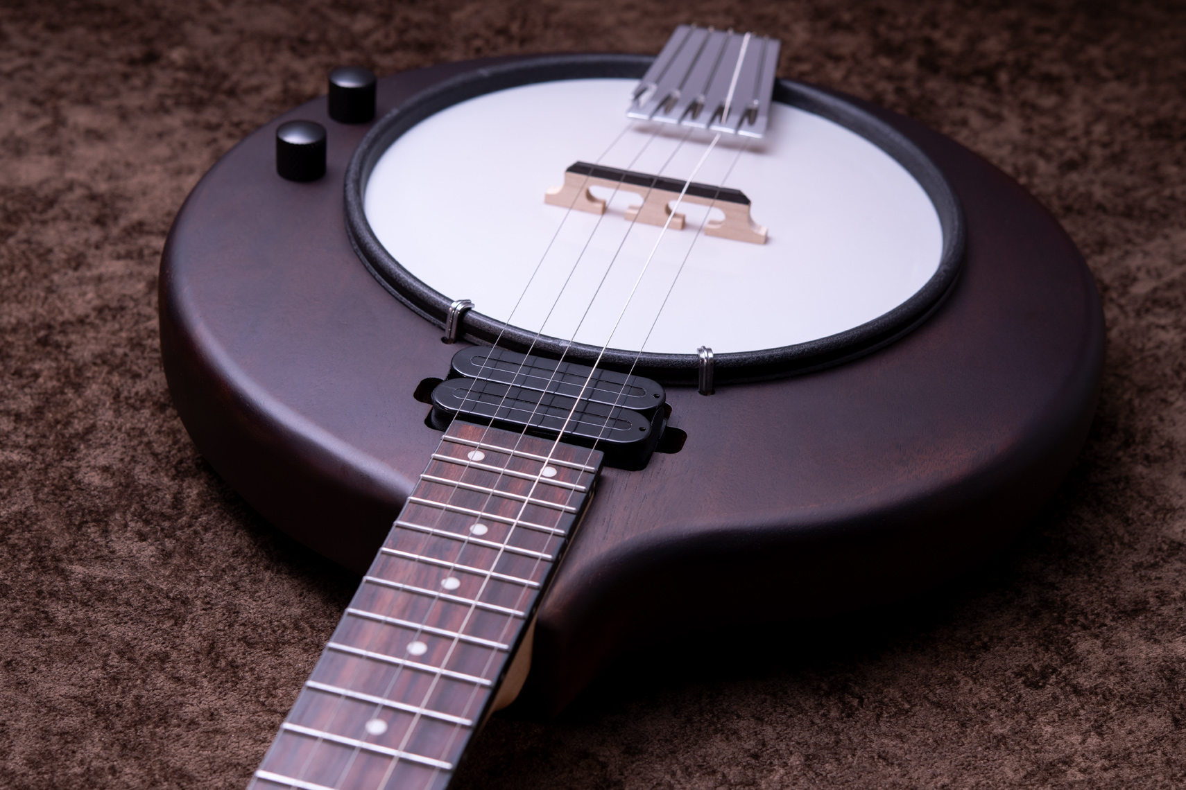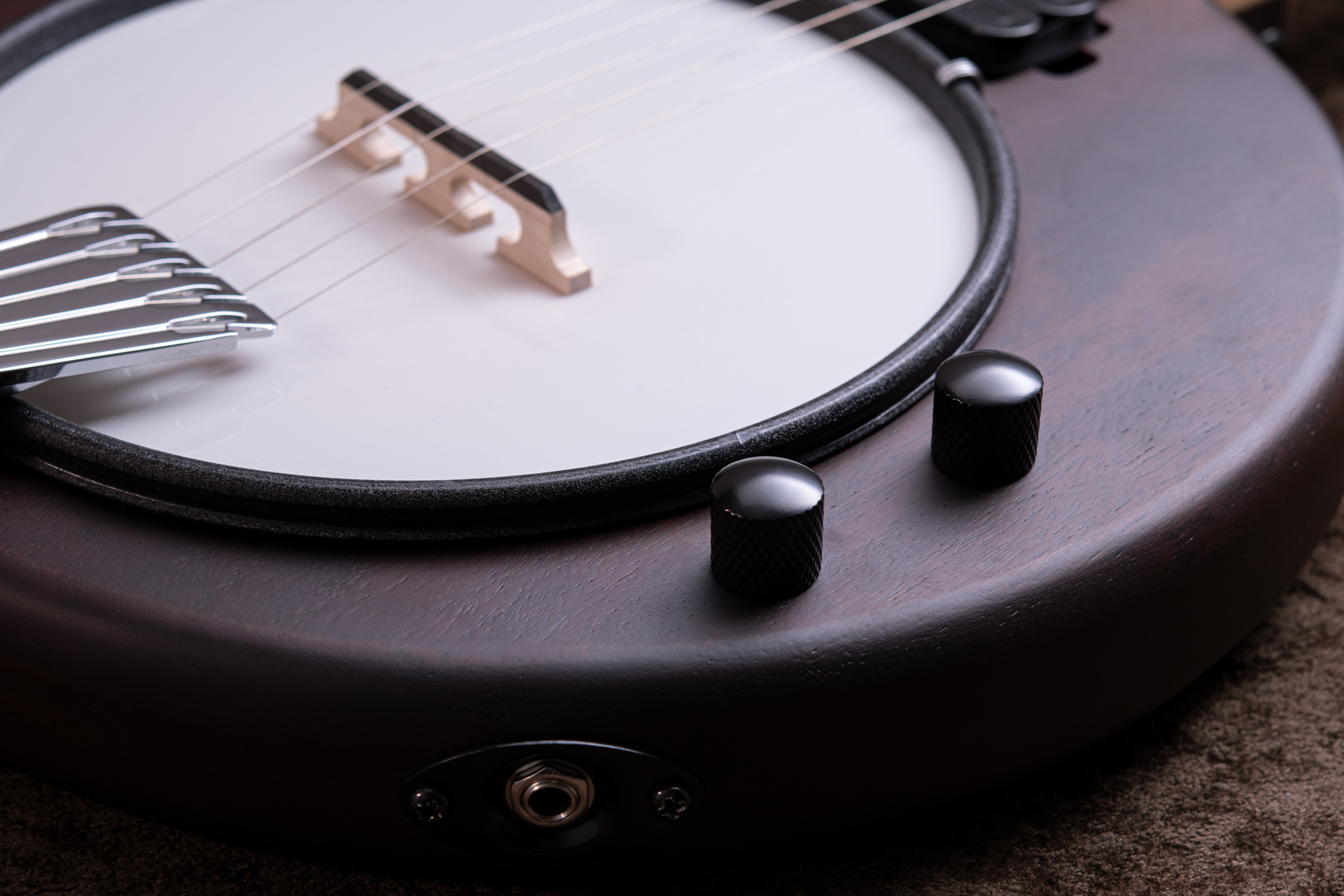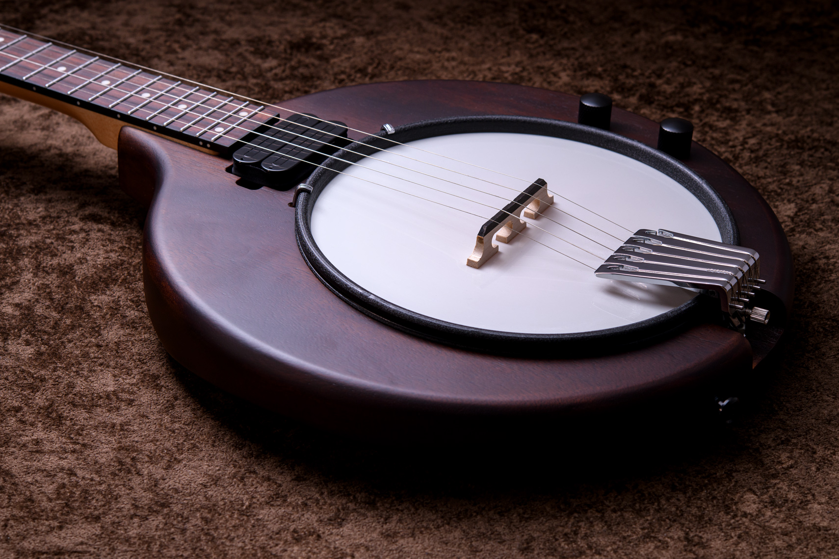 マホガニーリゾネーター、カナディアンメイプル3プライリム、キャスト1ピースフランジ、ベルブロンズノーホールフラットヘッドトーンリングといった仕様のポットに専用ブリッジ、Prucha製テールピース、Little Mountain スタイルアームレストといったセレクトされたハードウェアを採用しています。